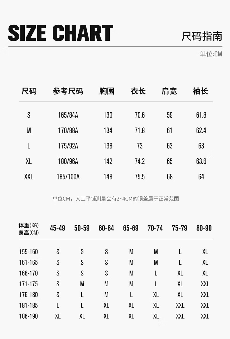 China (cm) 165 / 88-90 170 / 96-98 175 / 108-110 180 / 118-122 185 / 126-130