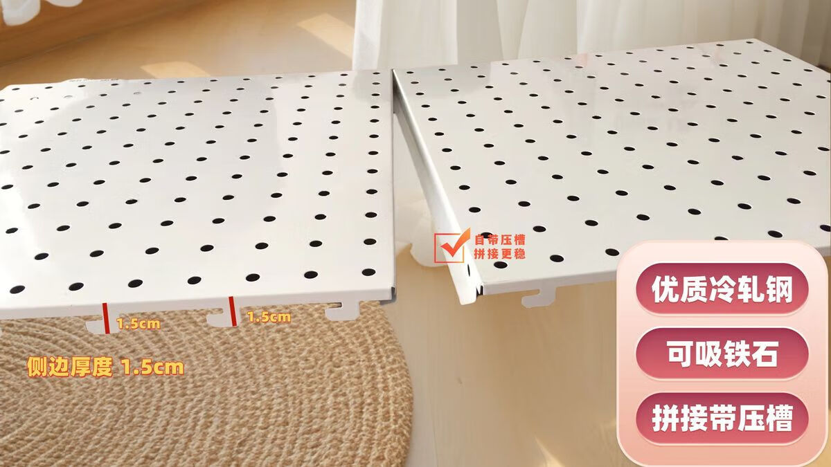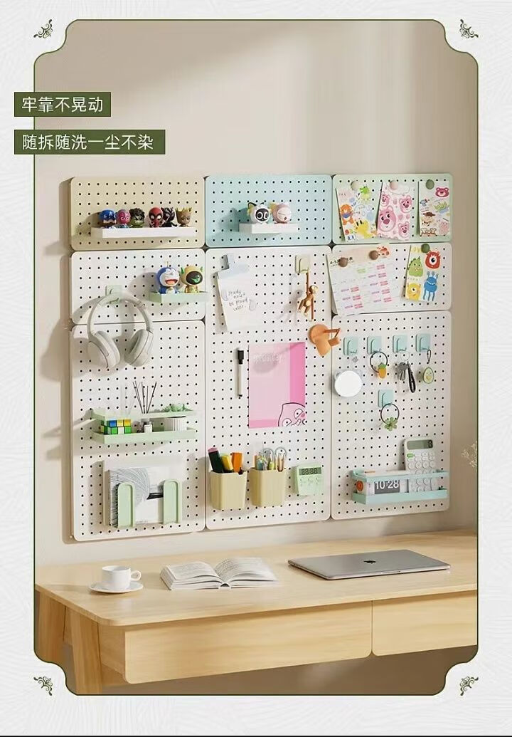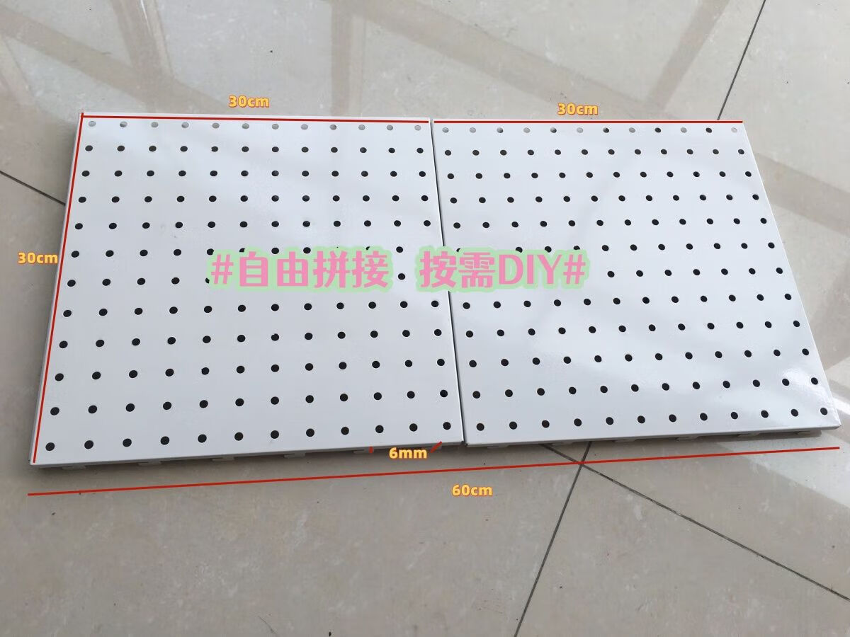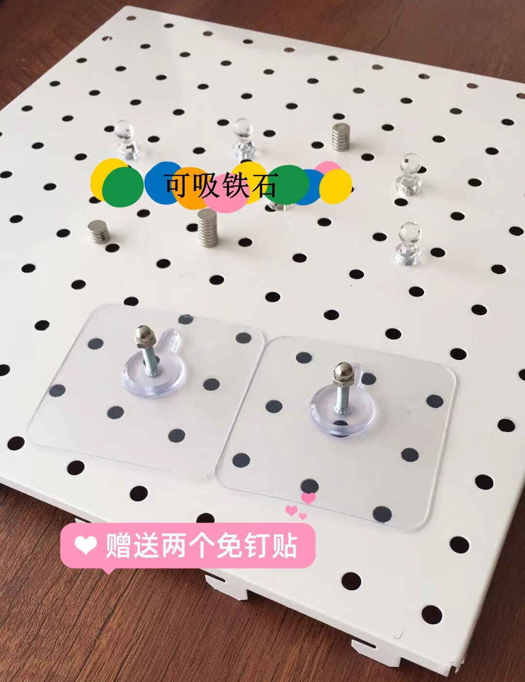 Perforated board iron magnet can be attached to the wall, desk storage, jewelry, stationery, millet badge display stand, round hole thickening, one 30*40cm white perforated board, free nail-free stickers included. Each perforated board comes with two