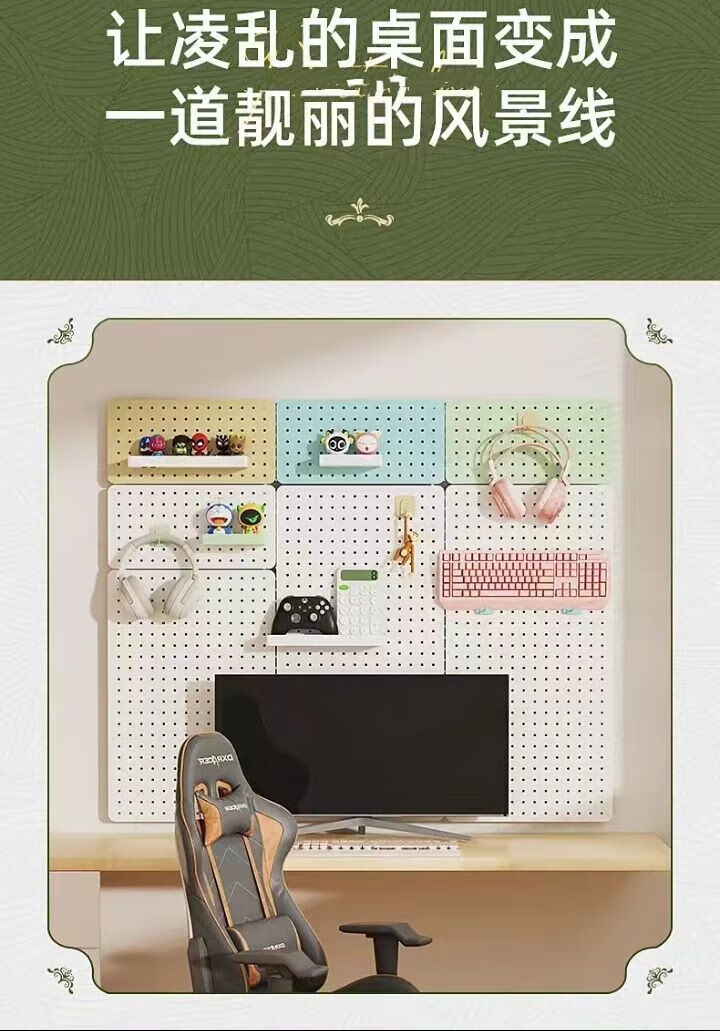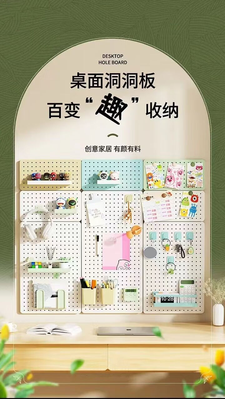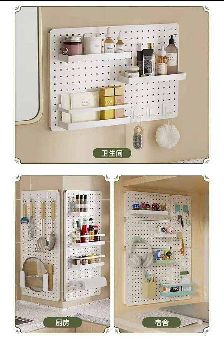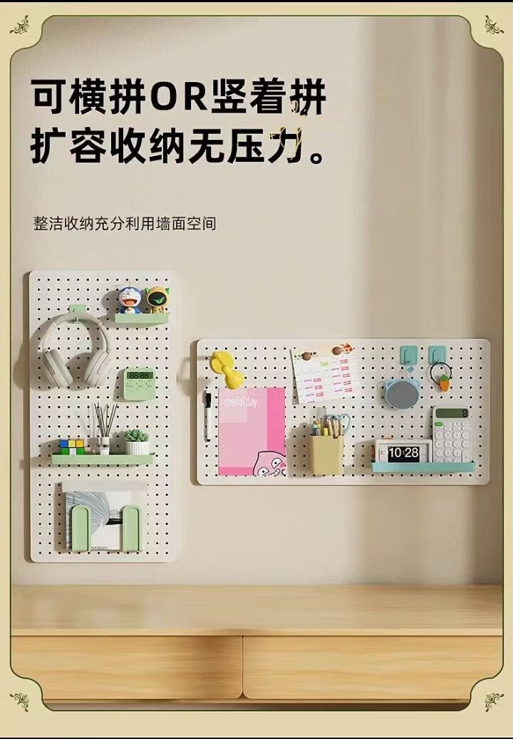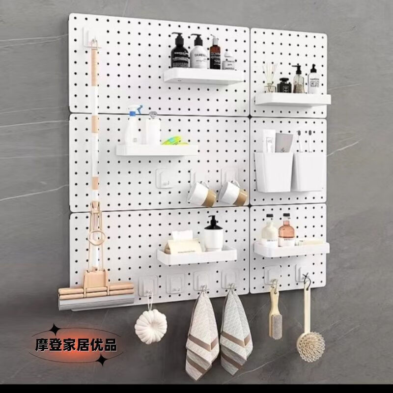 Perforated board iron magnet can be attached to the wall, desk storage, jewelry, stationery, millet badge display stand, round hole thickening, one 30*40cm white perforated board, free nail-free stickers included. Each perforated board comes with two