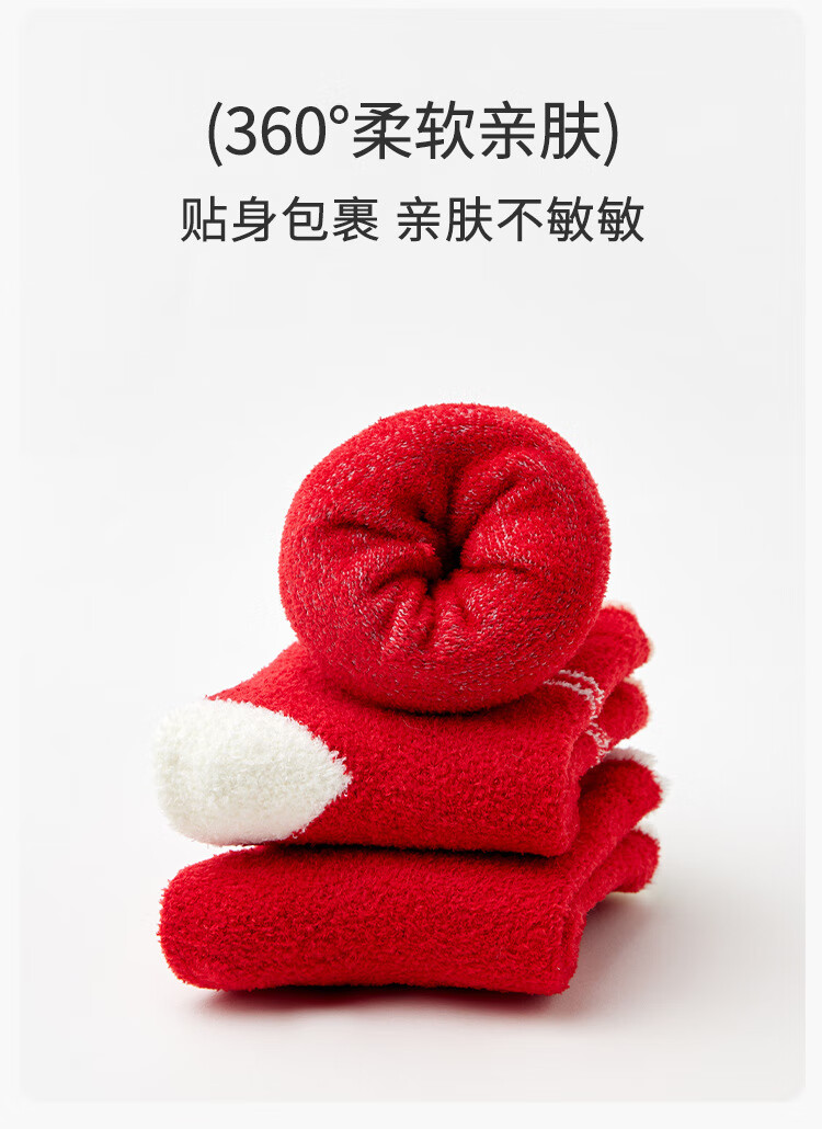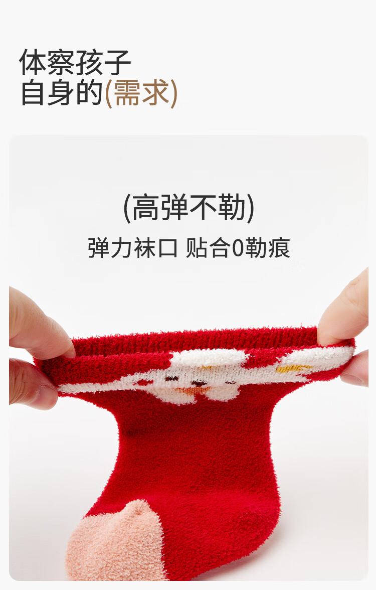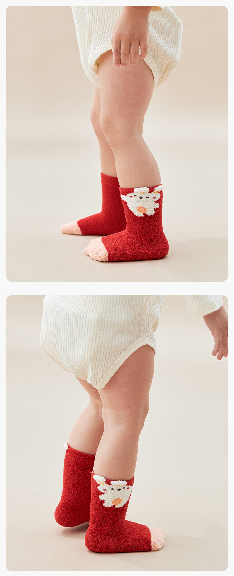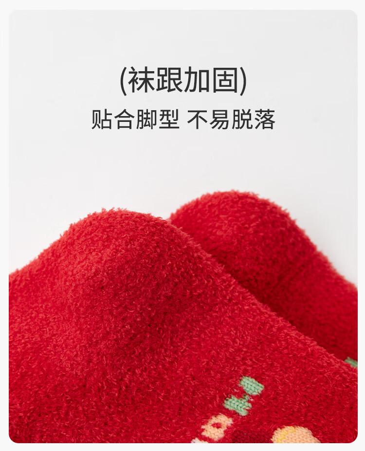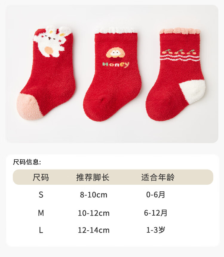 秋冬新款加绒加厚宝宝袜子新年袜子新生儿婴儿无骨袜大红袜儿童袜 B5075哈尼小兔三双装 0-6月 S码袜底长8cm(0-6个月)