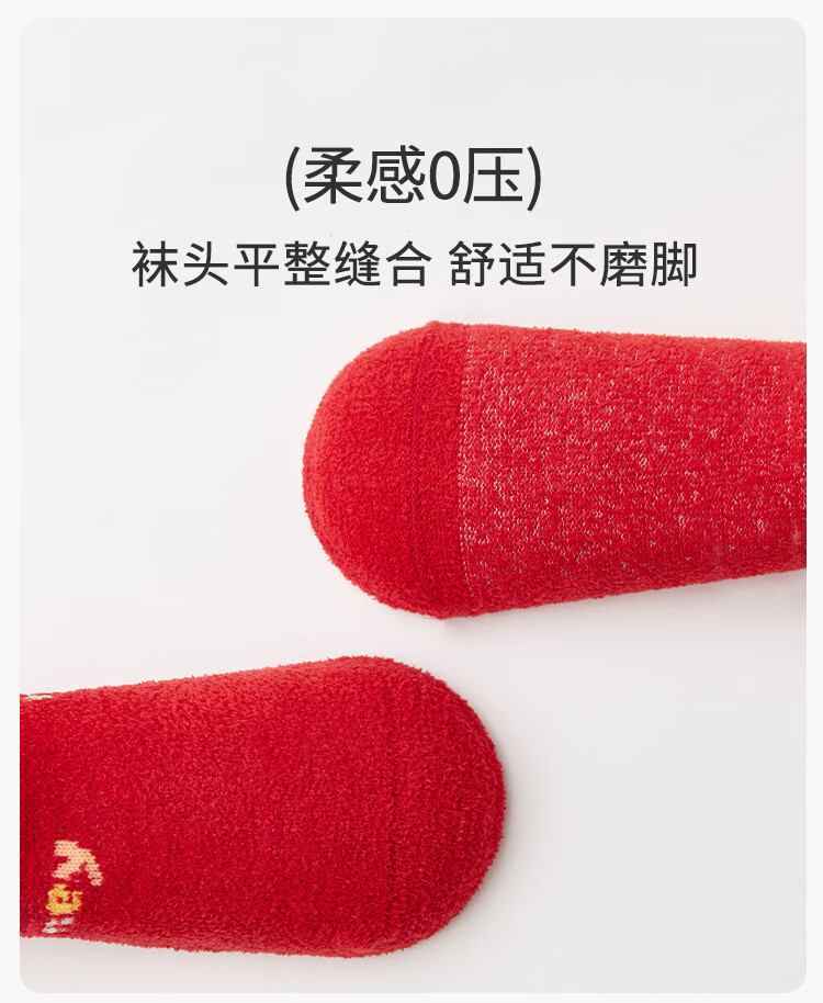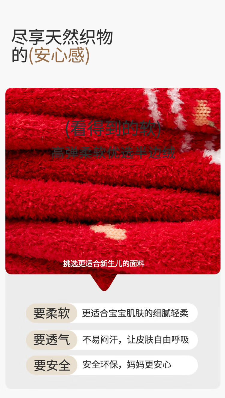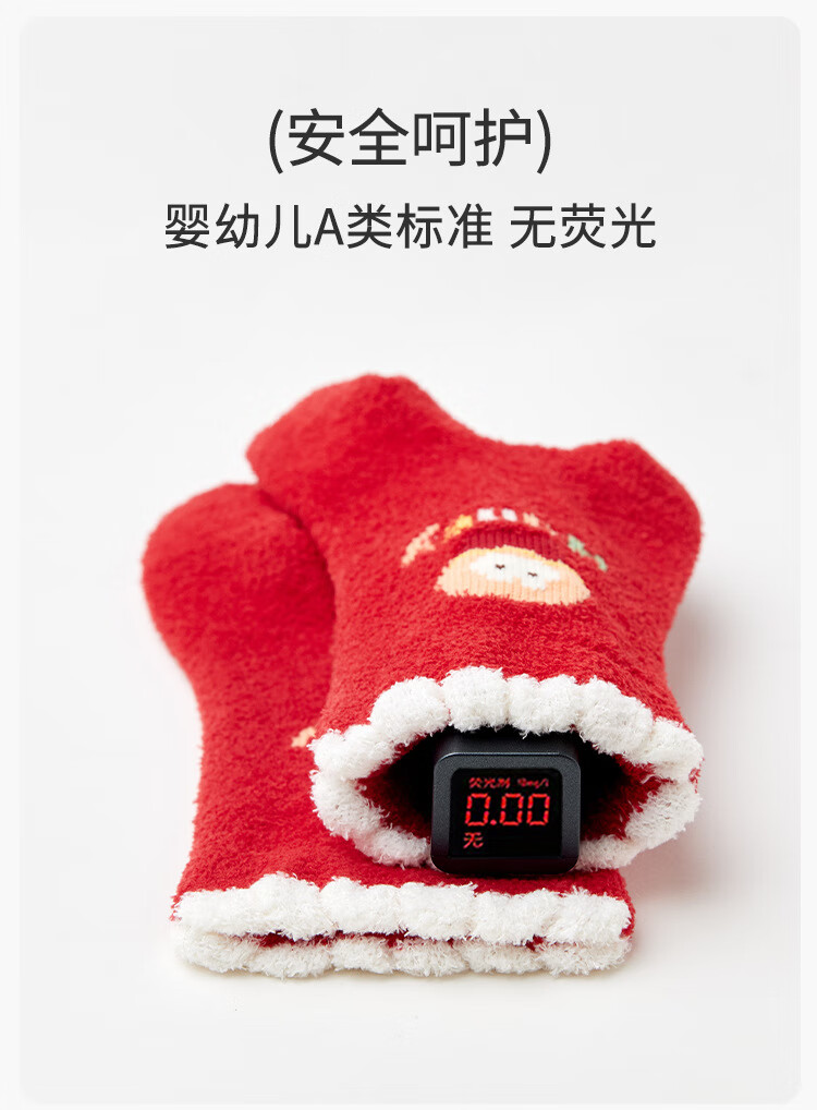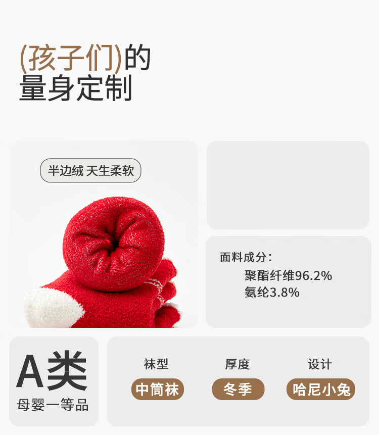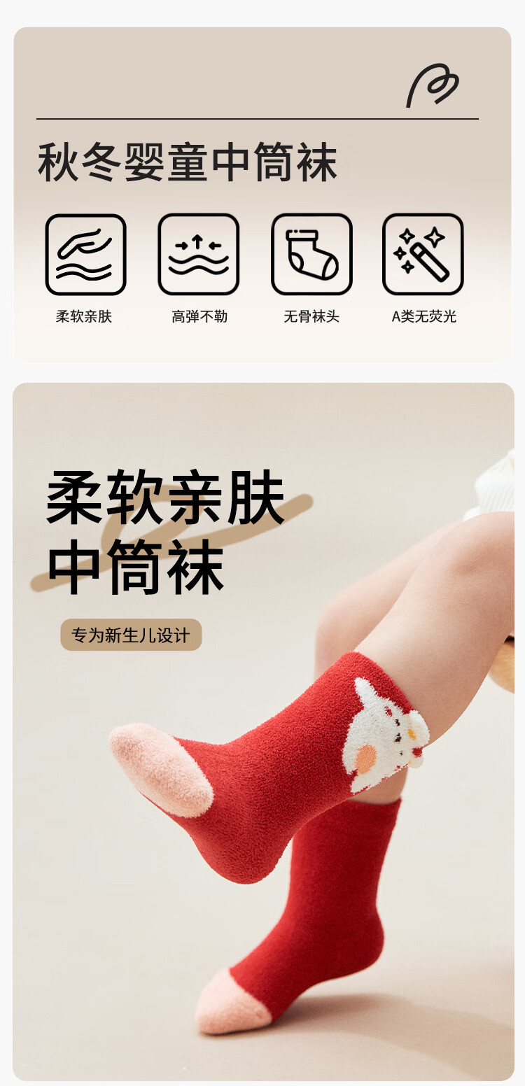 秋冬新款加绒加厚宝宝袜子新年袜子新生儿婴儿无骨袜大红袜儿童袜 B5075哈尼小兔三双装 0-6月 S码袜底长8cm(0-6个月)