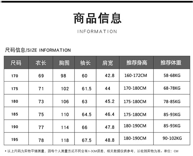 China (cm) 165 / 88-90 170 / 96-98 175 / 108-110 180 / 118-122 185 / 126-130