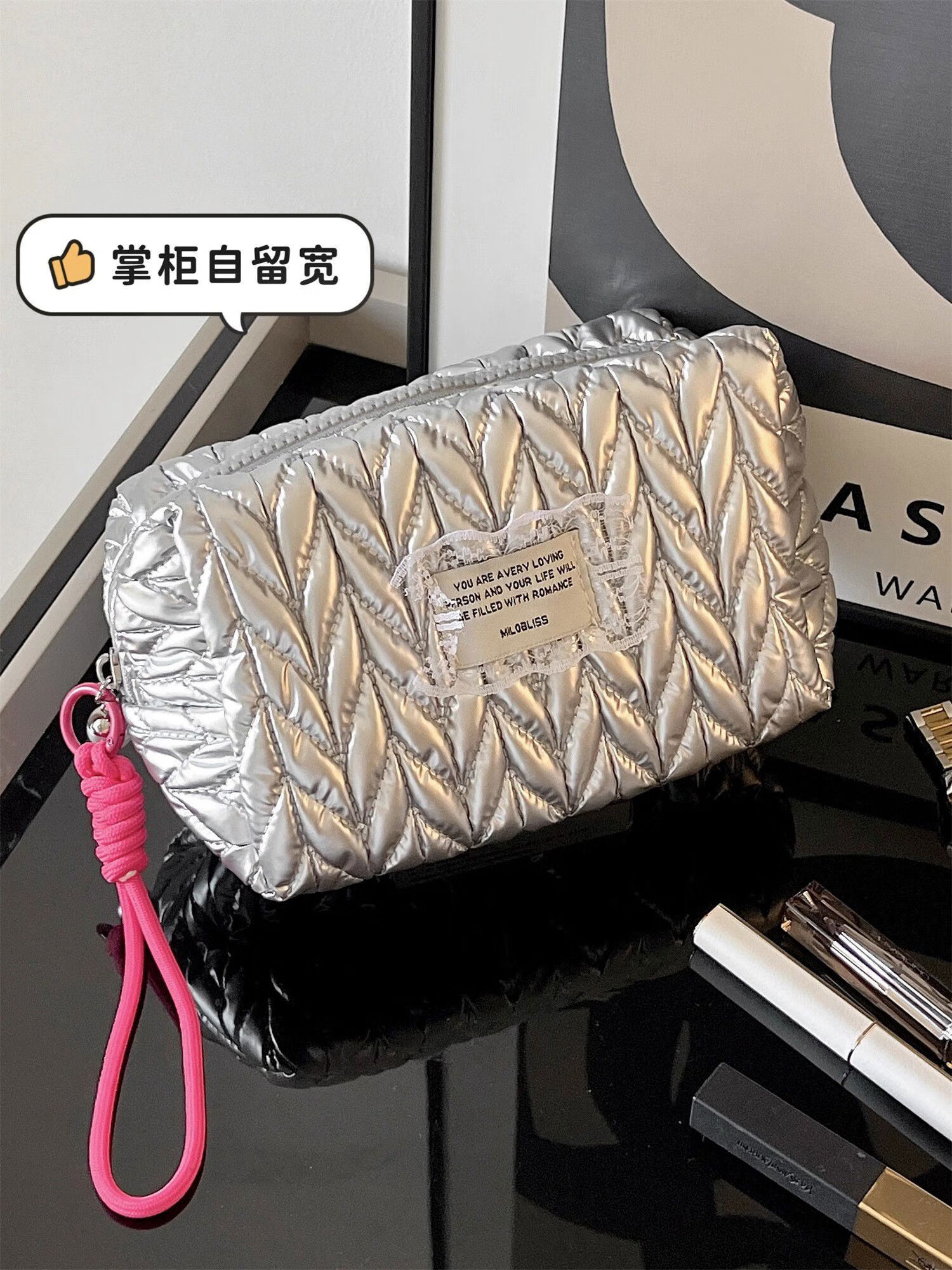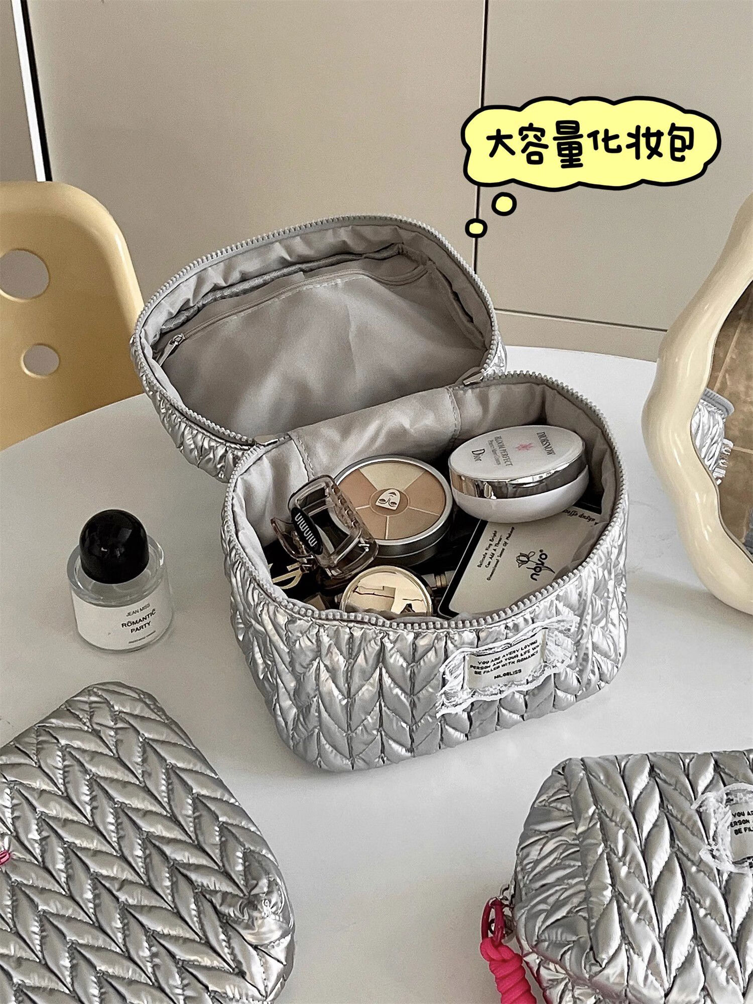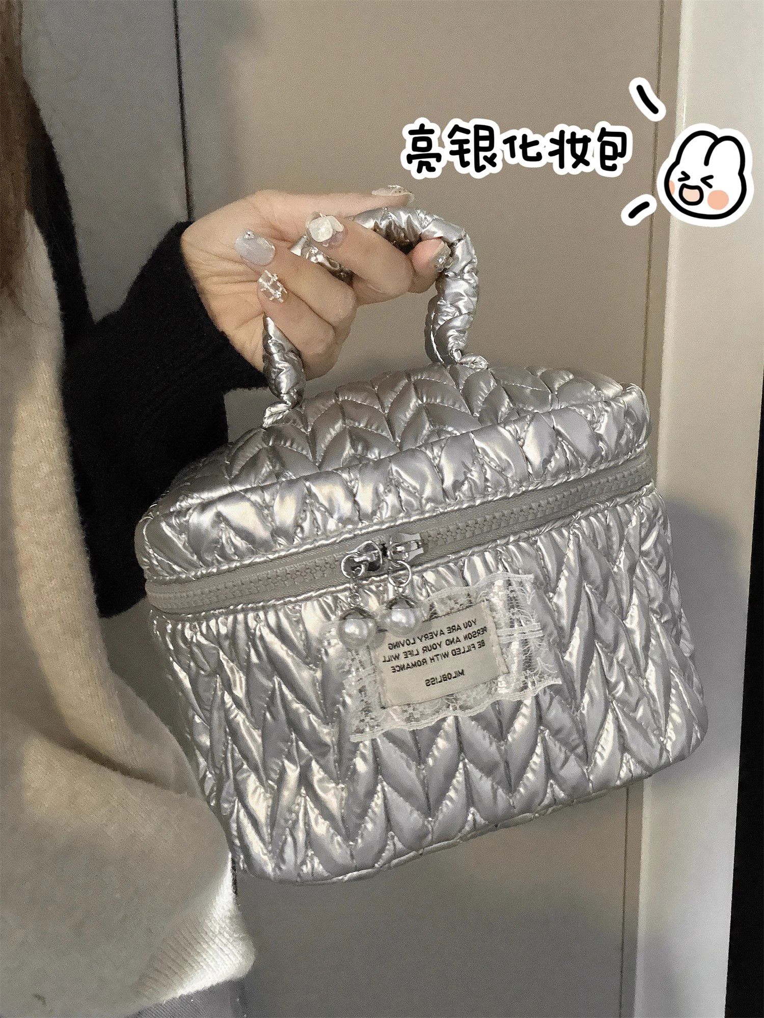 Yusenyi Cosmetic Bag Women's High-End Ins Style Cosmetic Storage Bag Large Capacity Portable Travel Toilet Bag Bright Silver Hand-Hex-Hexagonal Bag Wrinkle Fashionable