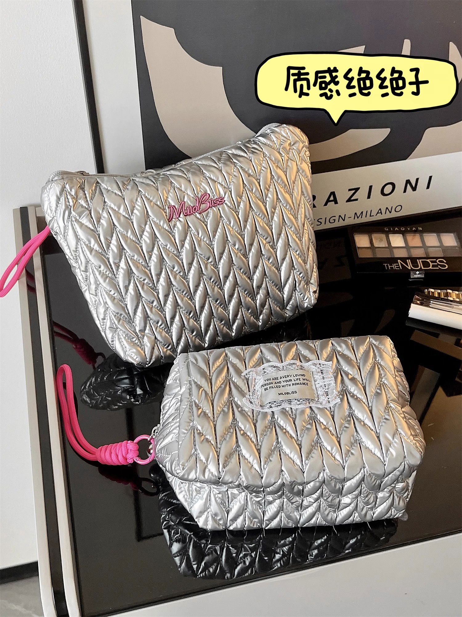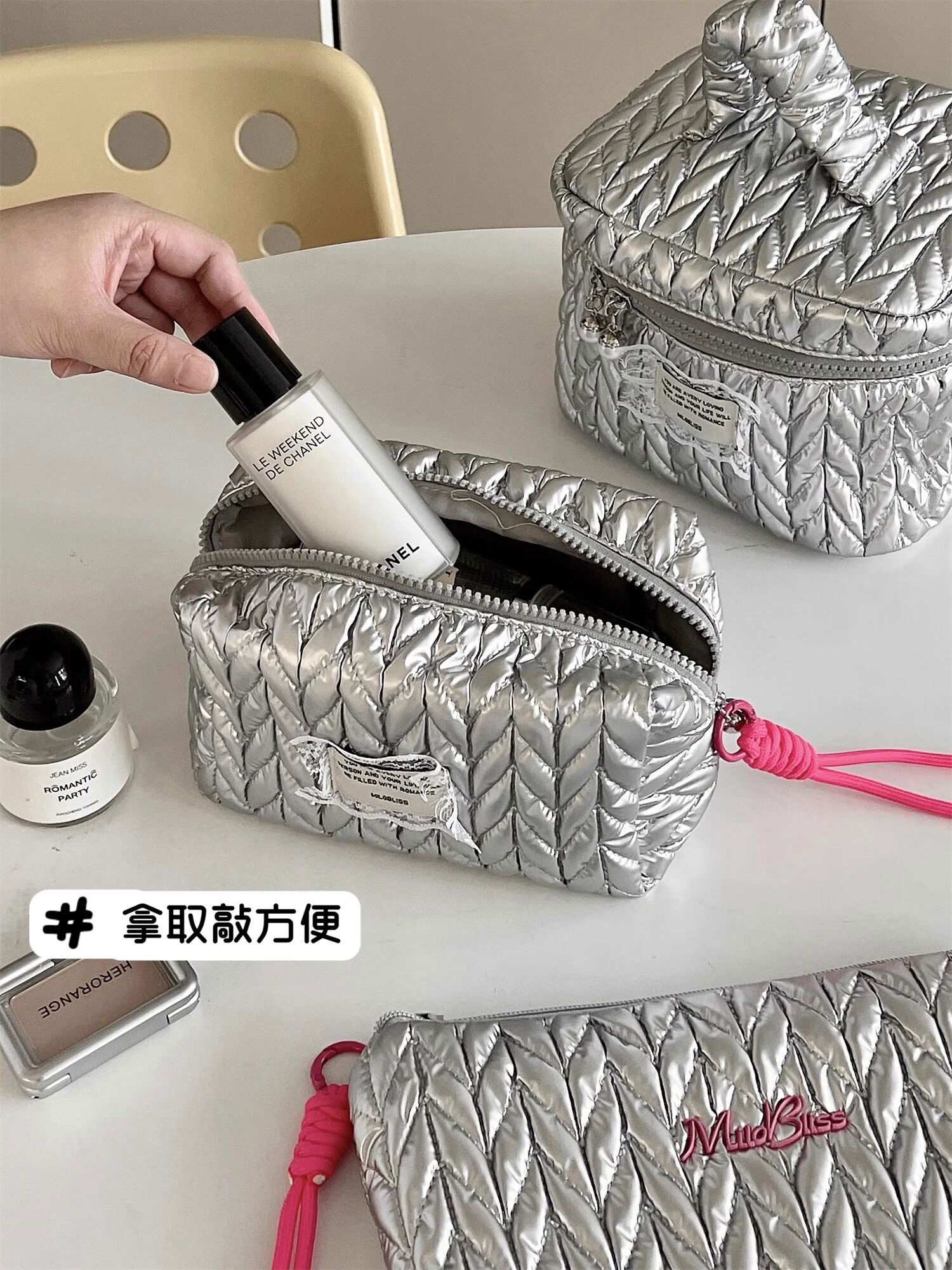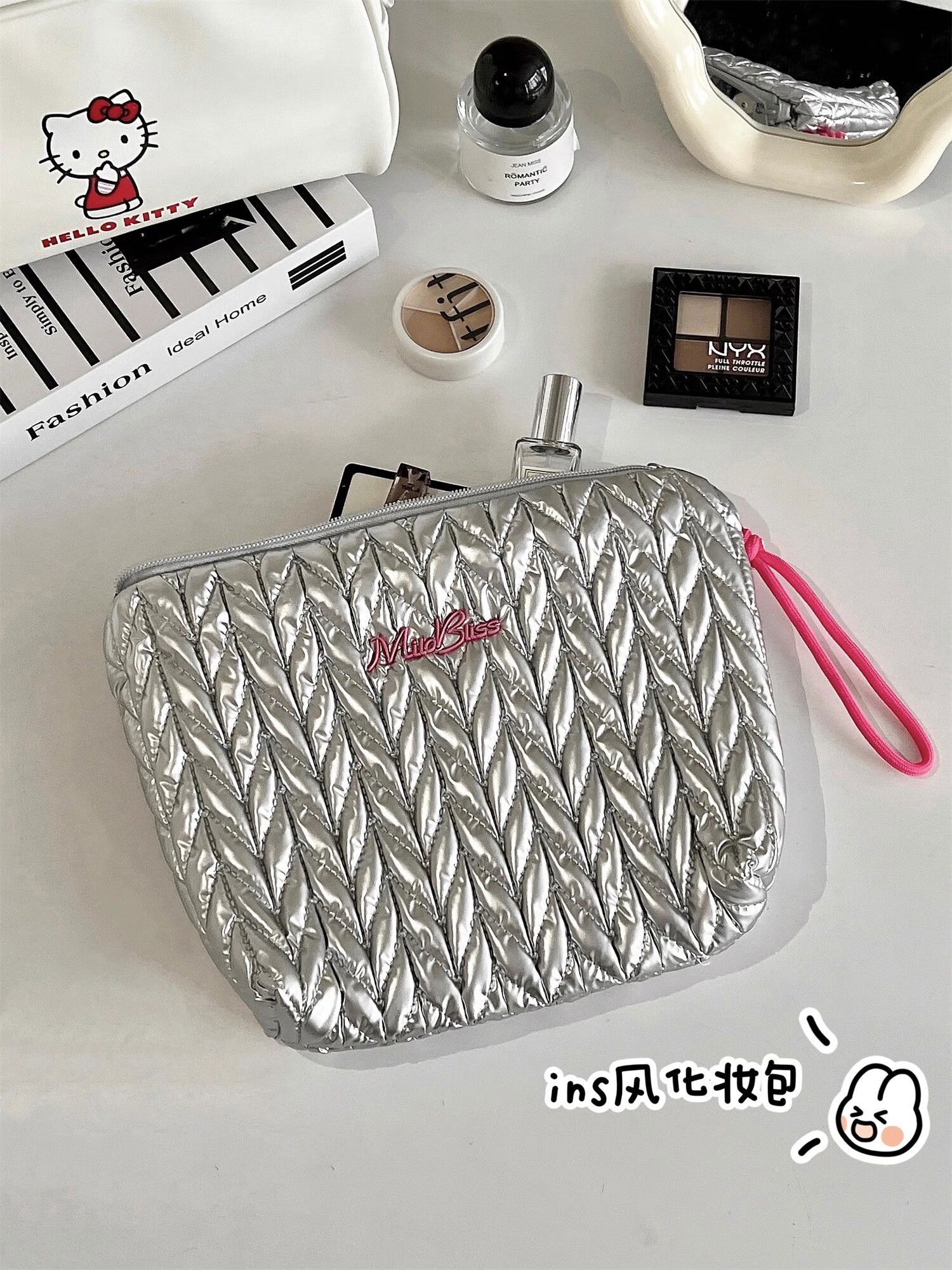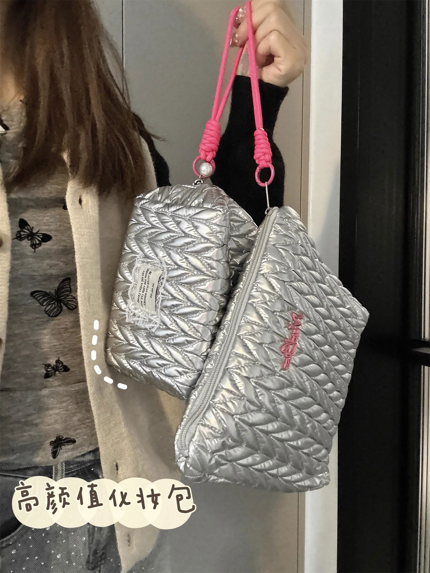 Yusenyi Cosmetic Bag Women's High-End Ins Style Cosmetic Storage Bag Large Capacity Portable Travel Toilet Bag Bright Silver Hand-Hex-Hexagonal Bag Wrinkle Fashionable