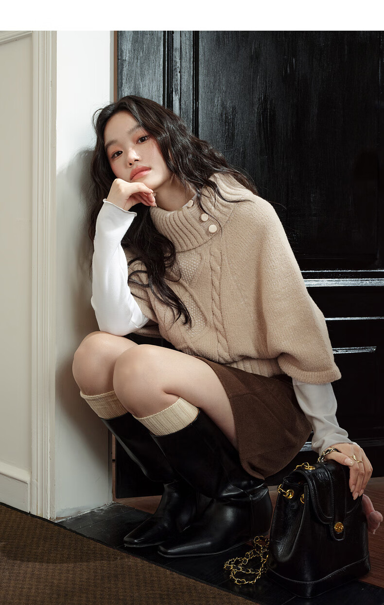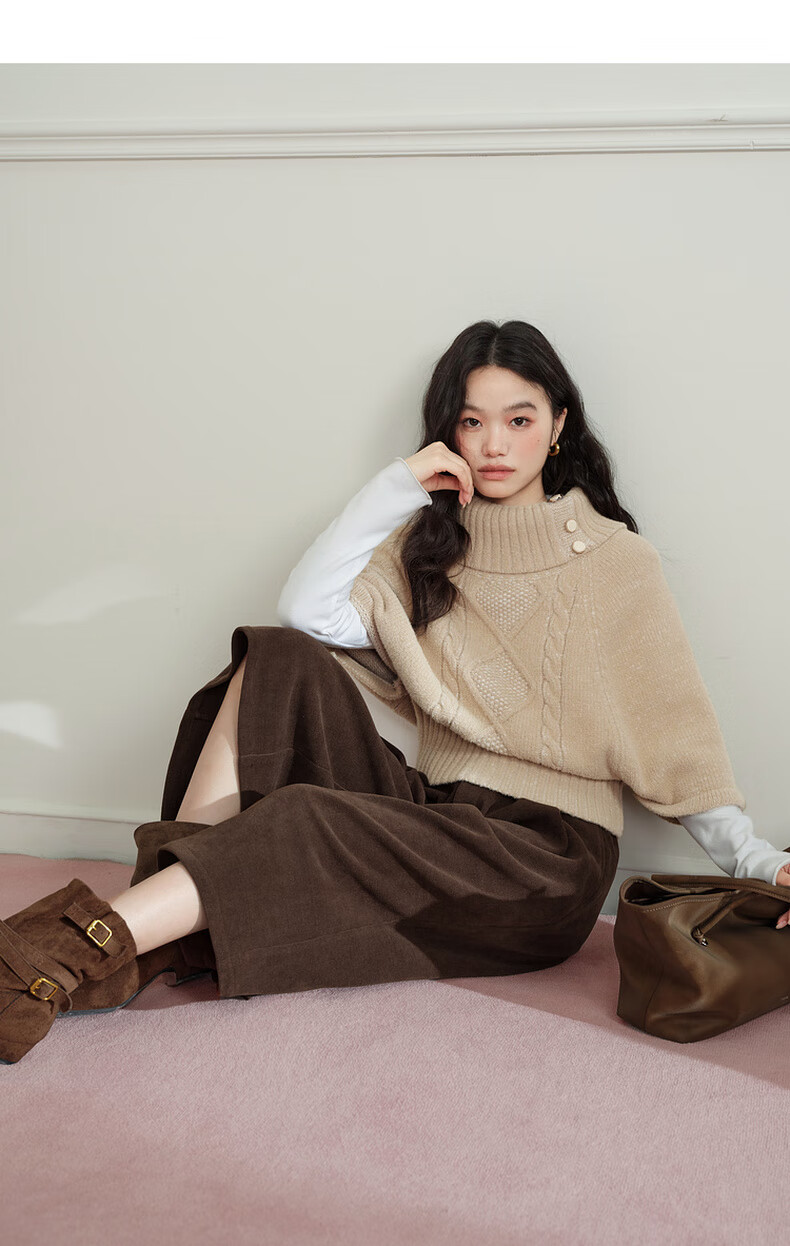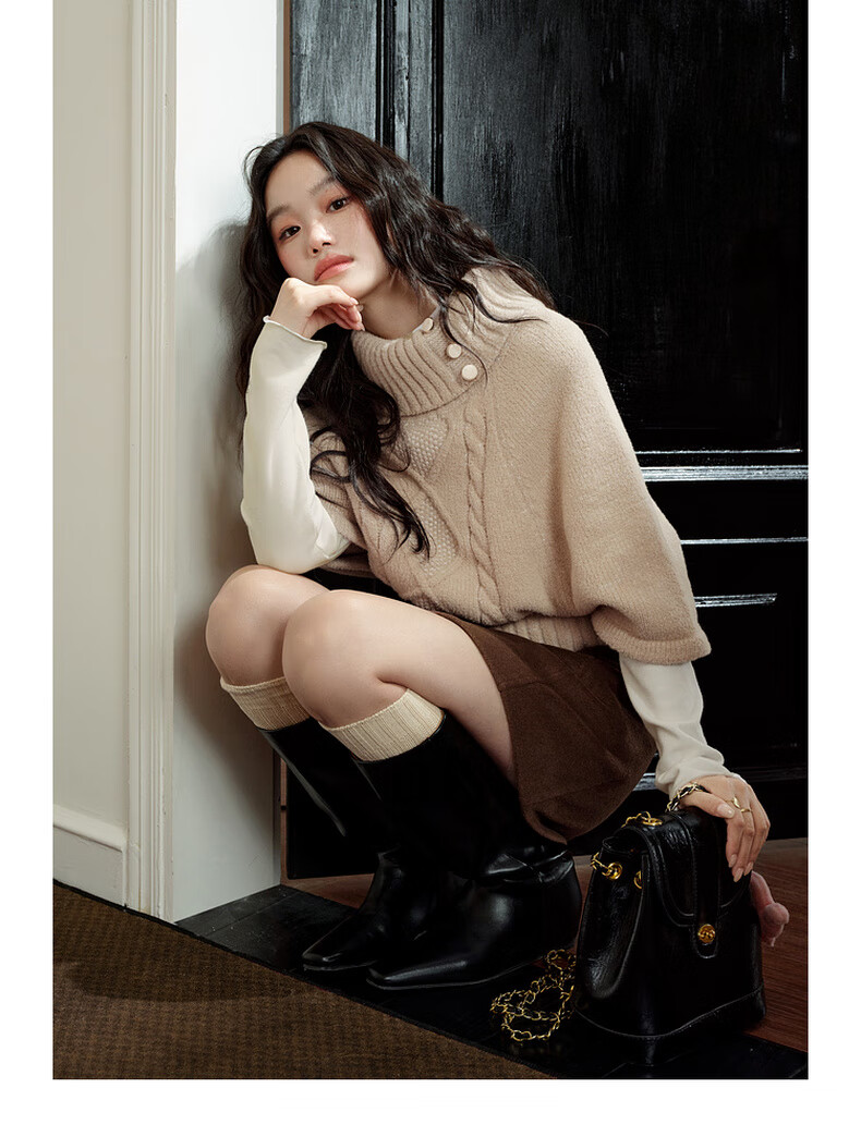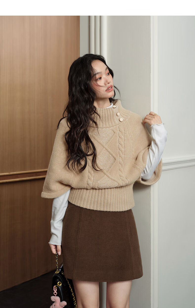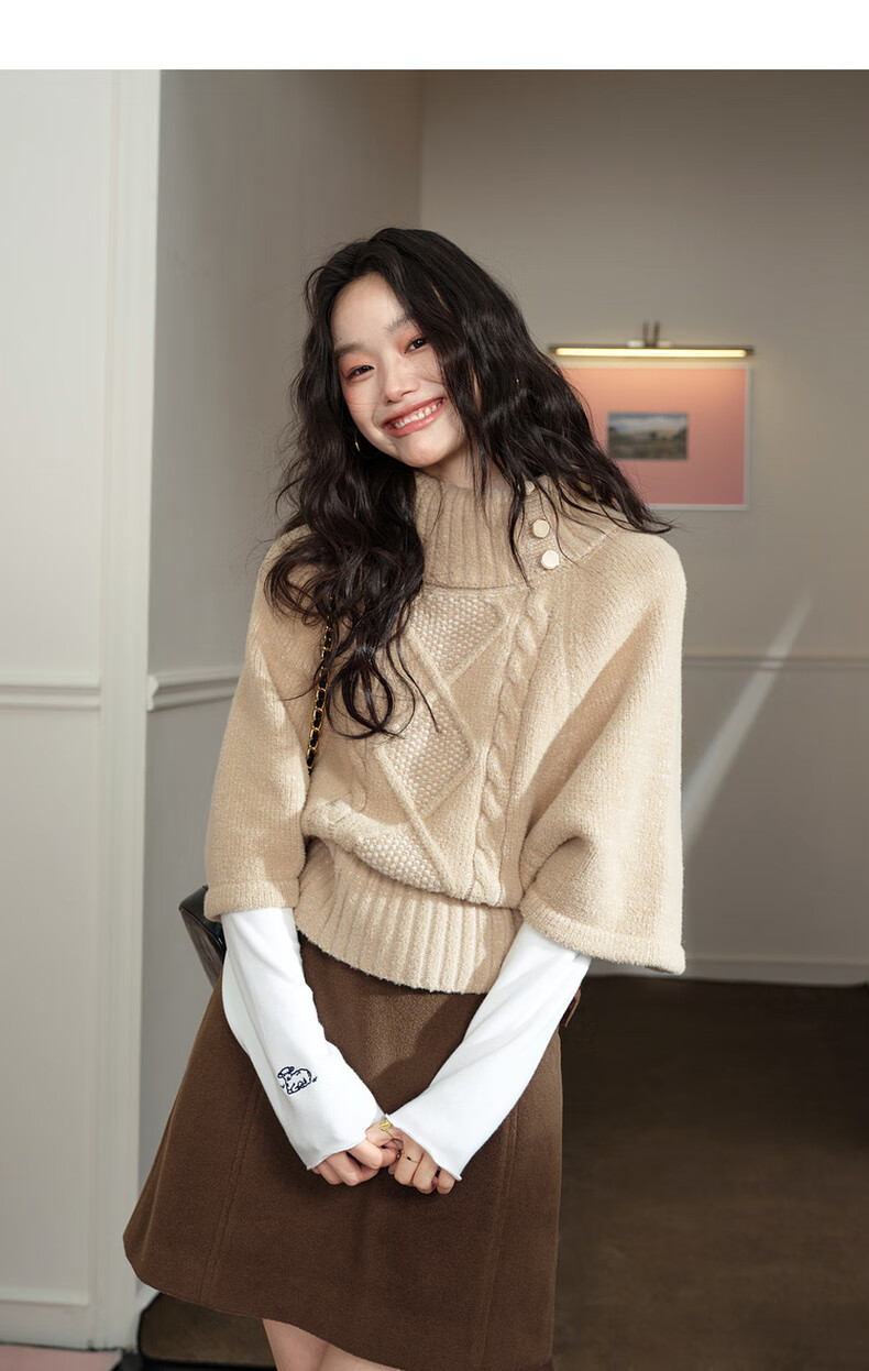 Wide color temperament woolen cape shawl top twist half turtleneck sweater 2025 autumn and winter new women's knitted sweater khaki color issued on November 27 M