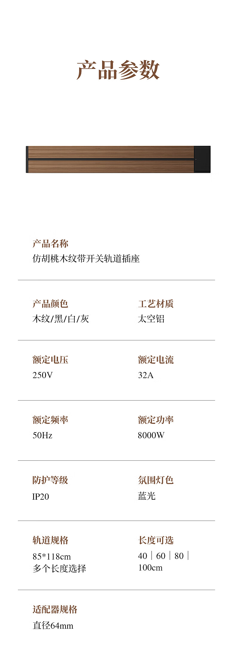 Black walnut wood grain track socket kitchen movable rail plug row retro slide rail one-click power off socket switch wood grain 30CM + 2 five holes