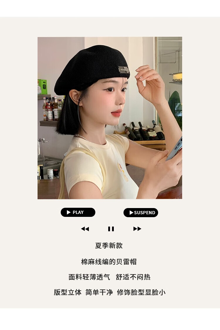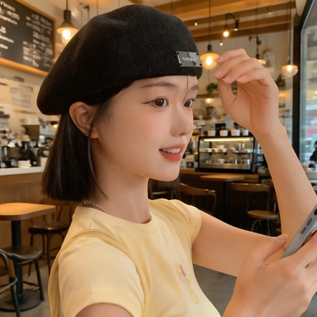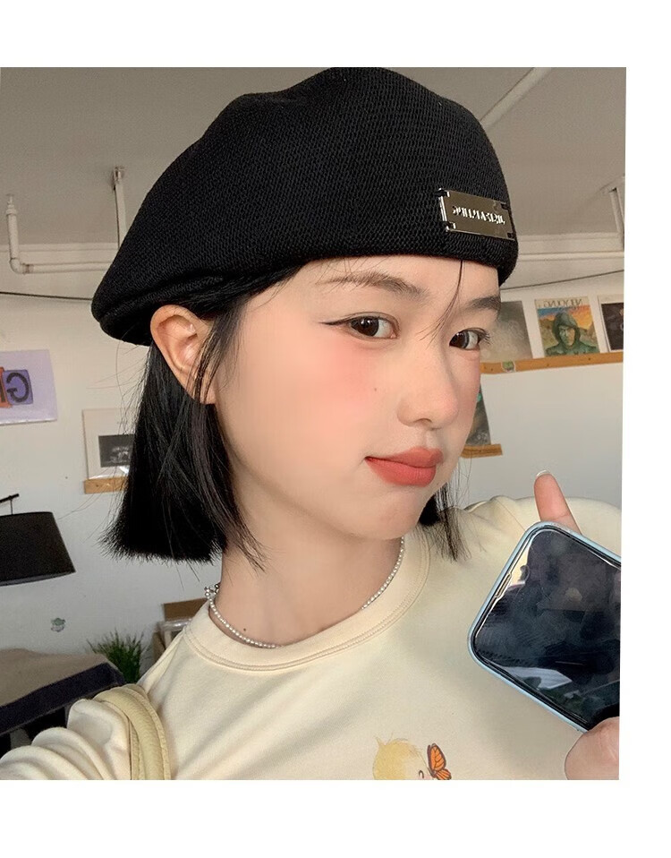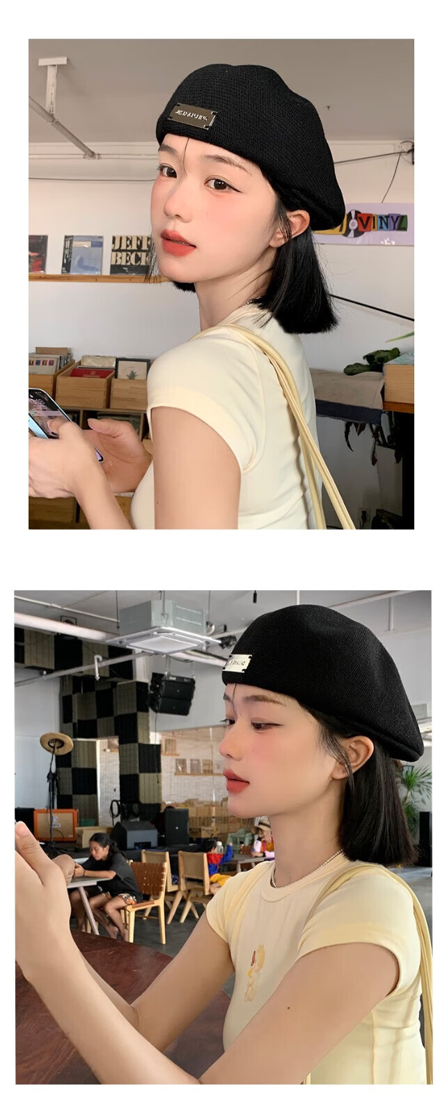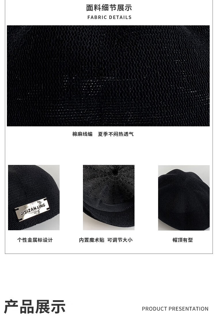 Genuine and handsome fashionable beret for women, breathable, face-showing, small reverse-wearing forward hat for men, Japanese style, large head circumference, black hat, trendy, black metal label, one size fits all (54-60cm)