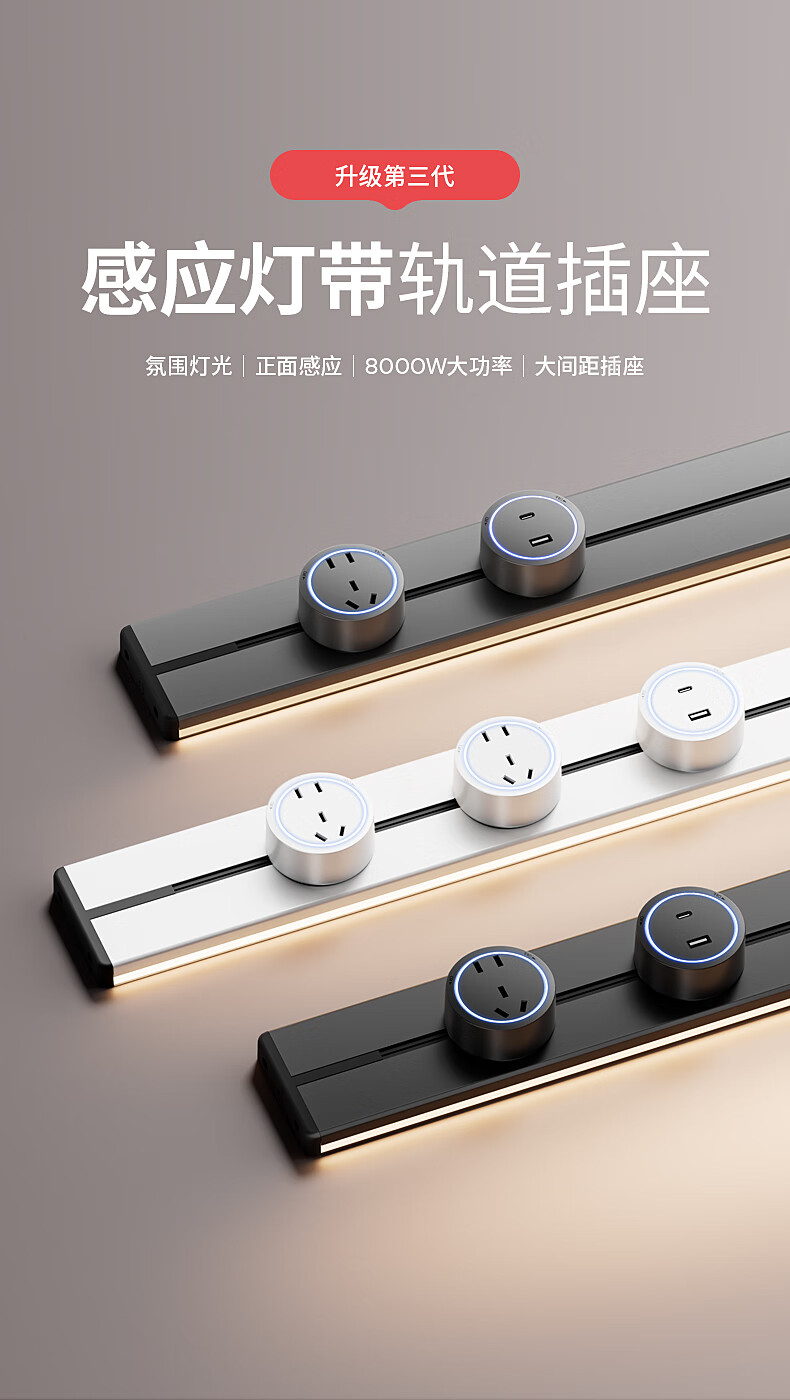 Inductive atmosphere lamp with track socket, no need to drill holes, freely movable plug-in board, household kitchen power supply, exposed socket, elegant white, exposed with sensor light bar, 50cm track + 3 five-hole adapters
