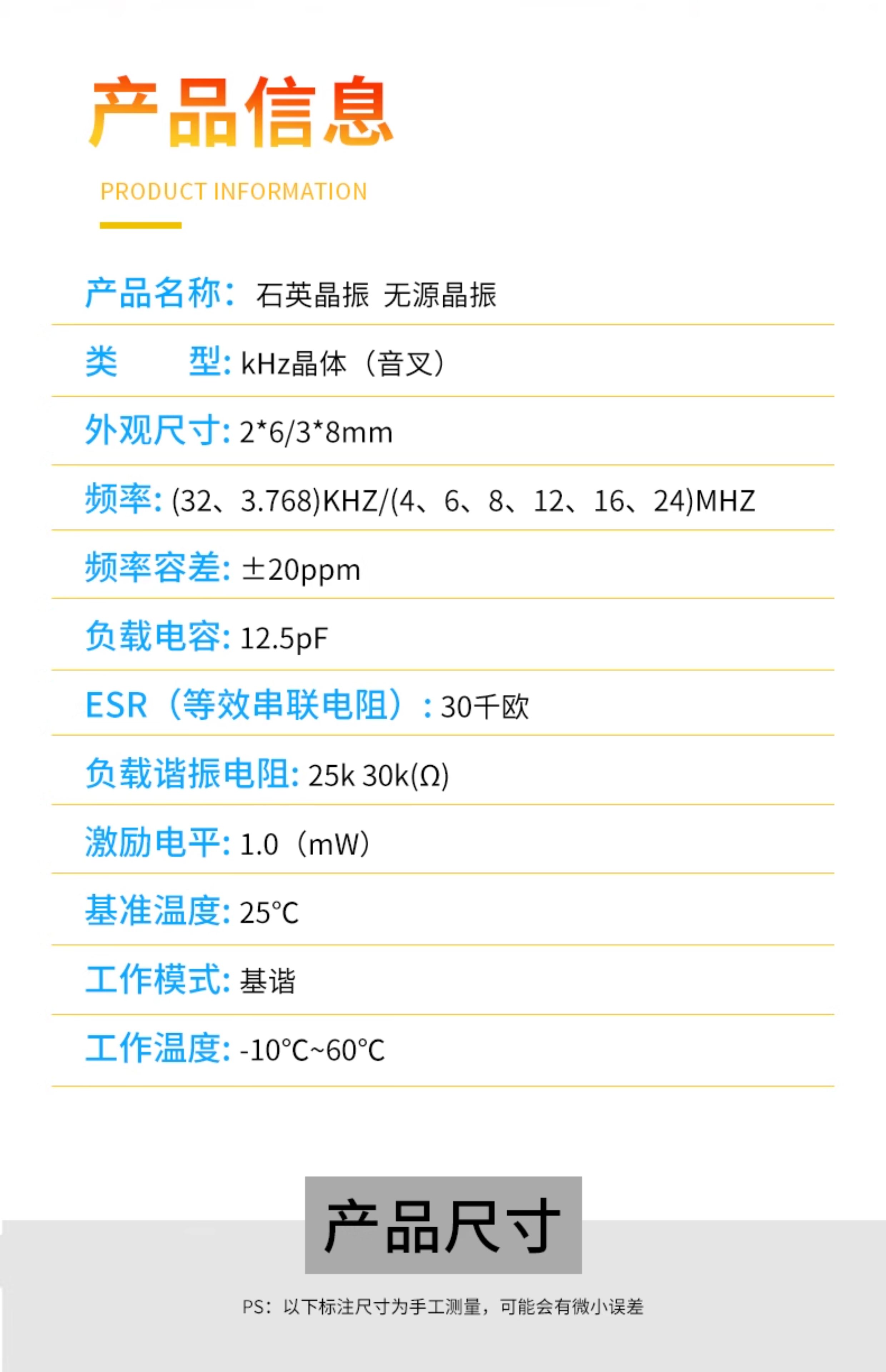 3*8 cylindrical passive crystal oscillator 32.768K 2x6 quartz crystal oscillator quartz crystal 6MHZ 8 12 16 24 3*8 32.768KHZ special price 10PPM (10 pieces) No Specifications