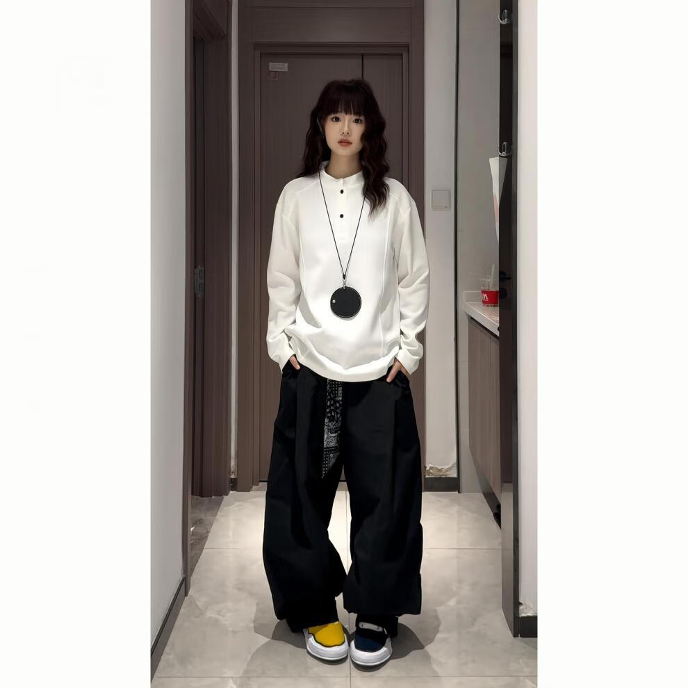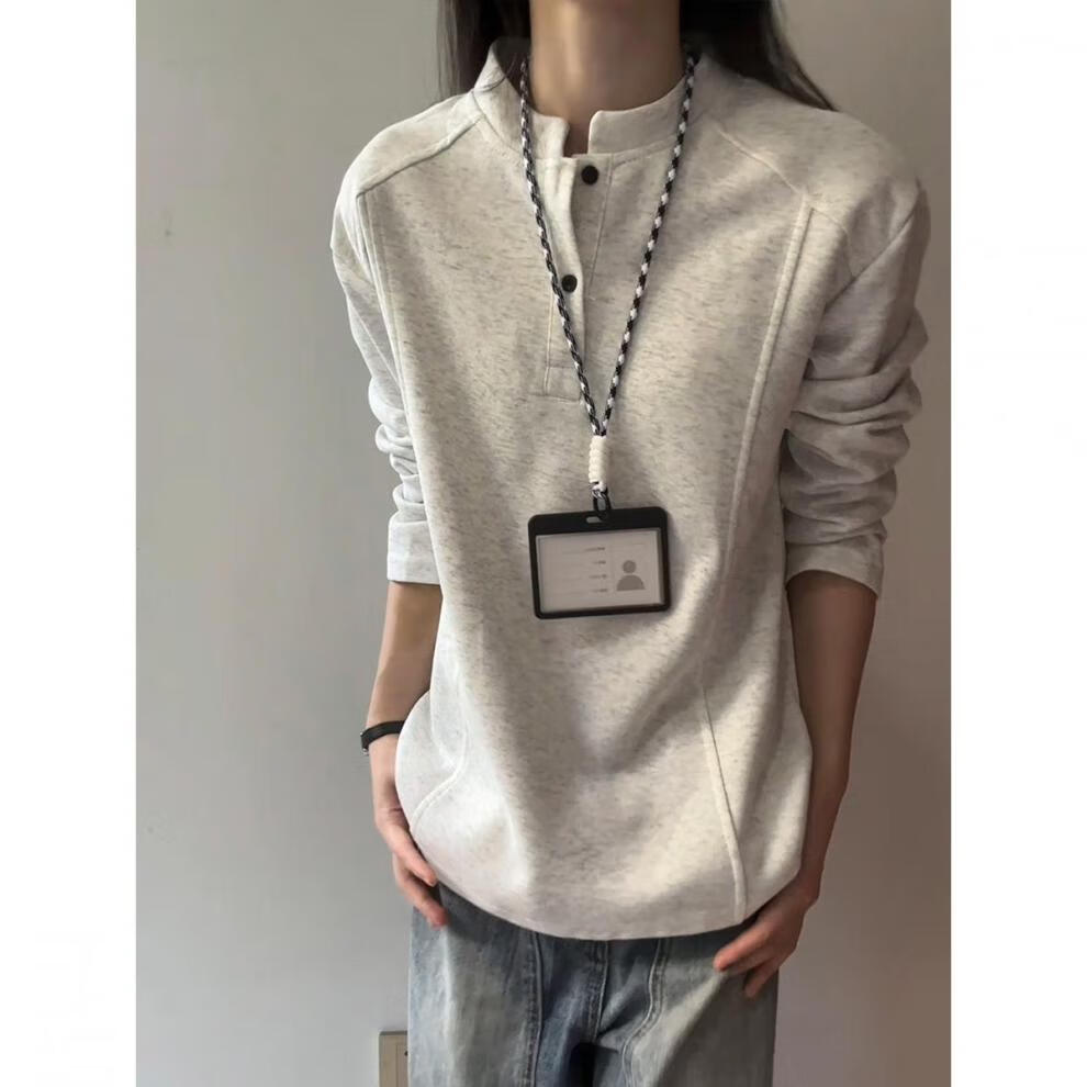 ROMON POLO shirt Henry collar long-sleeved T-shirt for men in autumn deconstructed splicing design right shoulder bottoming shirt autumn sweatshirt trend white gray M (90-120Jin Jin equals 0.5 kg)