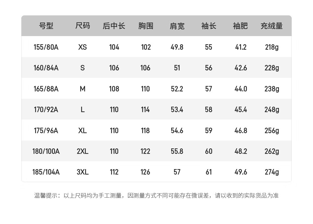 China (cm) 165 / 88-90 170 / 96-98 175 / 108-110 180 / 118-122 185 / 126-130