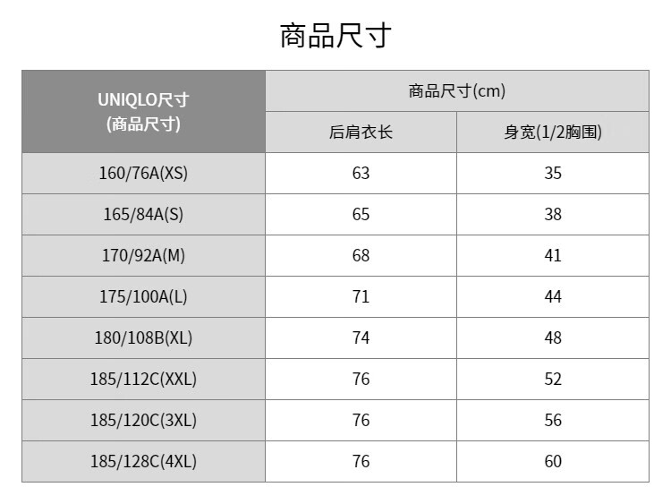 China (cm) 165 / 88-90 170 / 96-98 175 / 108-110 180 / 118-122 185 / 126-130