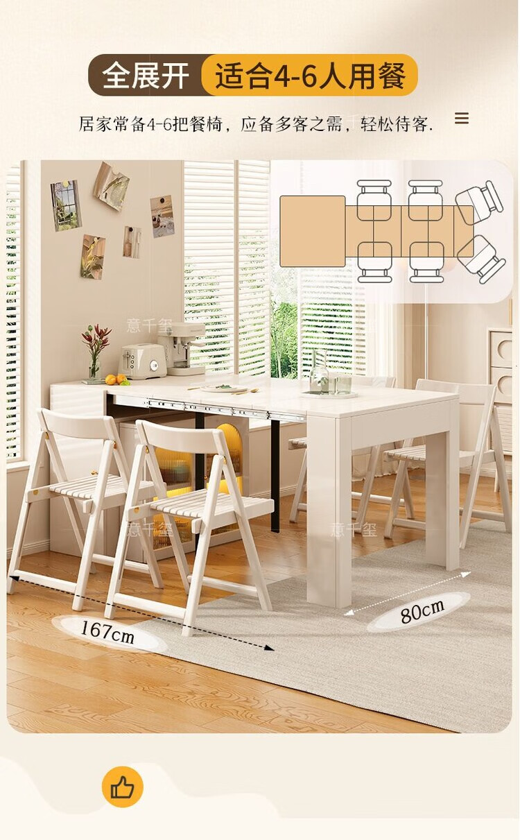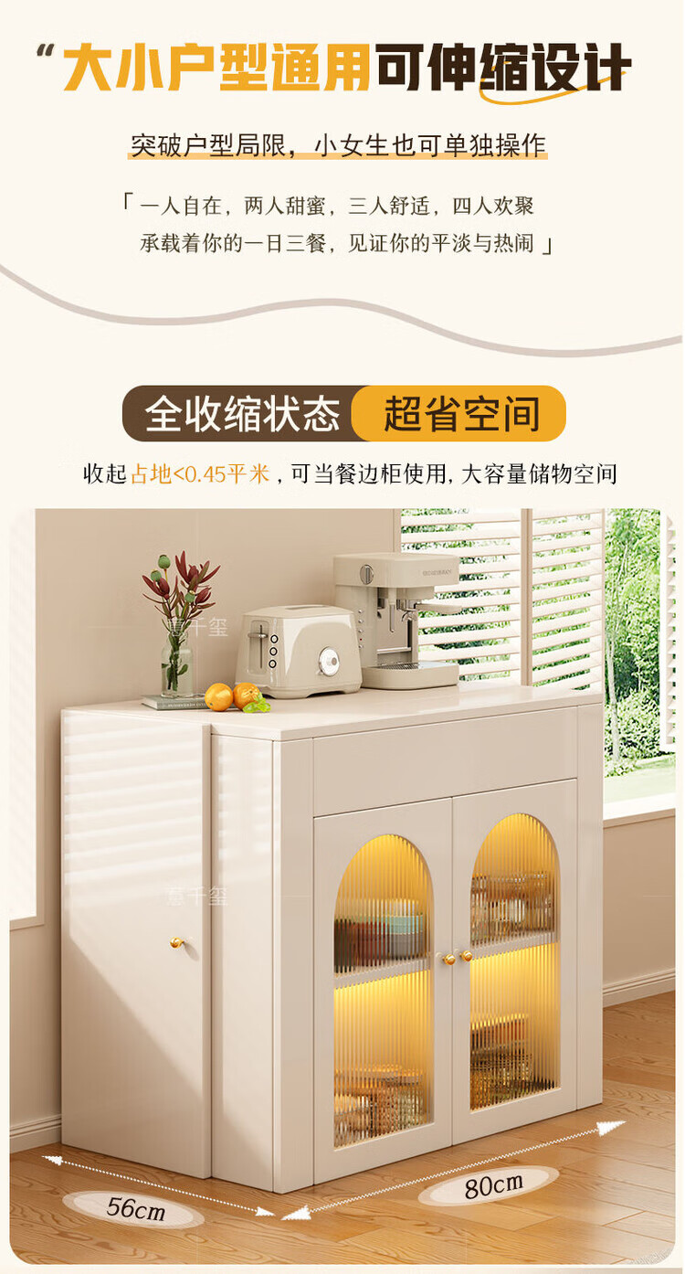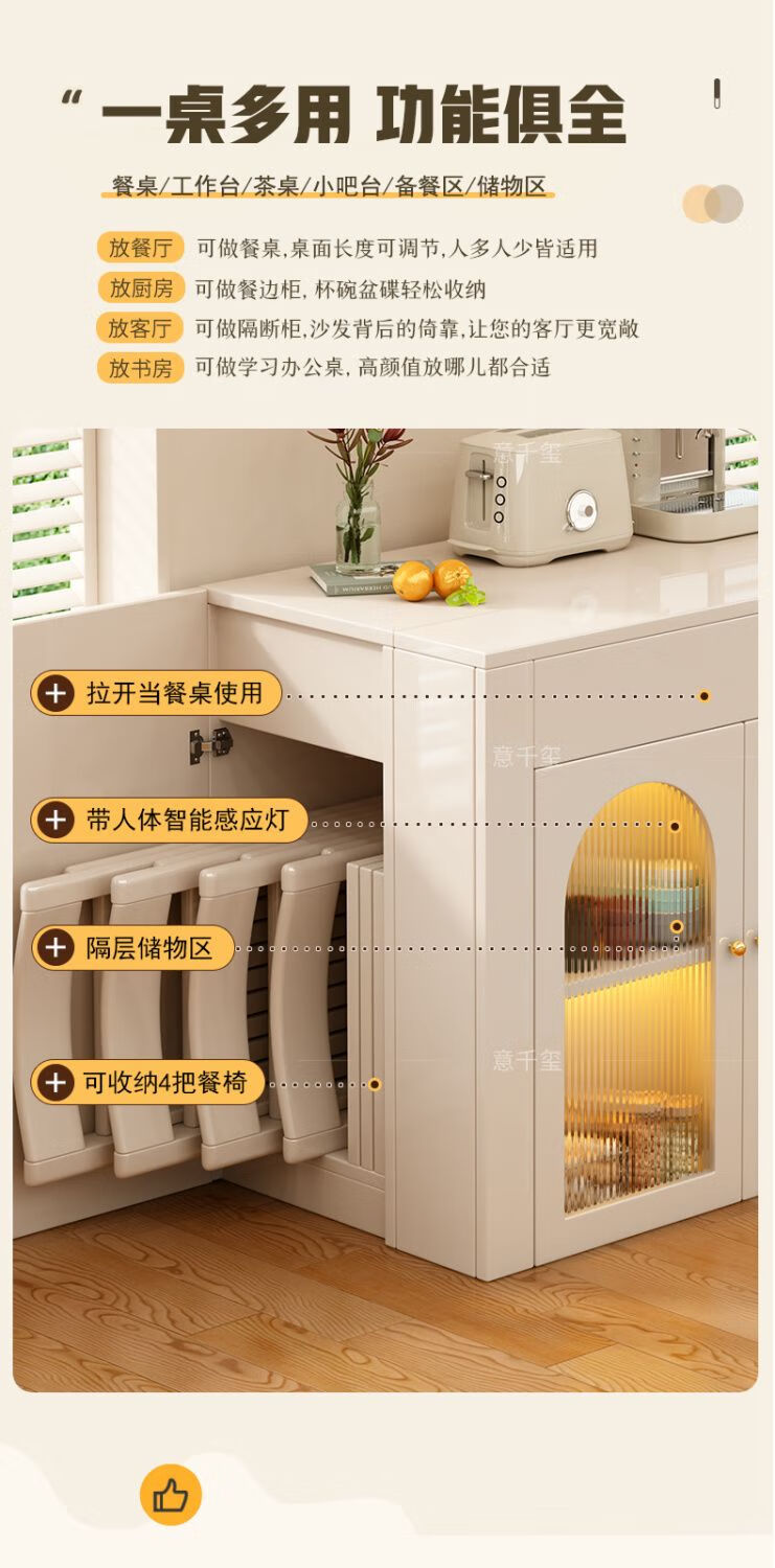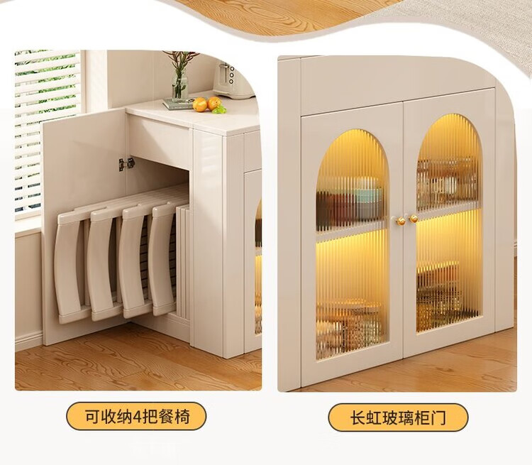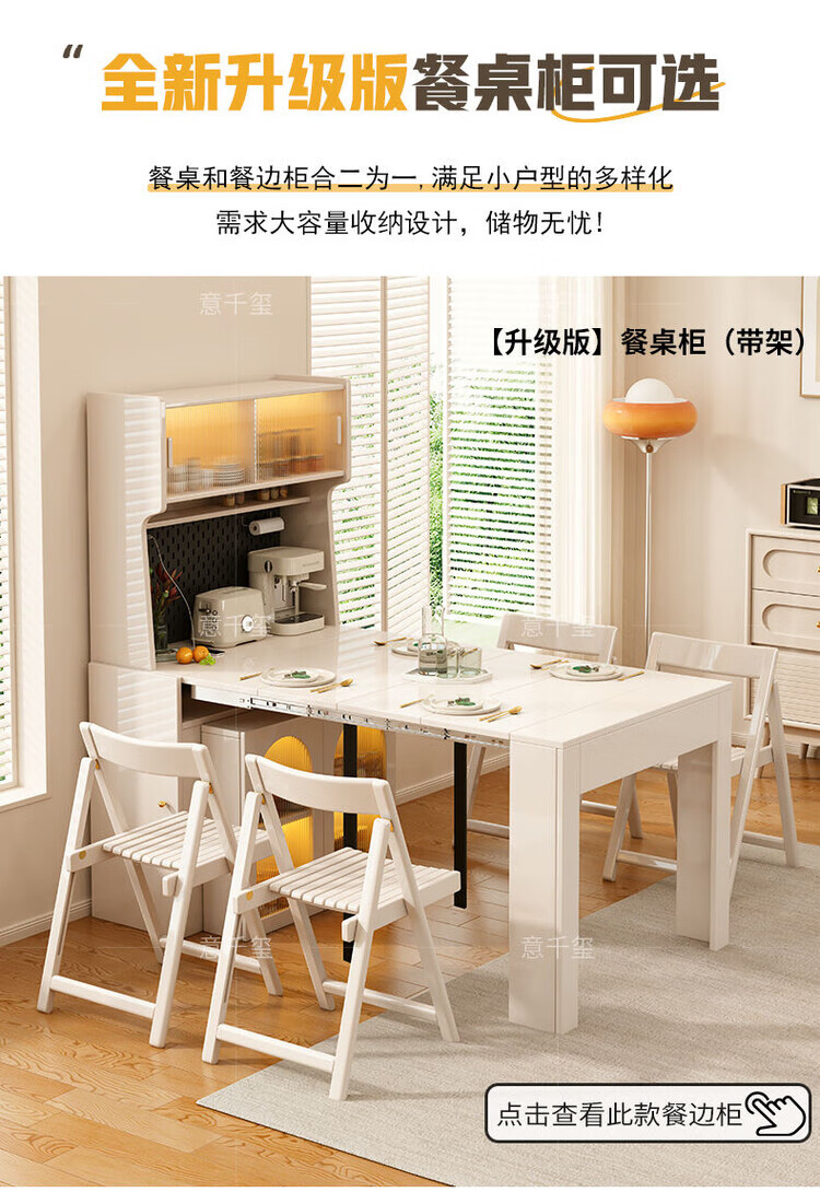Fantasy cream style retractable solid wood dining table and sideboard integrated island small apartment space-saving multifunctional high-end folding table milky white freely retractable/can store 4 folding chairs in the cabinet at the same time retractable dining table cabinet + solid wood folding chairs*6