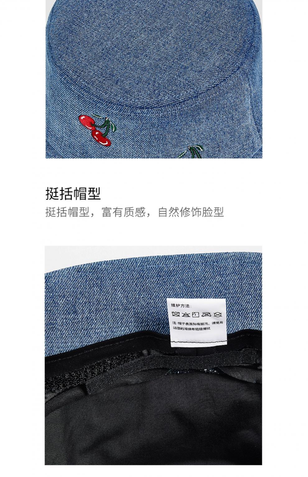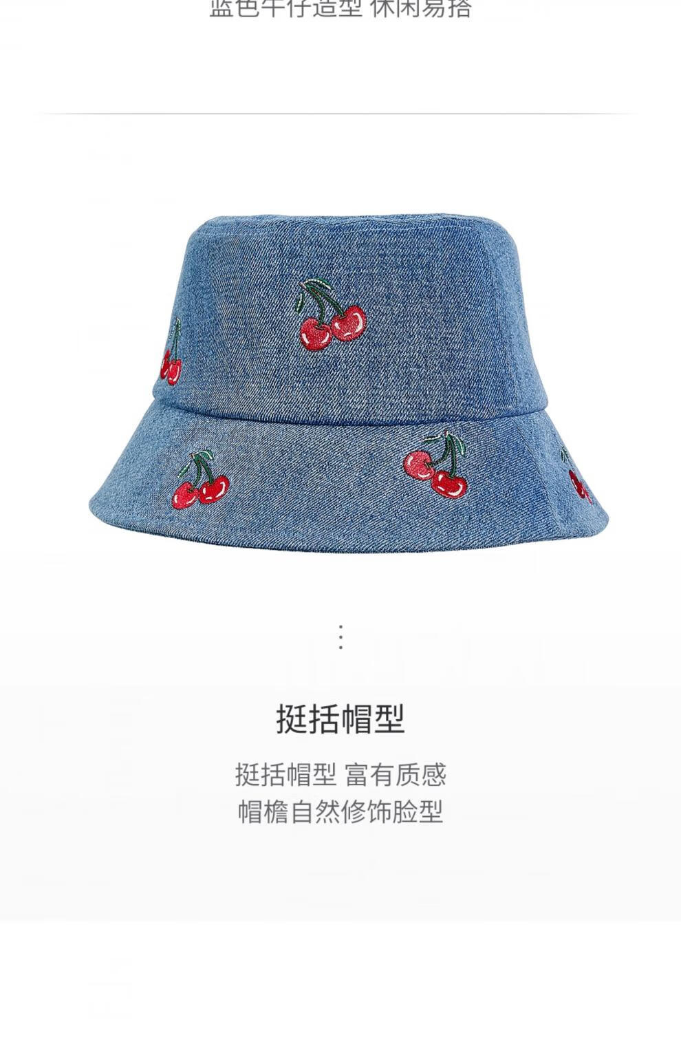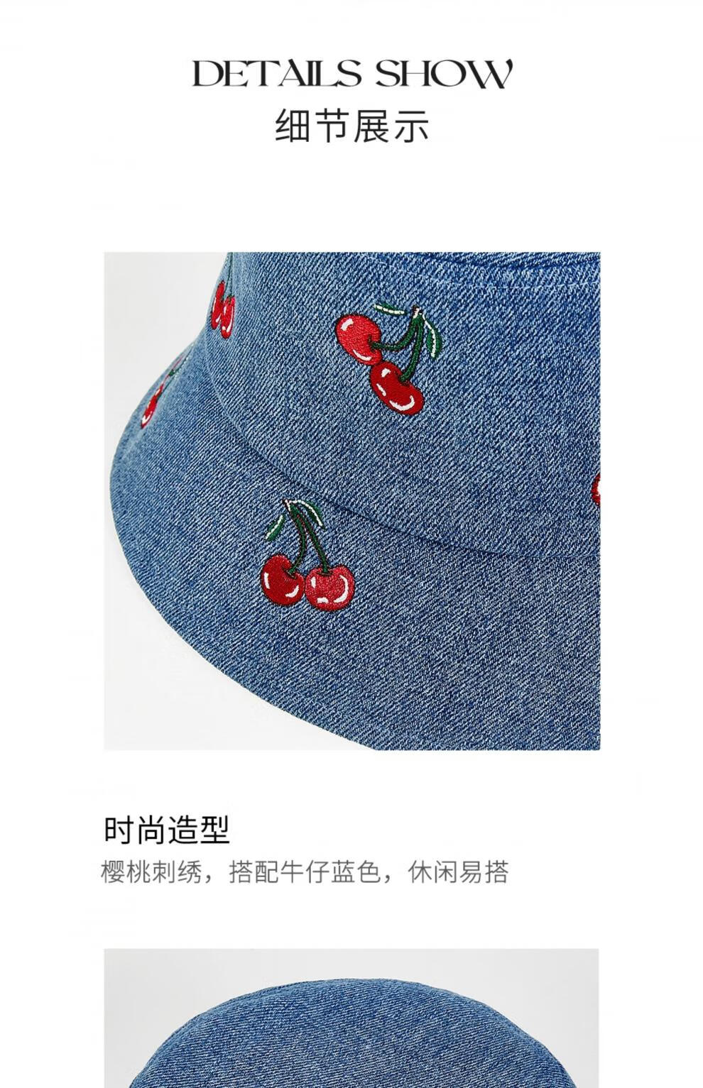 Lannuo cherry embroidered denim fisherman hat for women 2025 autumn new style big head circumference showing face small basin hat thin hat blue M (56-58cm)