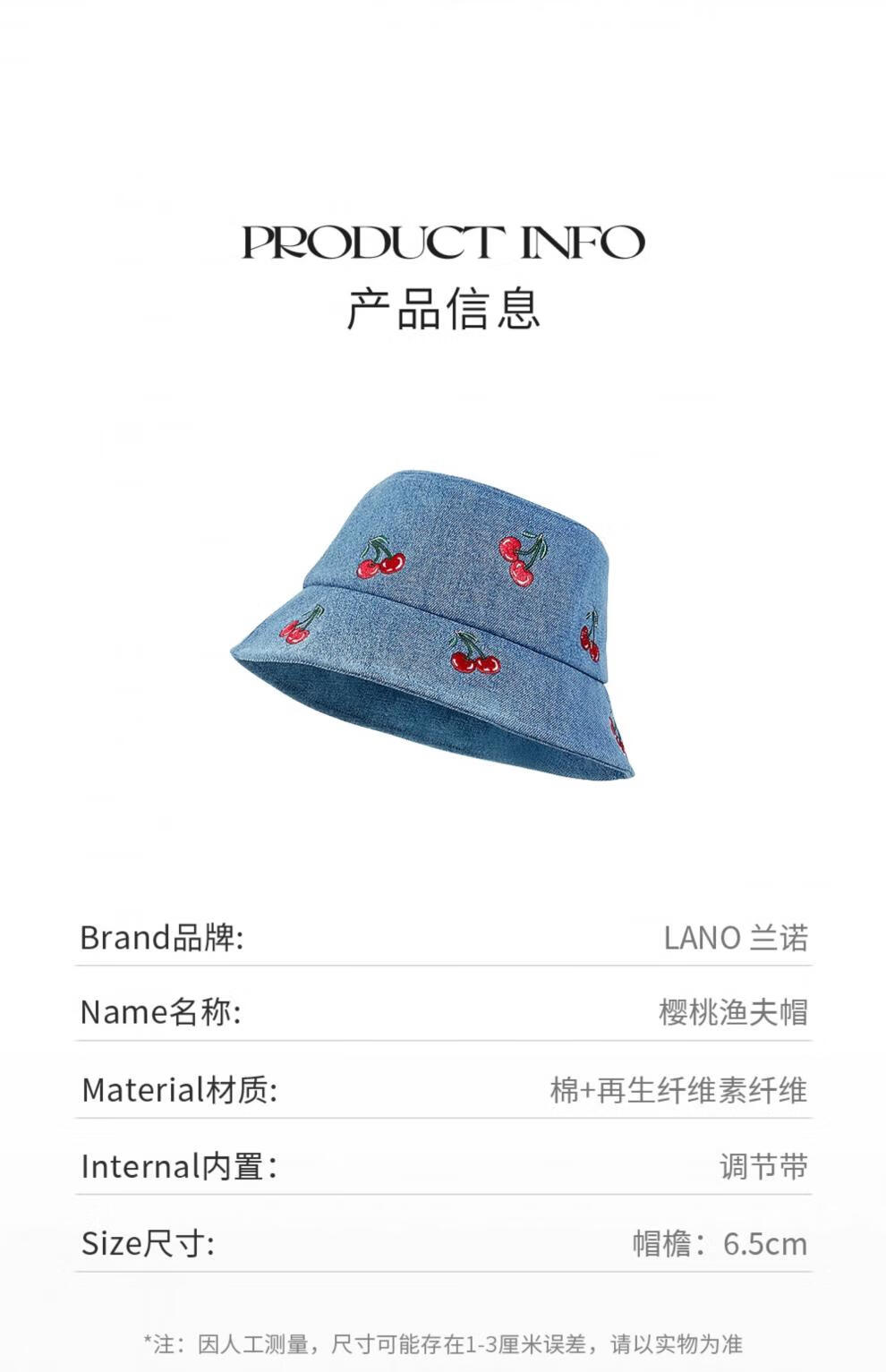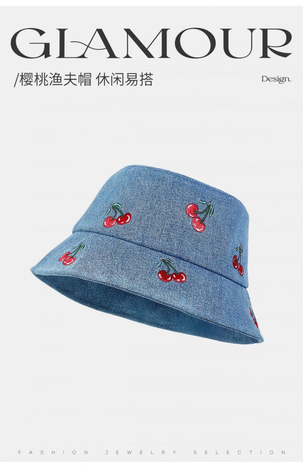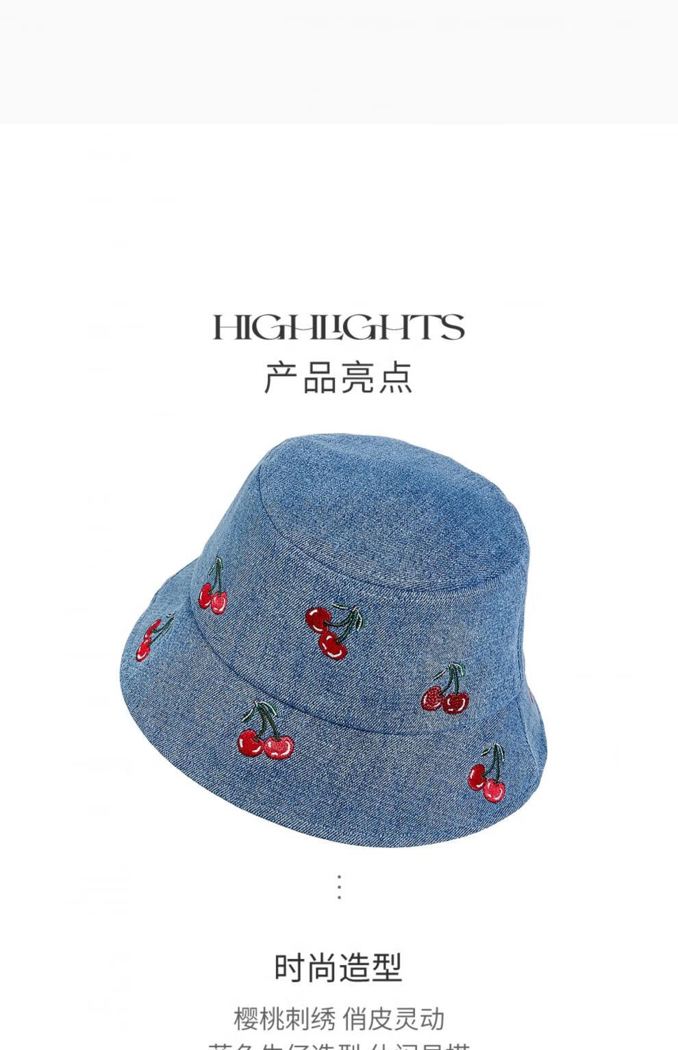 Lannuo cherry embroidered denim fisherman hat for women 2025 autumn new style big head circumference showing face small basin hat thin hat blue M (56-58cm)