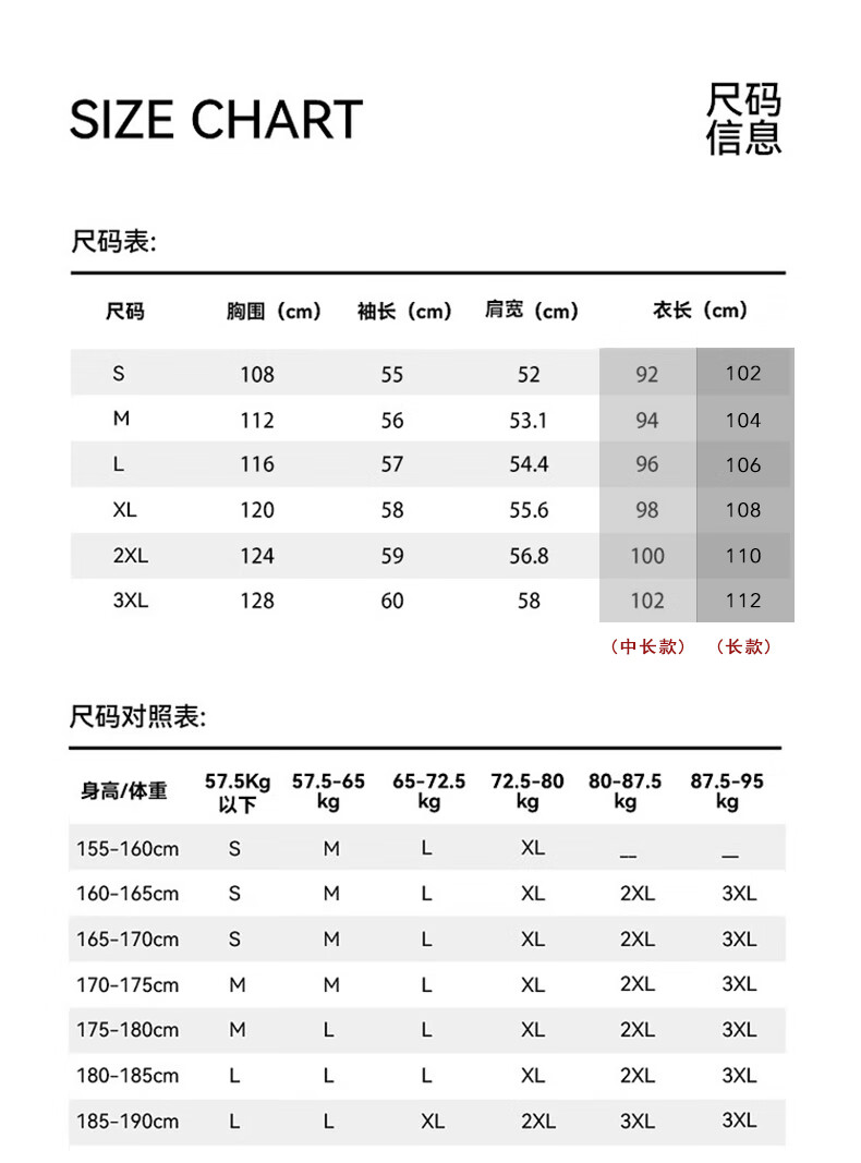 China (cm) 160-165/84-86 165-170 / 88-90 167-172 / 92-96 168-173 / 98-102 170-176 / 106-110