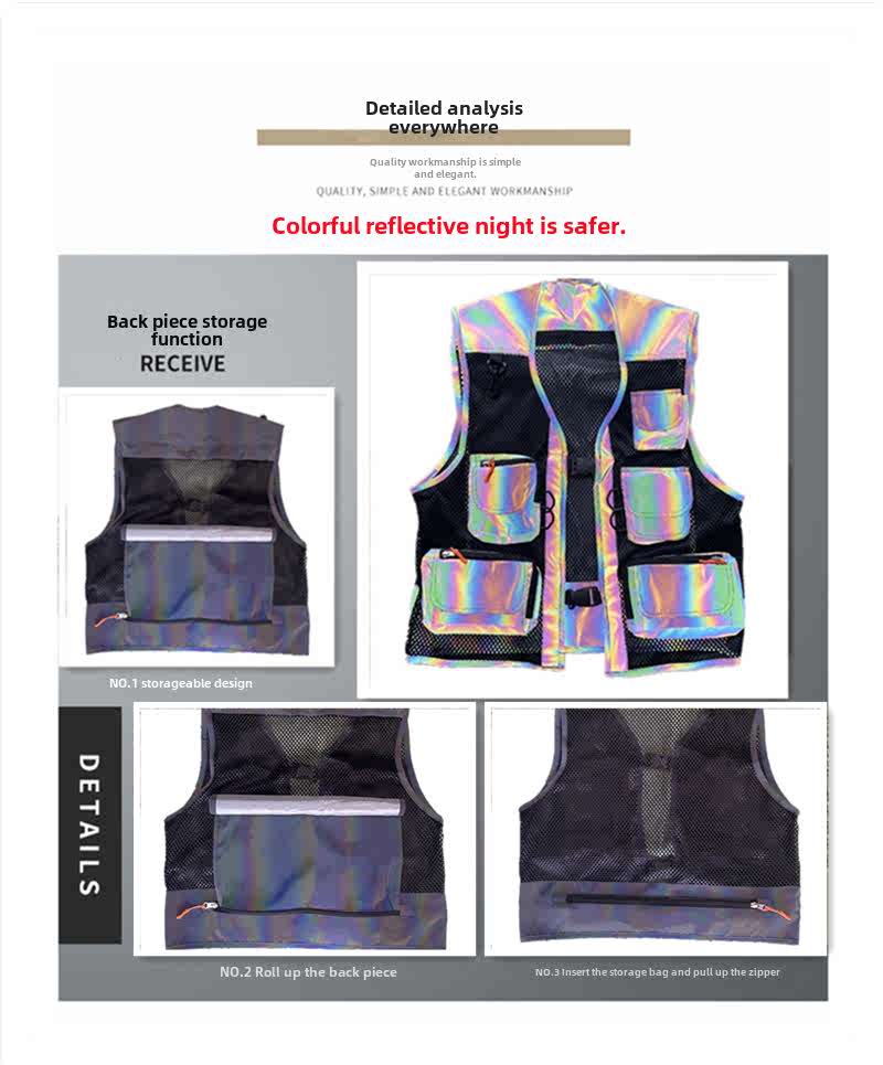 Colorful Reflective Work Vest Men's Multi-Pocket Jacket Bicycle Safety Night Vision Photographer Fishing Multifunctional Vest Decoration Colorful Reflective M