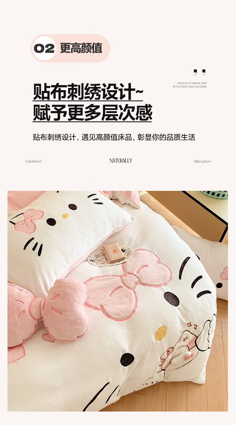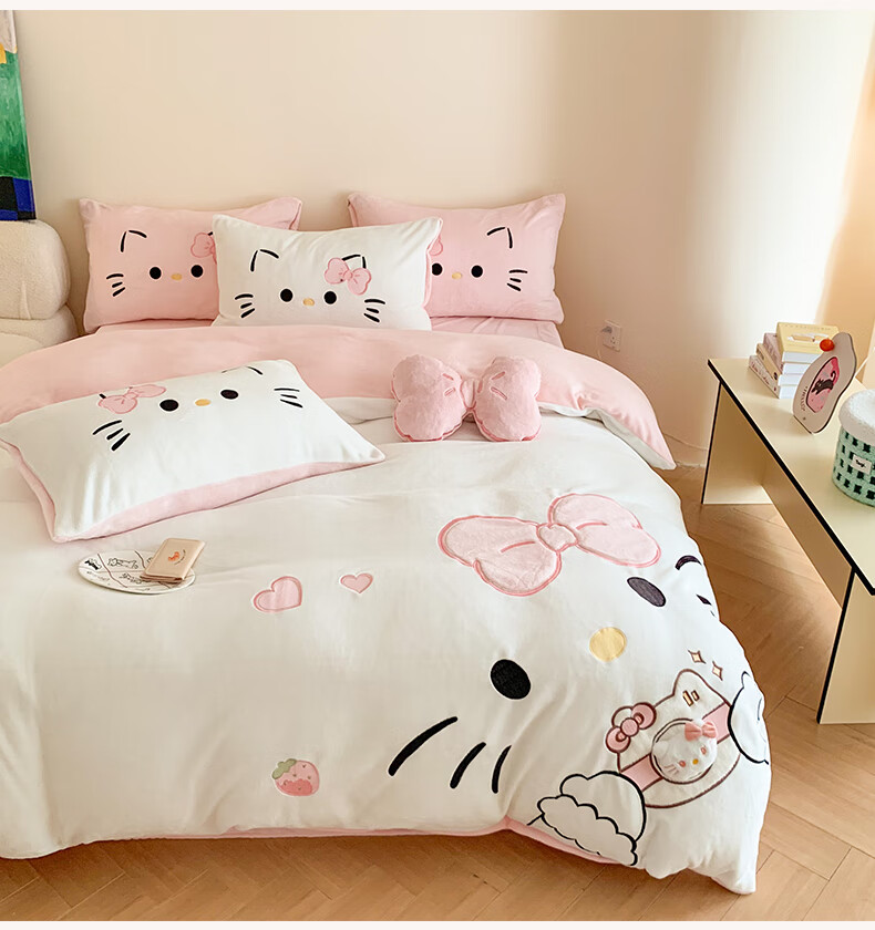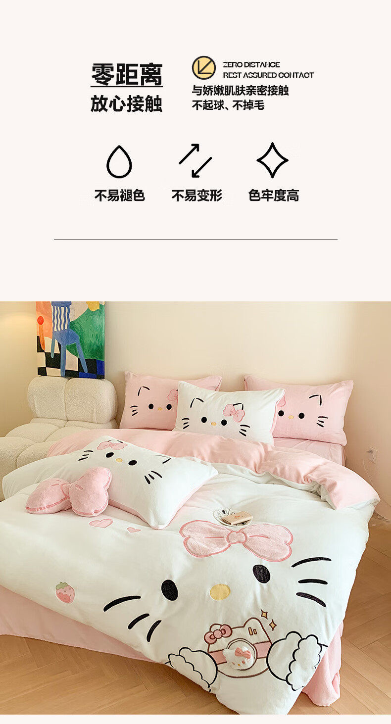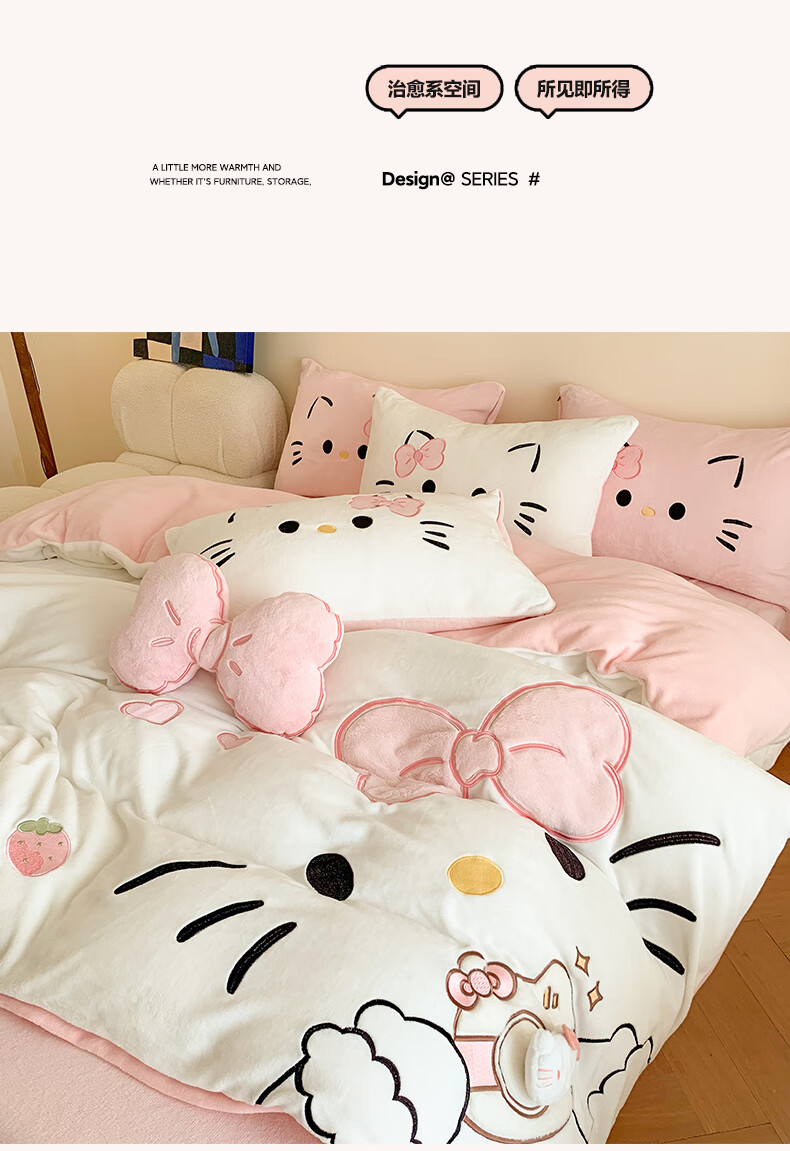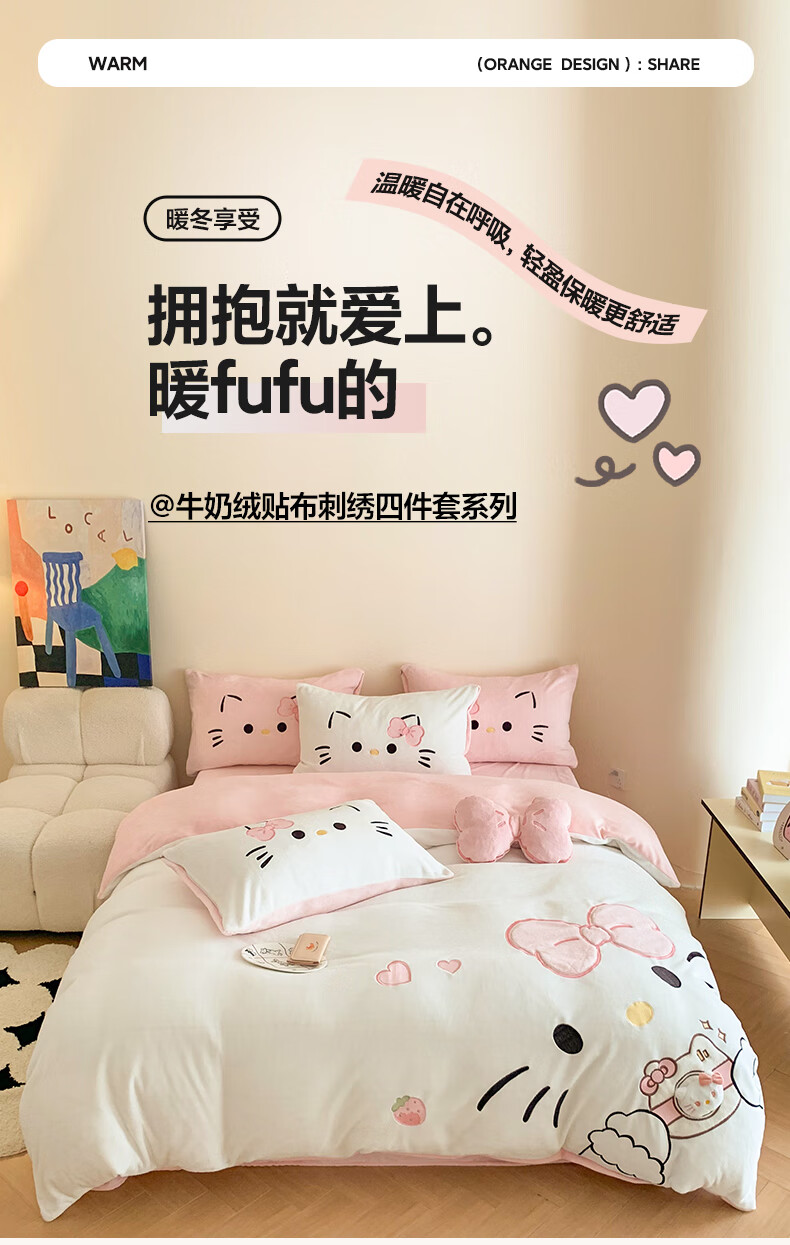 MUJI winter milk velvet appliqué embroidered four-piece set thickened double-sided velvet sheet quilt cover fitted sheet home dormitory warm kit cute cat-pink Class A baby velvet 1.8m bed sheet style four-piece set-quilt cover 200*230cm