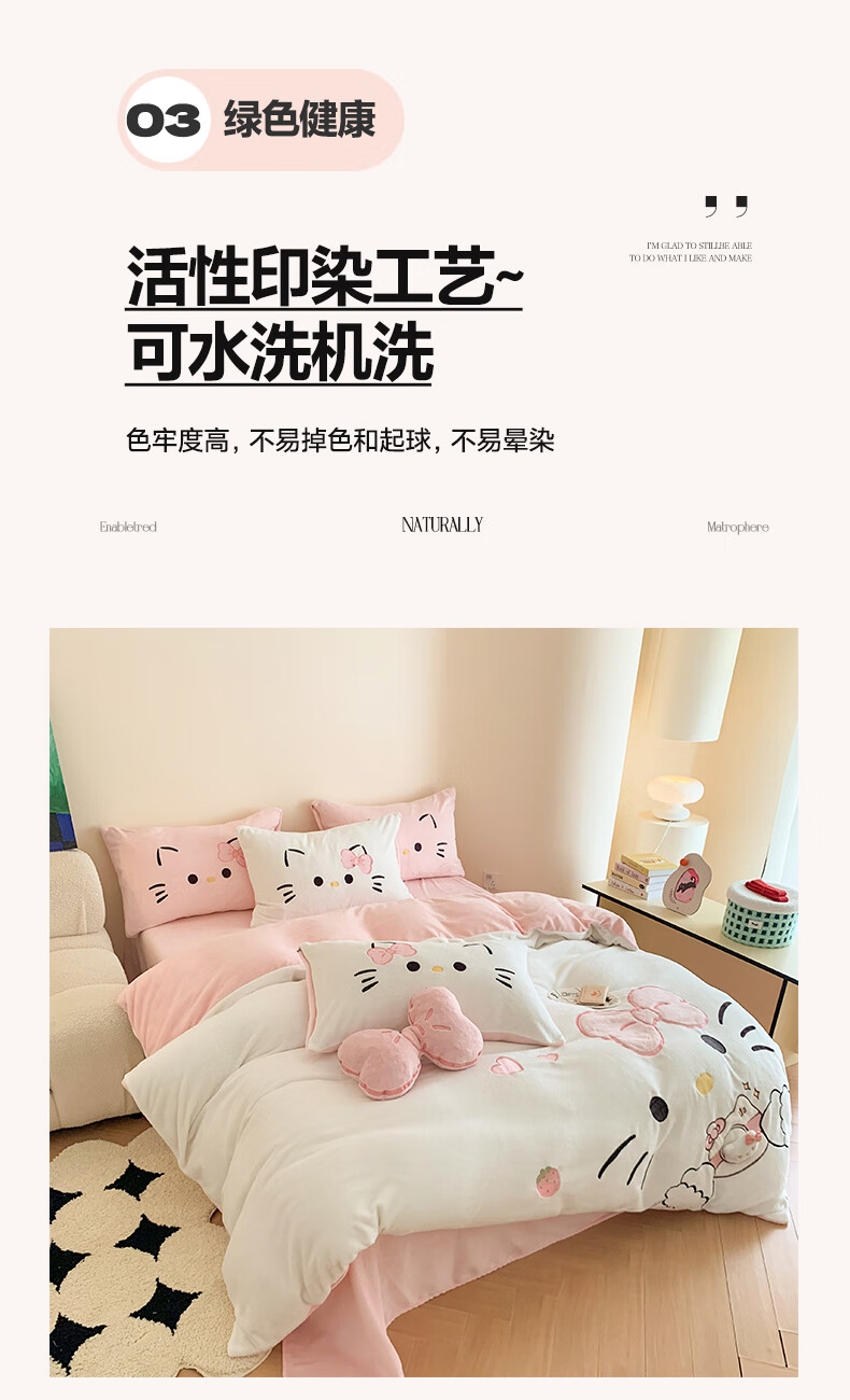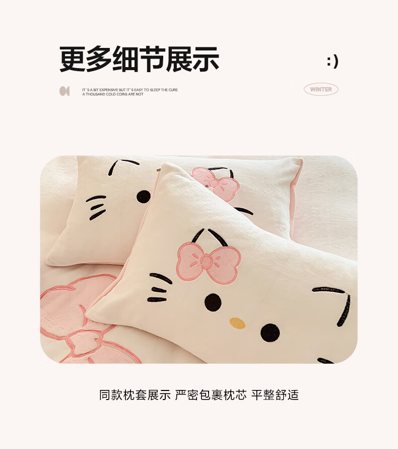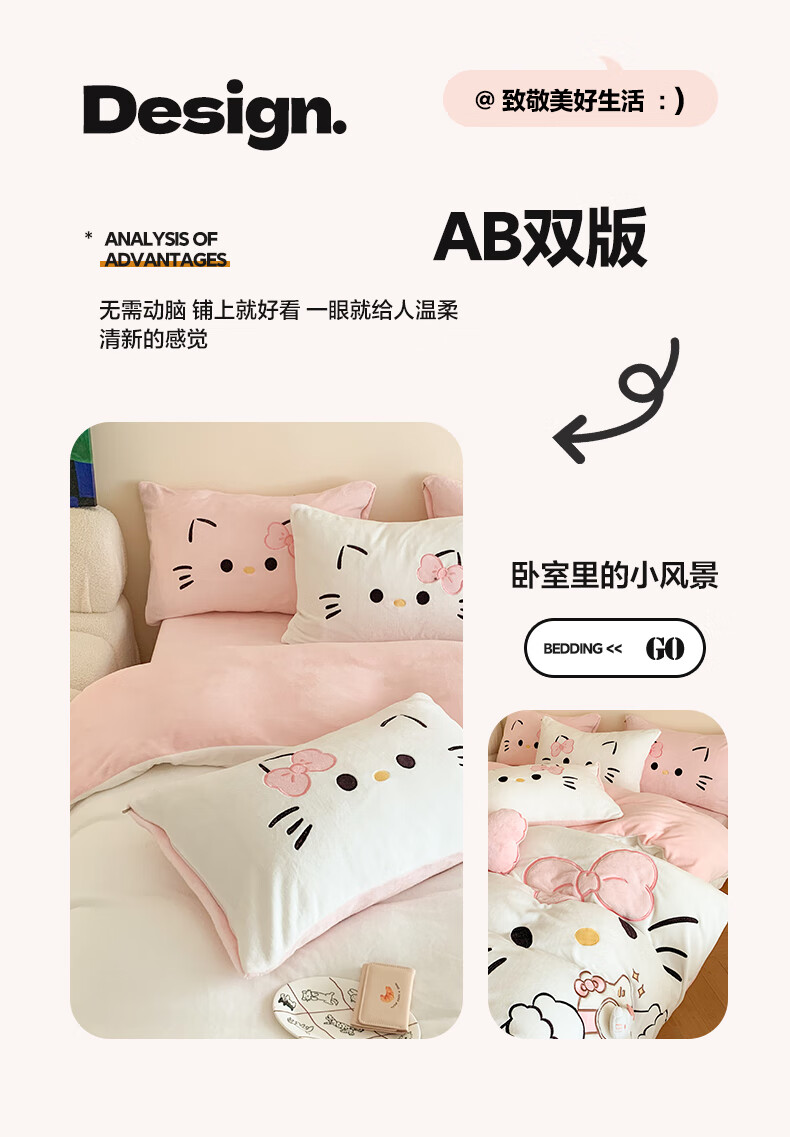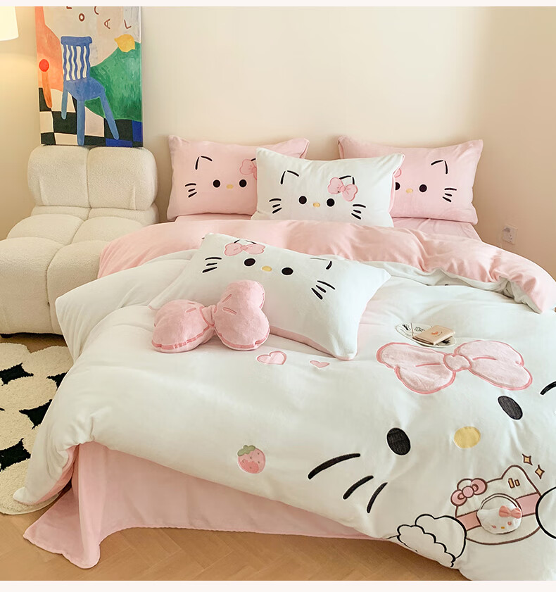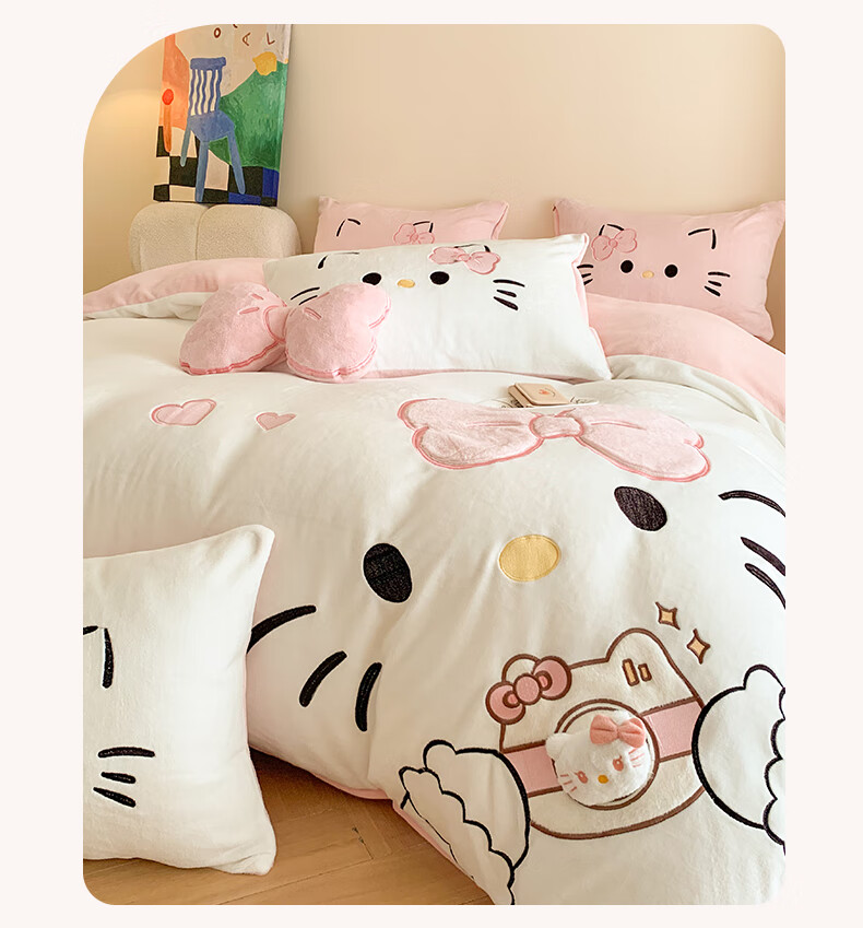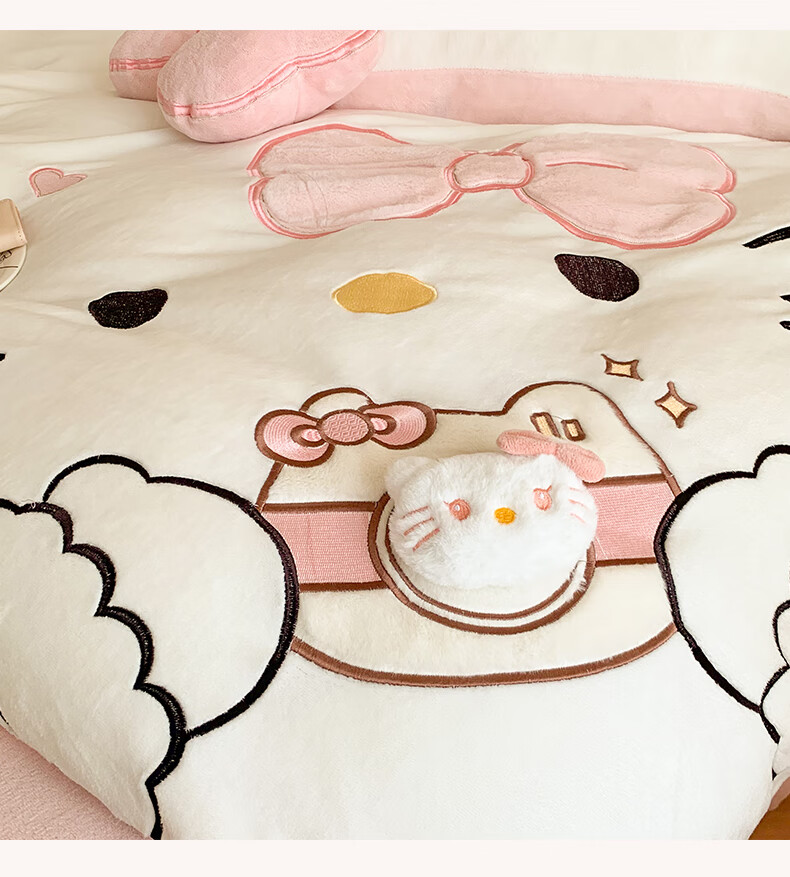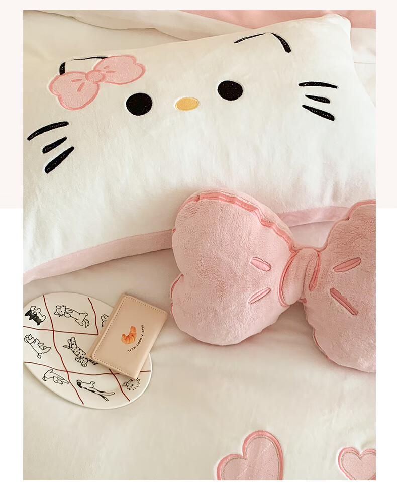 MUJI winter milk velvet appliqué embroidered four-piece set thickened double-sided velvet sheet quilt cover fitted sheet home dormitory warm kit cute cat-pink Class A baby velvet 1.8m bed sheet style four-piece set-quilt cover 200*230cm