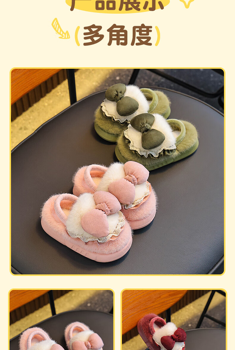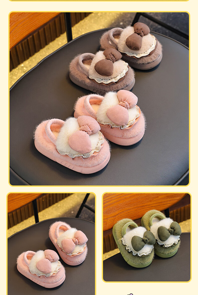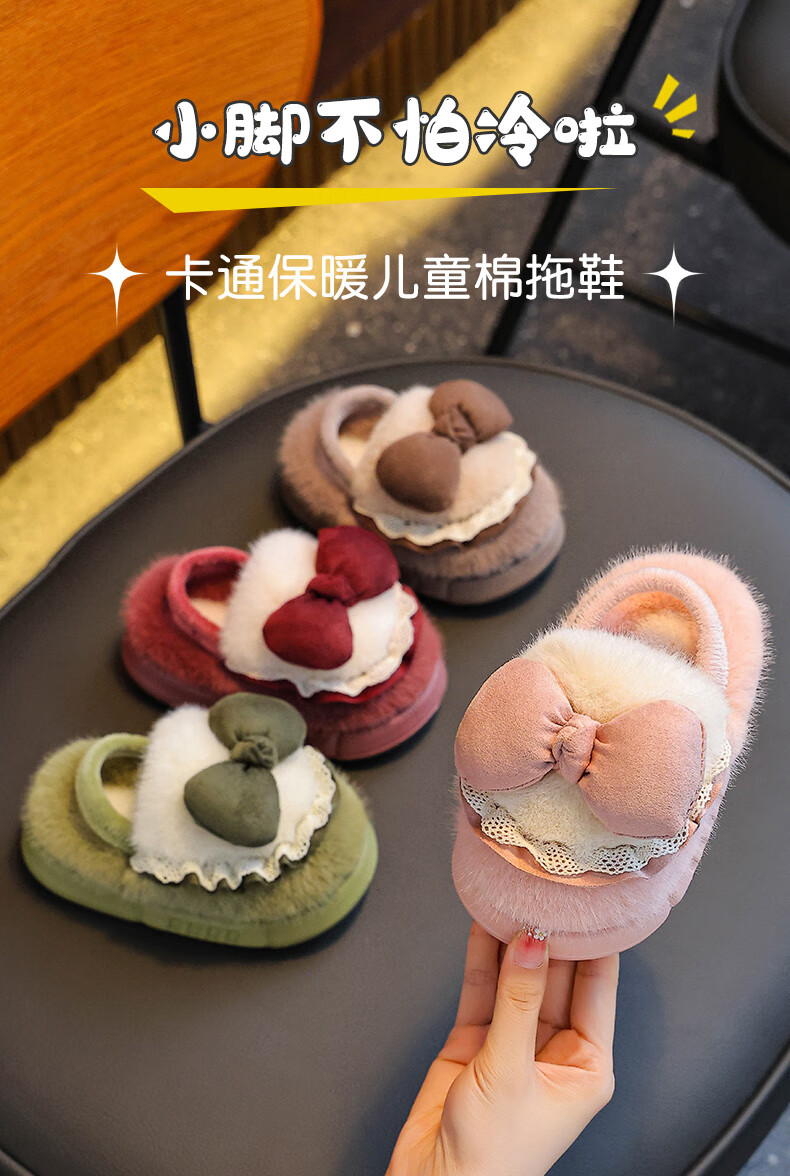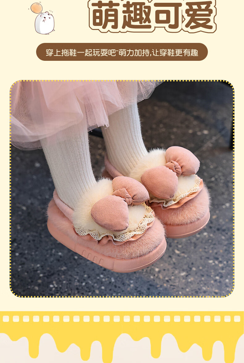 Winter children's cotton slippers for girls and princesses, non-slip EVA warm plus fluffy bow, small and medium-sized children's cotton slippers, upgraded version of environmentally friendly material pink (heel included) 12 28/29 size (inner length 17CM, no rear elastic band