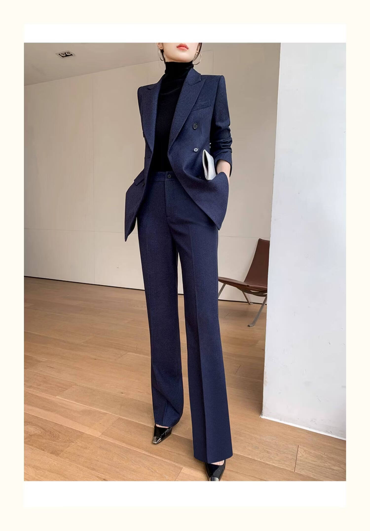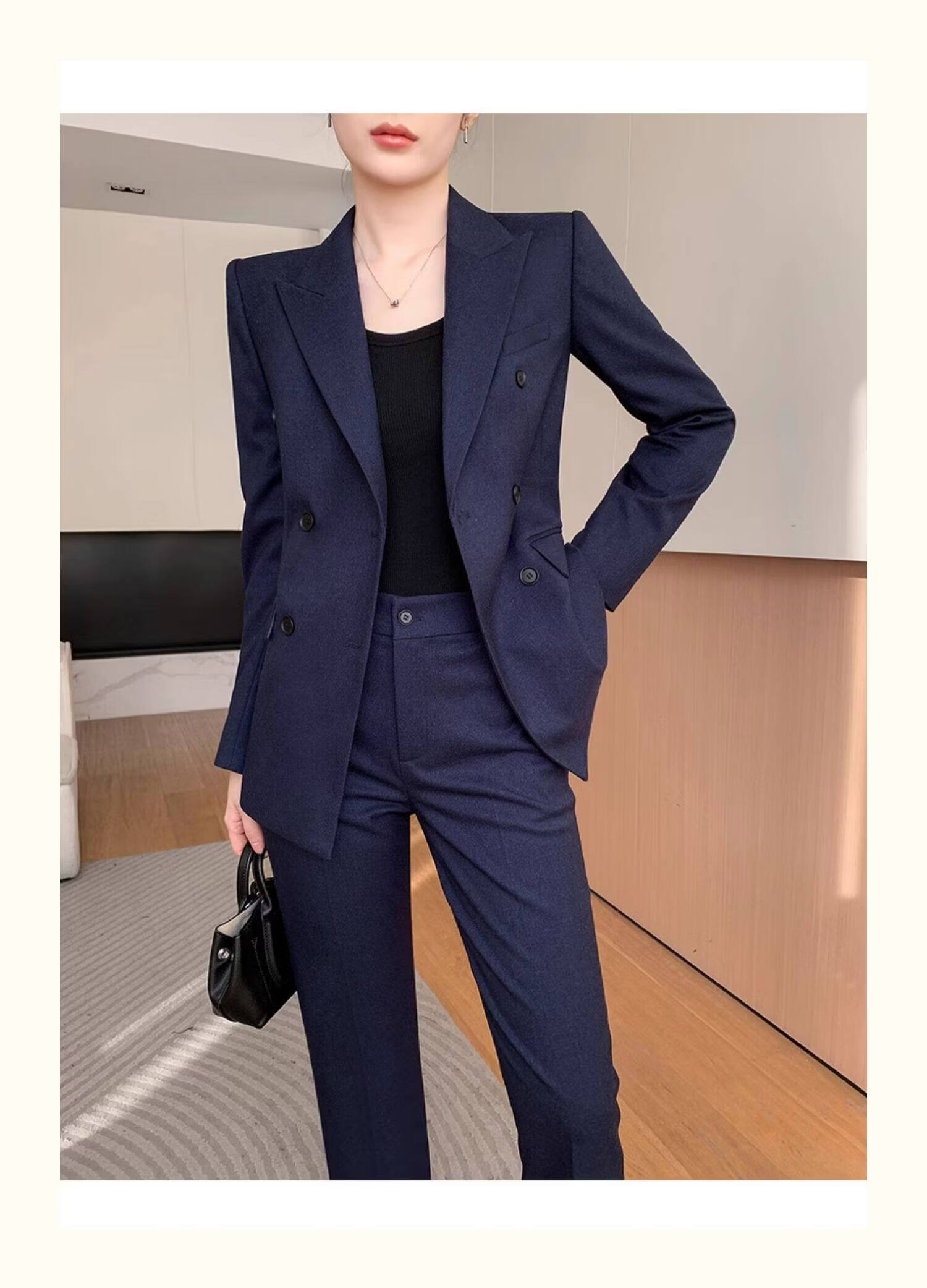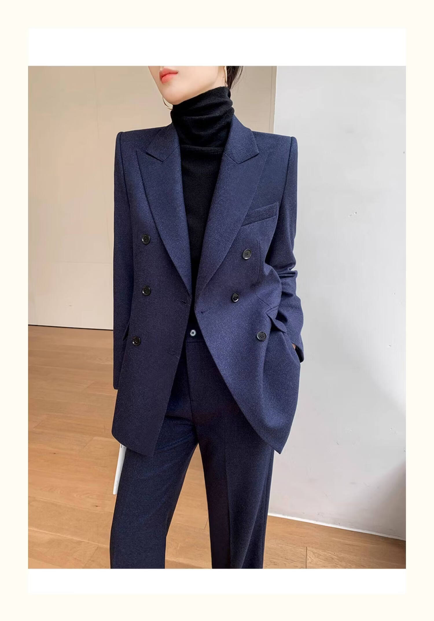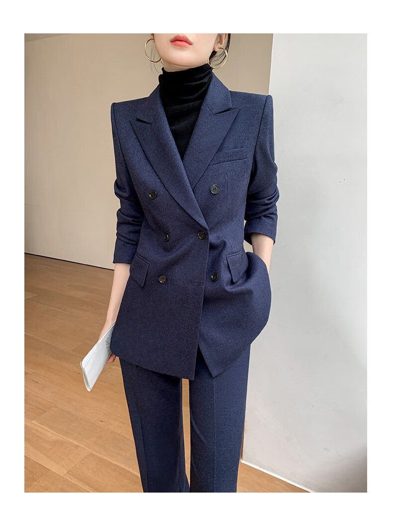 Pierre Cardin casual suit for women in autumn and winter, professional temperament, goddess style wide leg pants, woolen suit for small people, navy top + pants, wide leg pants, autumn and winter S