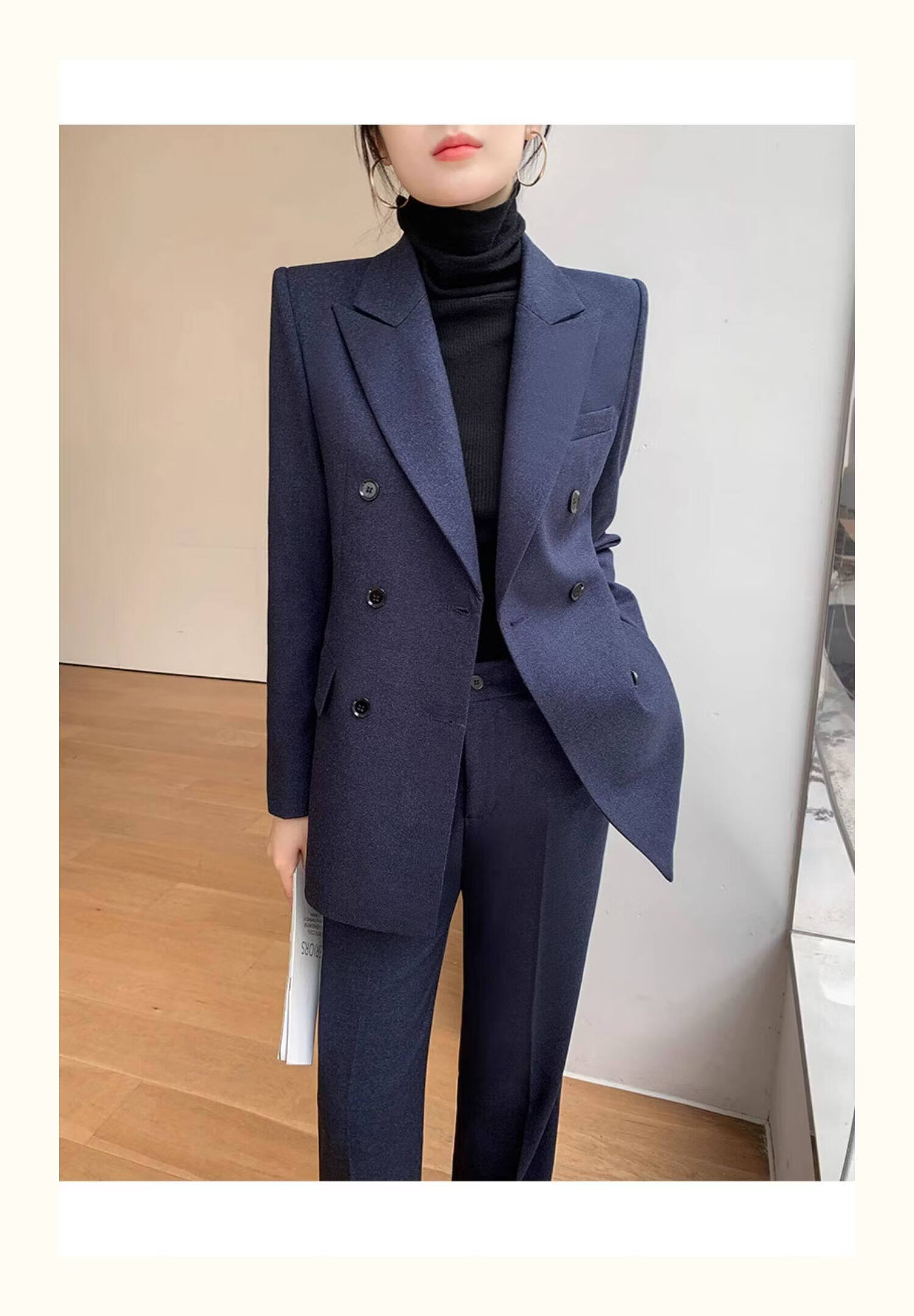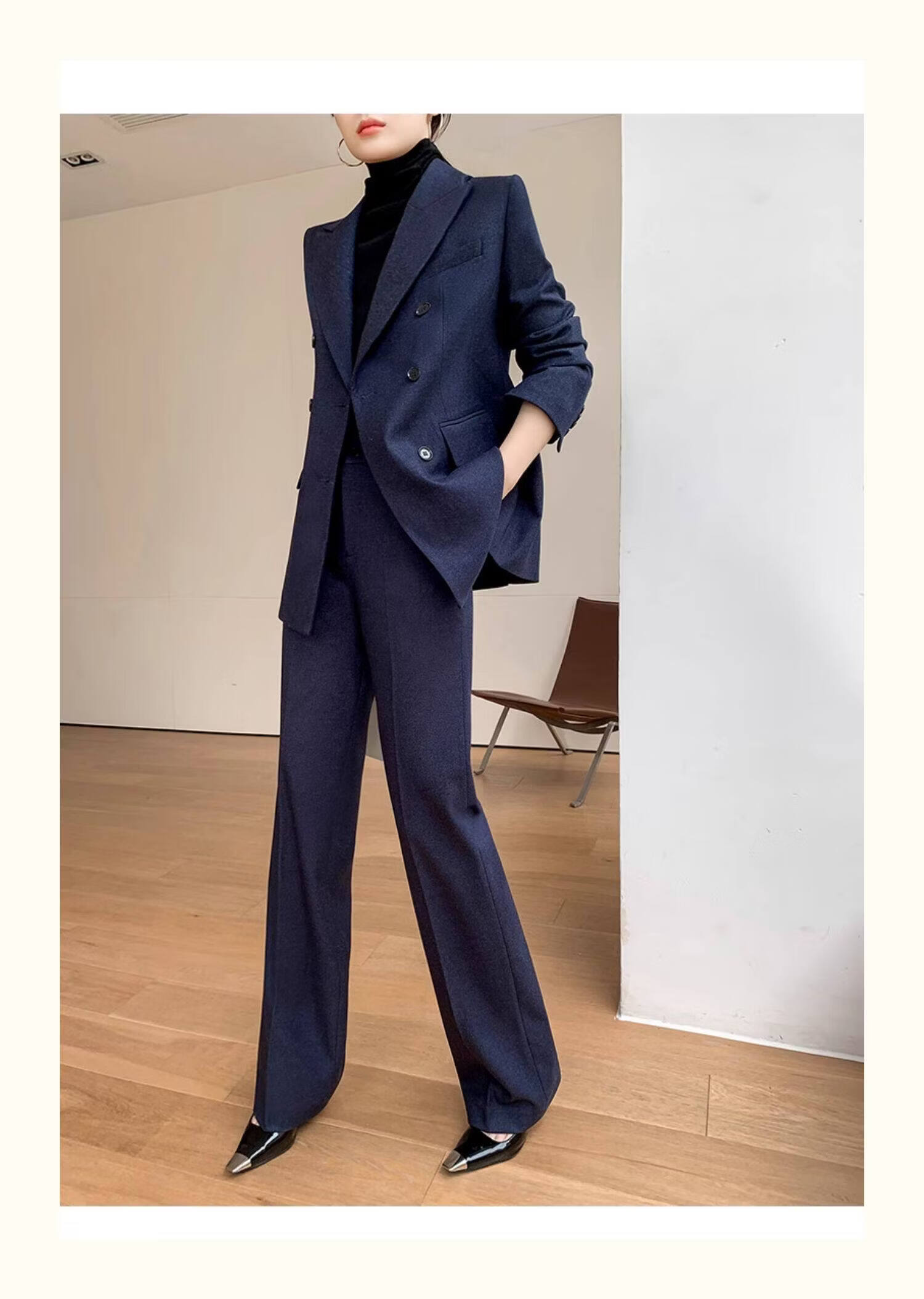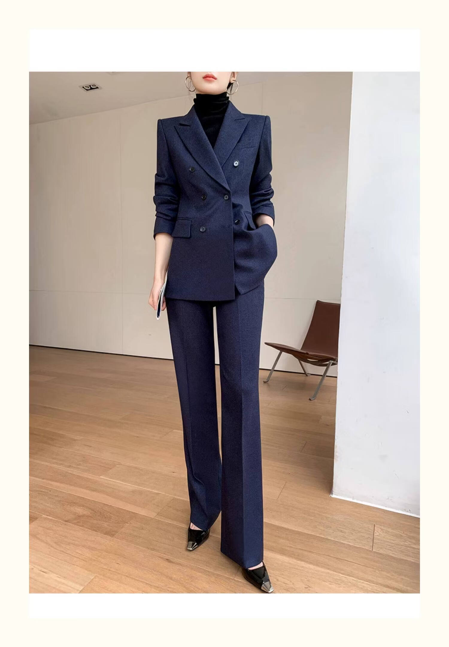 Pierre Cardin casual suit for women in autumn and winter, professional temperament, goddess style wide leg pants, woolen suit for small people, navy top + pants, wide leg pants, autumn and winter S