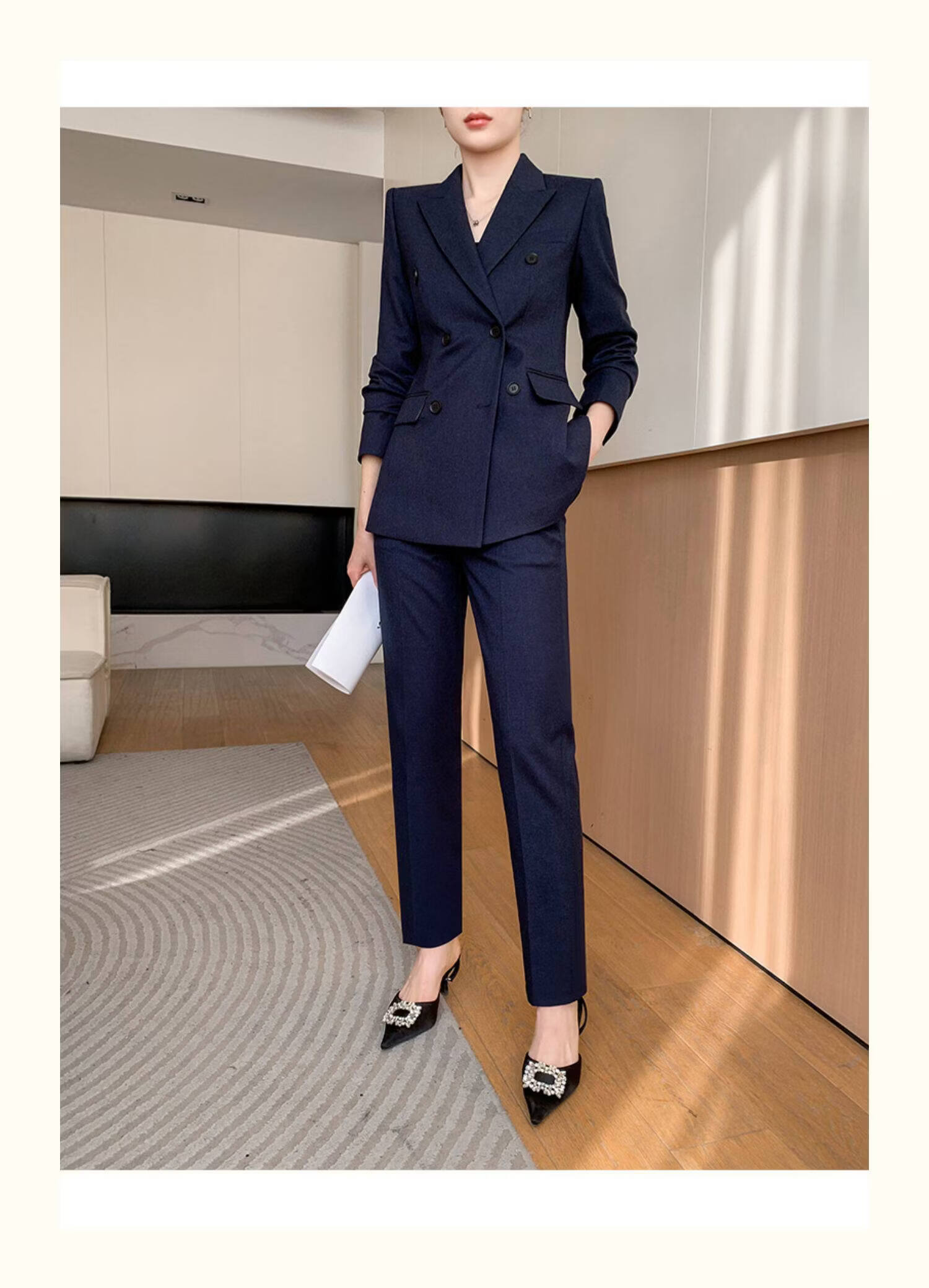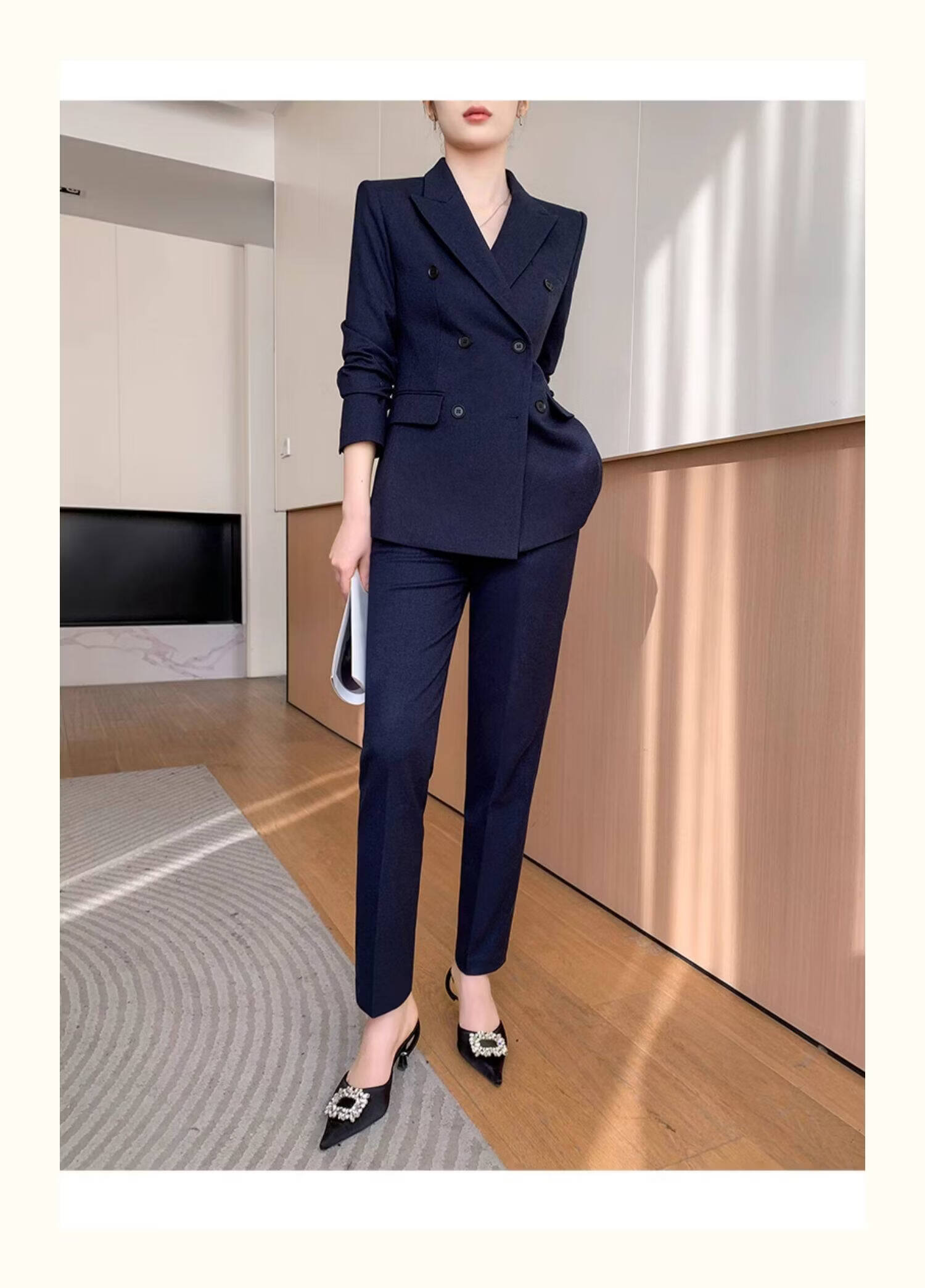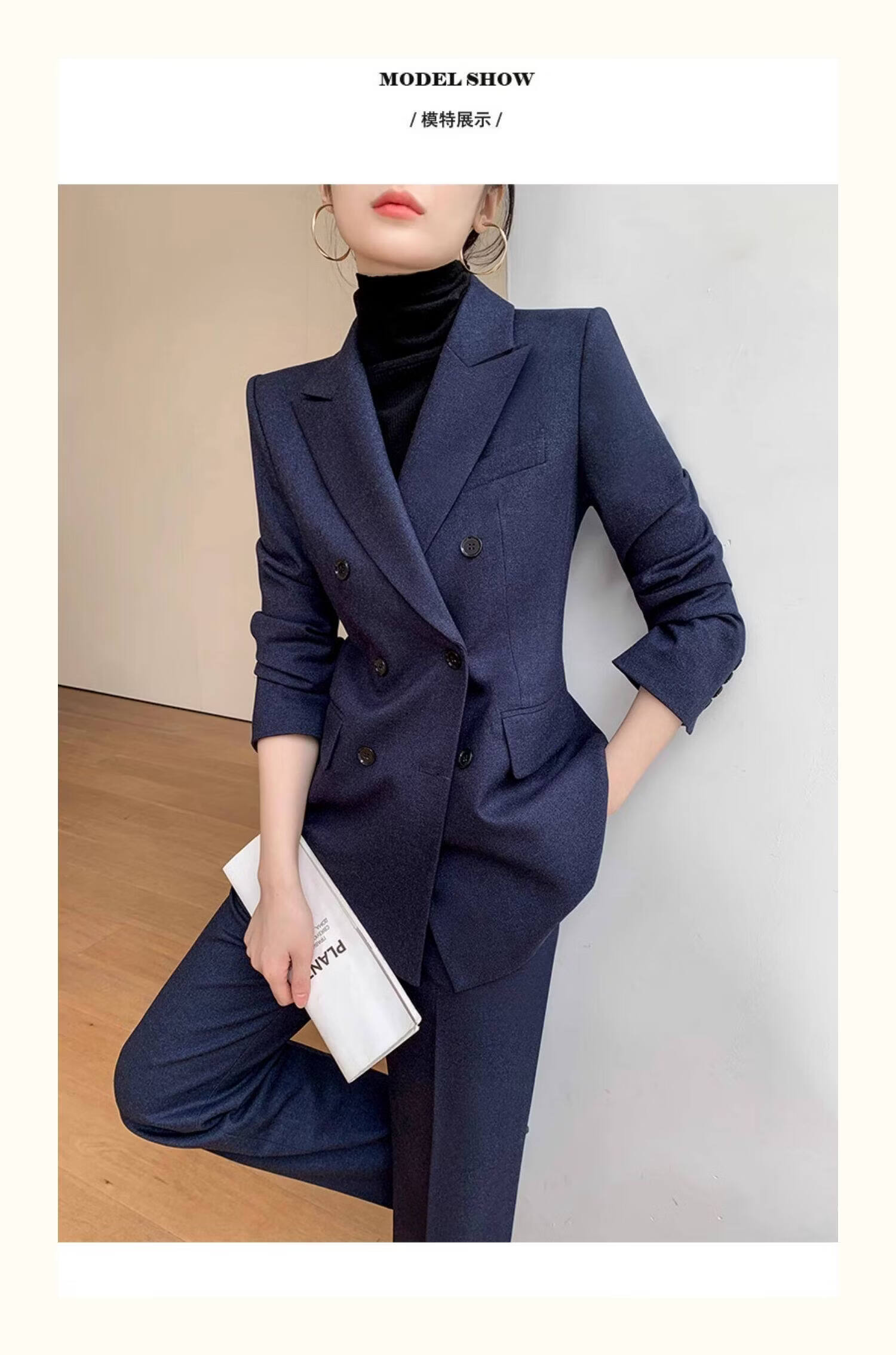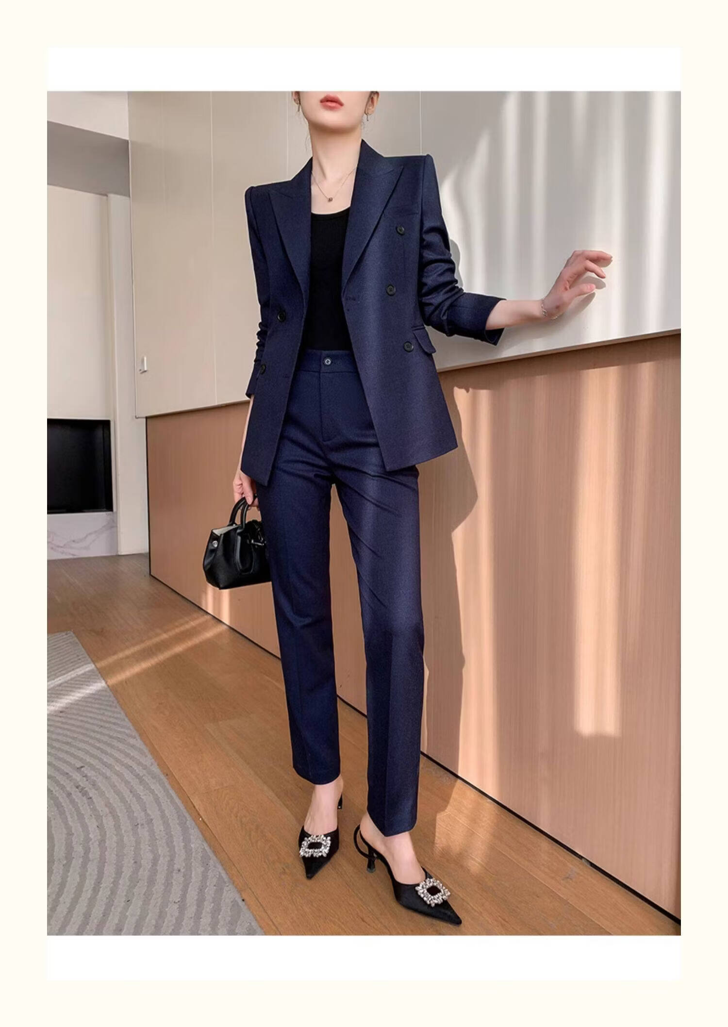 Pierre Cardin casual suit for women in autumn and winter, professional temperament, goddess style wide leg pants, woolen suit for small people, navy top + pants, wide leg pants, autumn and winter S