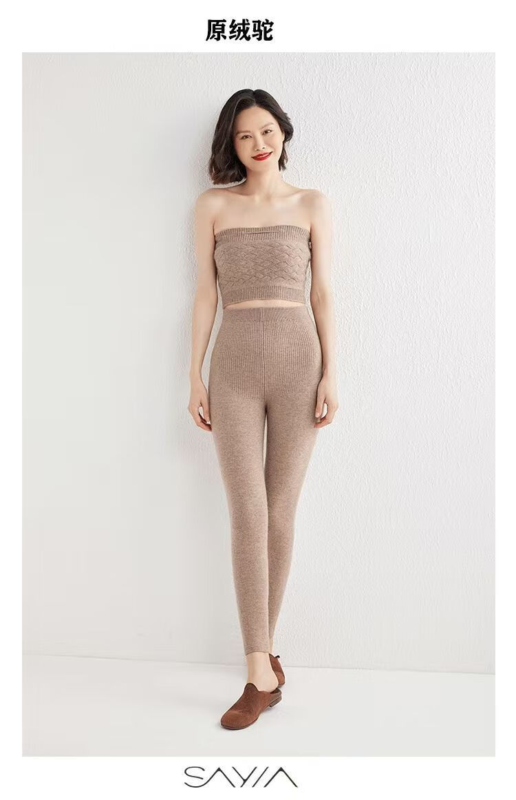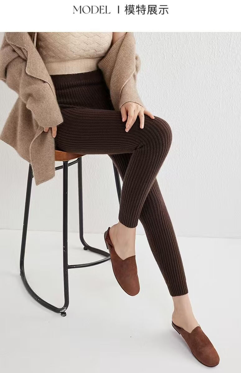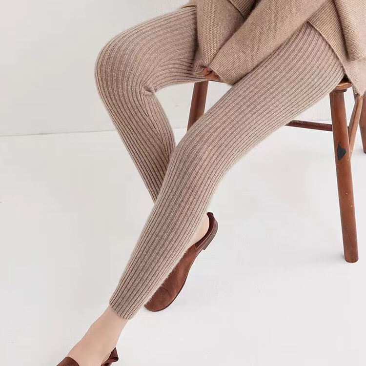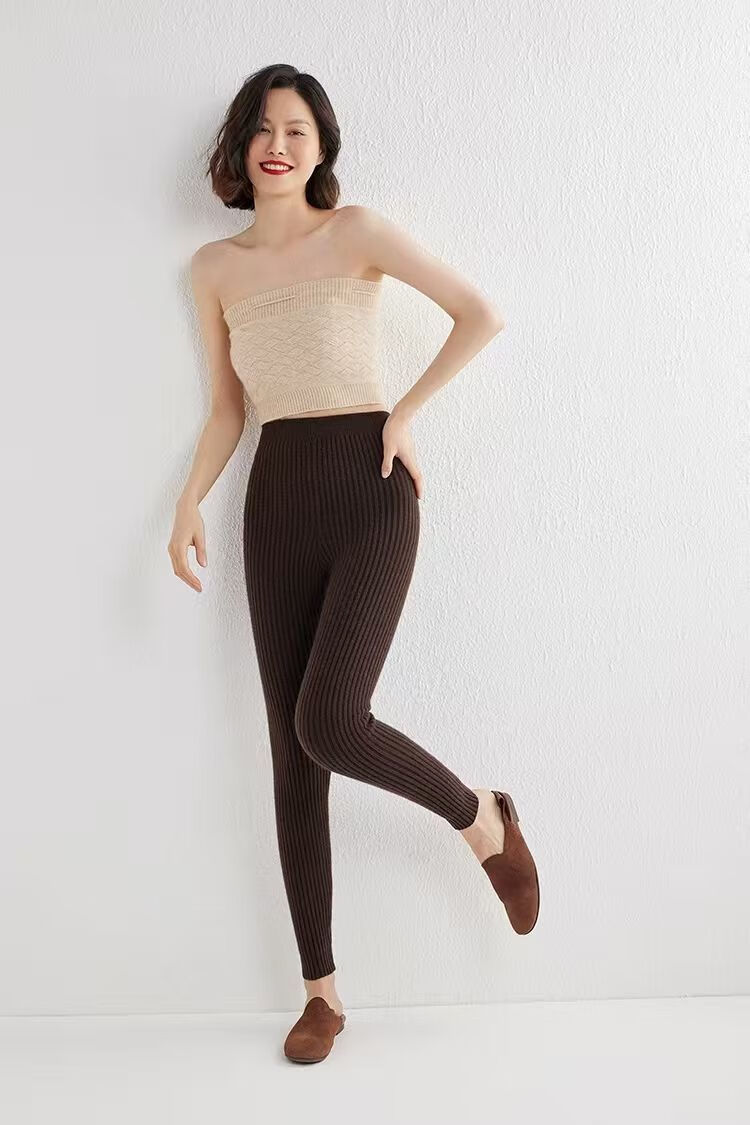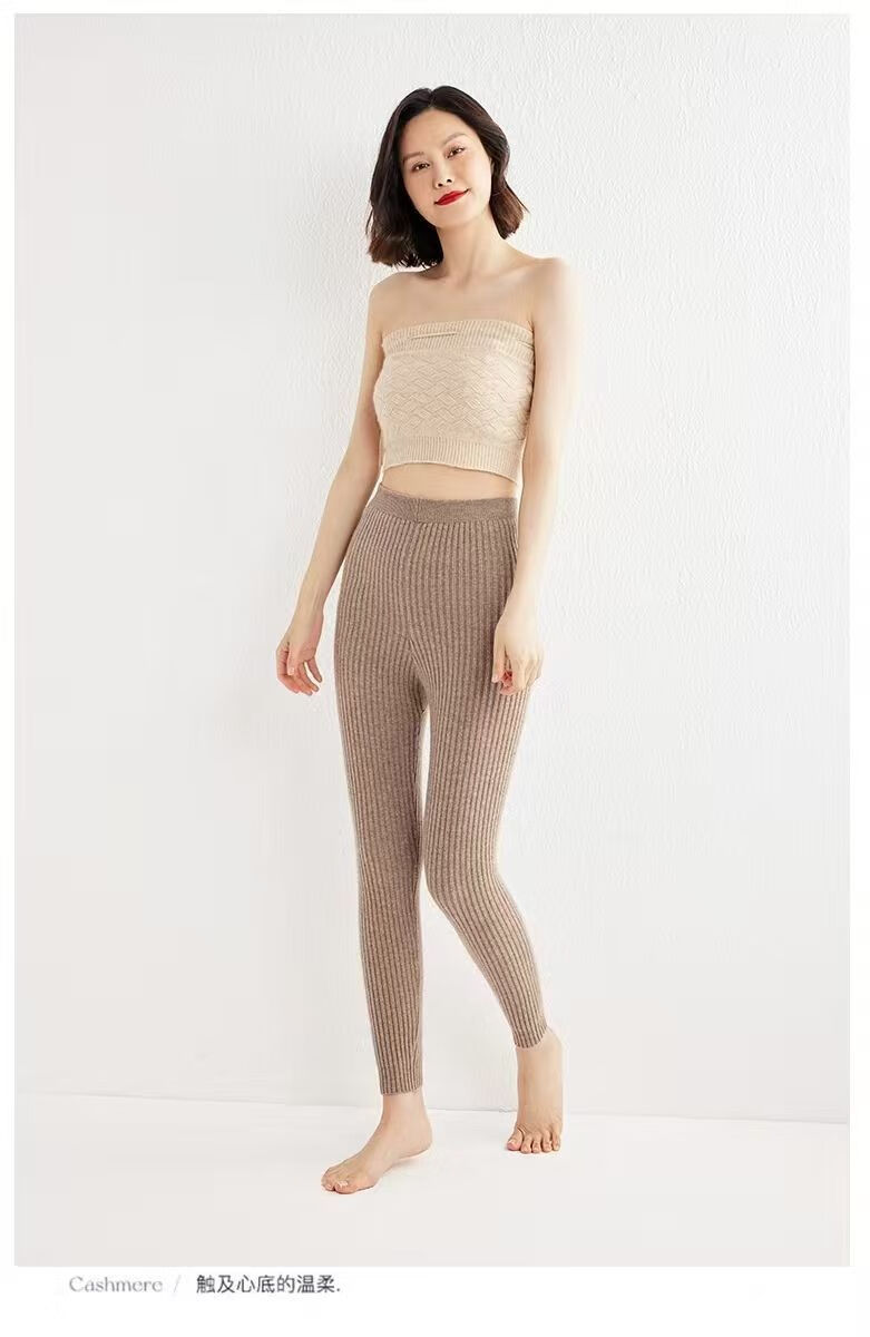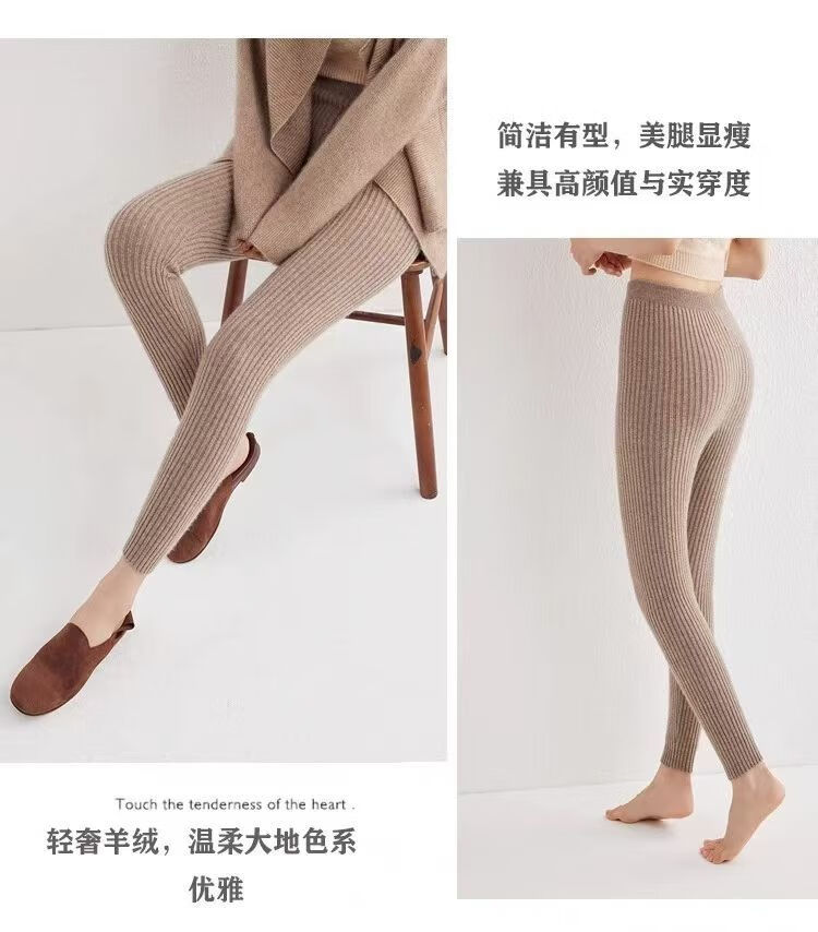 ROMON Autumn and Winter pure cashmere pants for men and women, slim leggings, high-waisted, thickened and warm, seamless pants for inner and outer wear, close-fitting, women's strips, camel S
