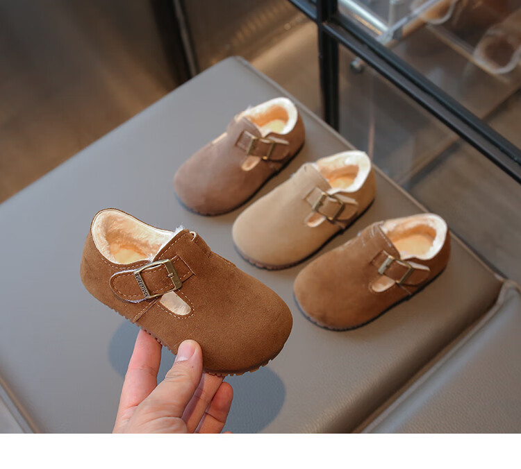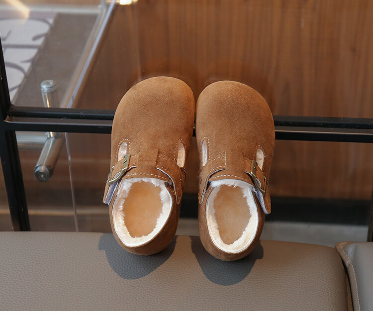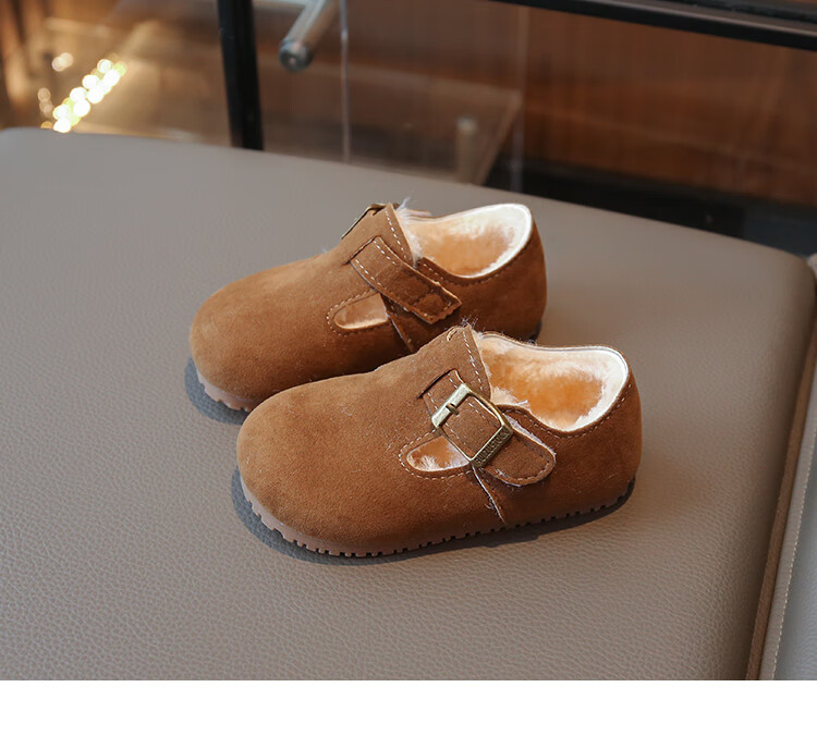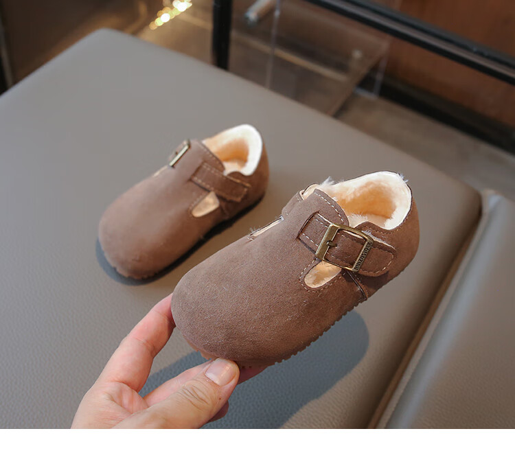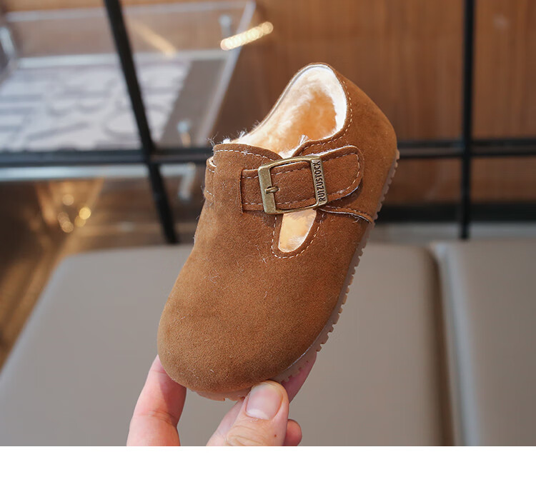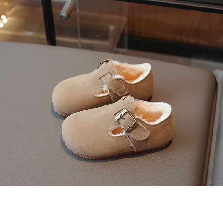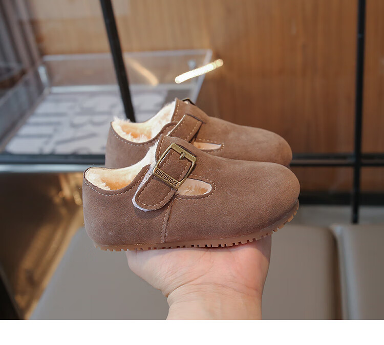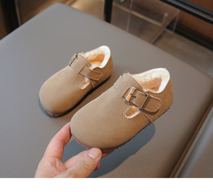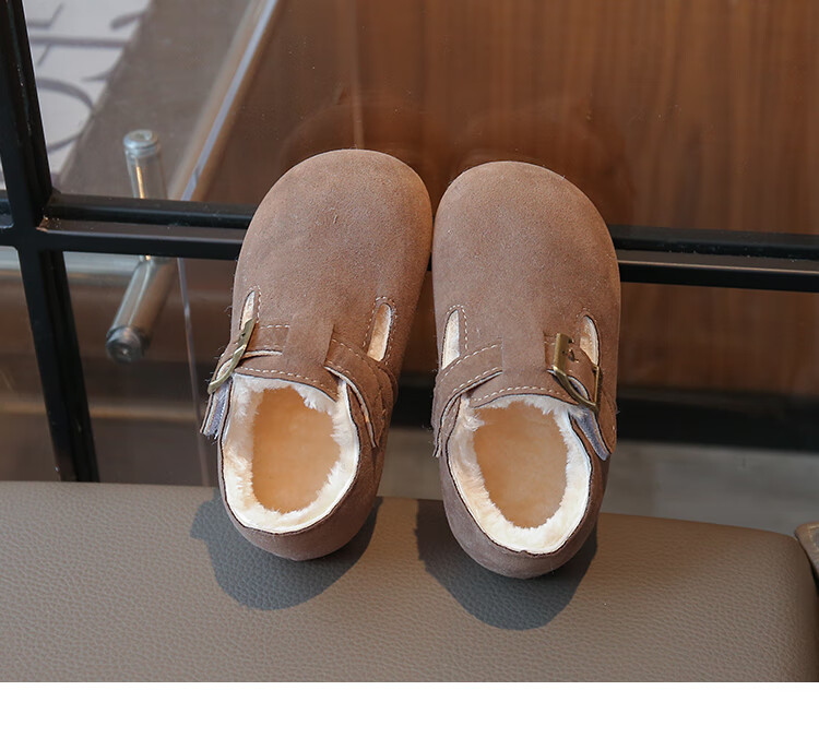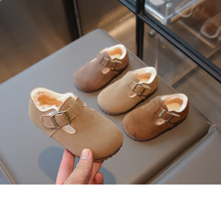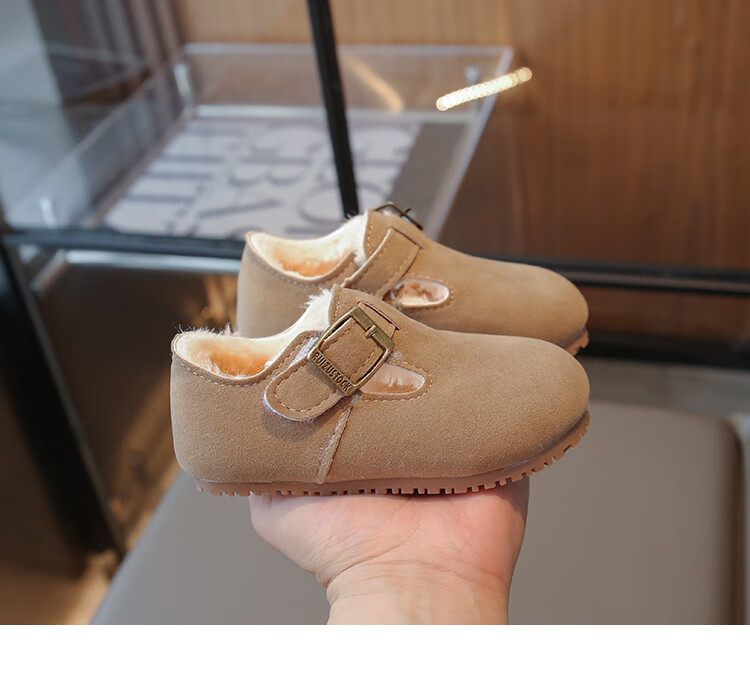 Children's Birkenstock shoes for girls 2025 spring, autumn and winter new style second cotton soft bottom baby bean plus velvet shoes single shoes leather shoes khaki color size 23 inner length 14.4cm
