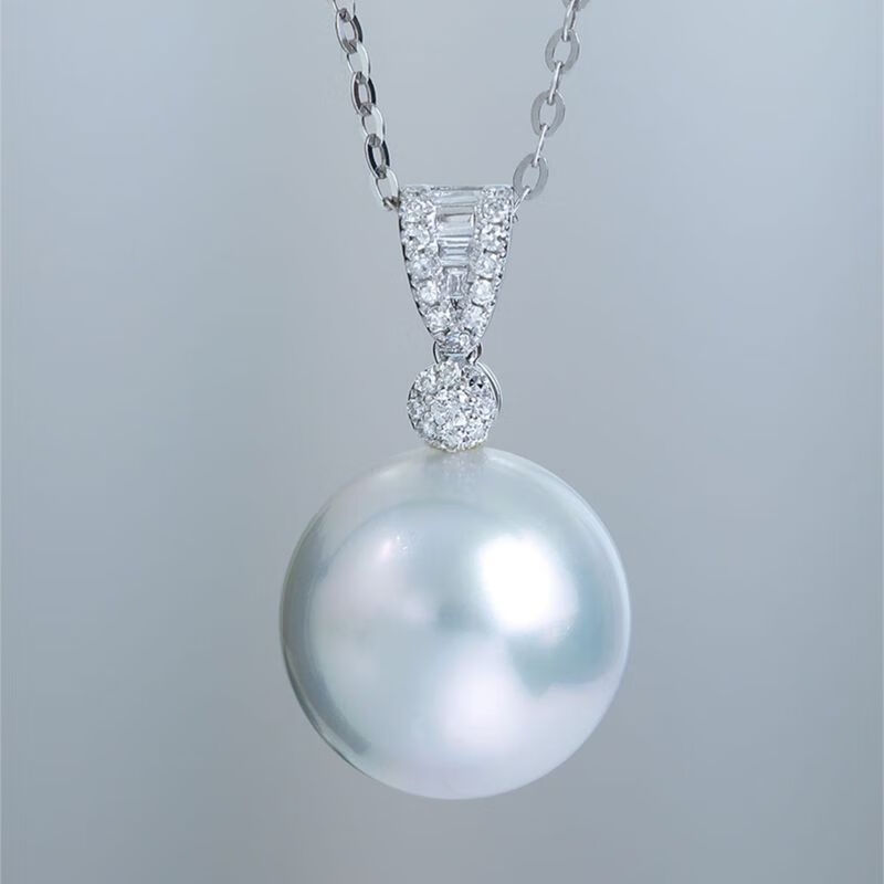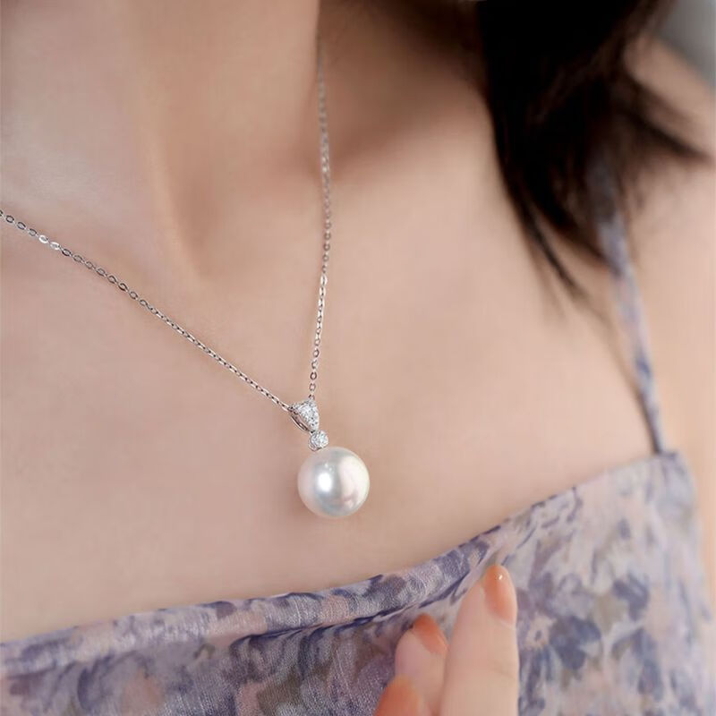 Zhou Taisheng's strong light pearl necklace is light and luxurious, the small light bulb is round, natural single diamond pendant, clavicle chain, Australian white, elegant and gentle, silver