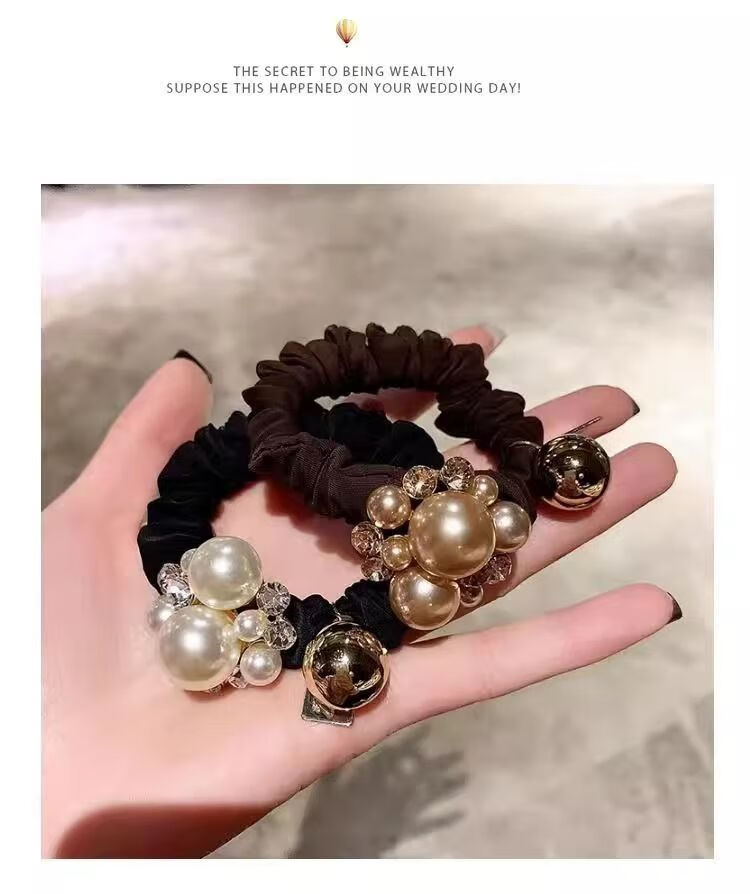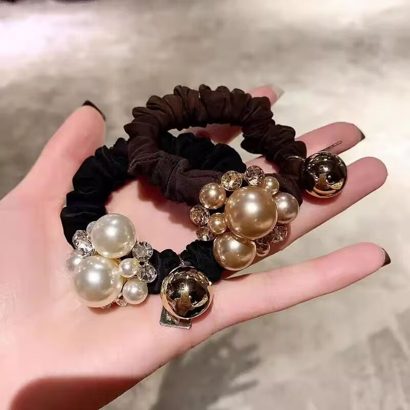 Gaenbei 2025 new Korean style pearl headband hair band for women, high-end hair tie, ball head artifact, rubber band hair accessory, 2 pleated pearl hair bands, white + champagne color