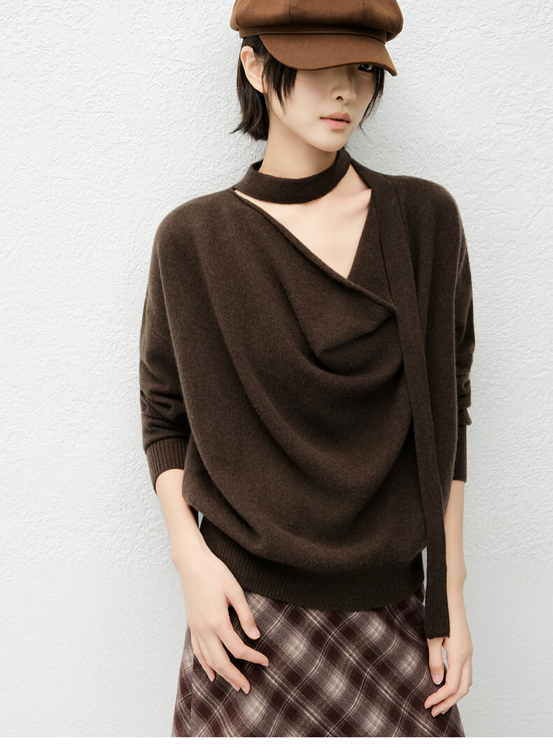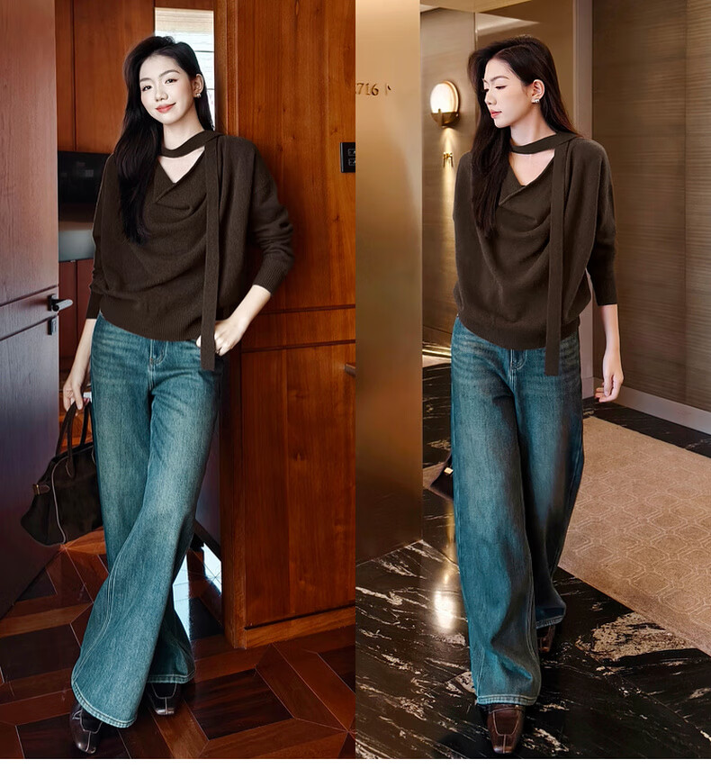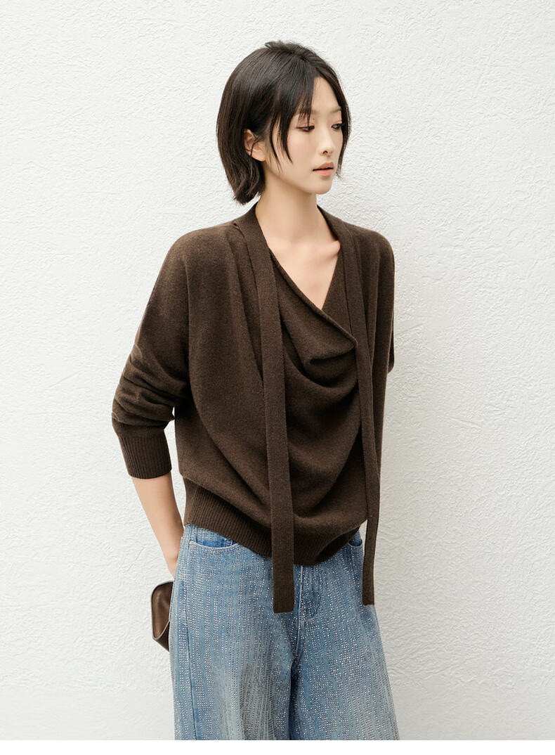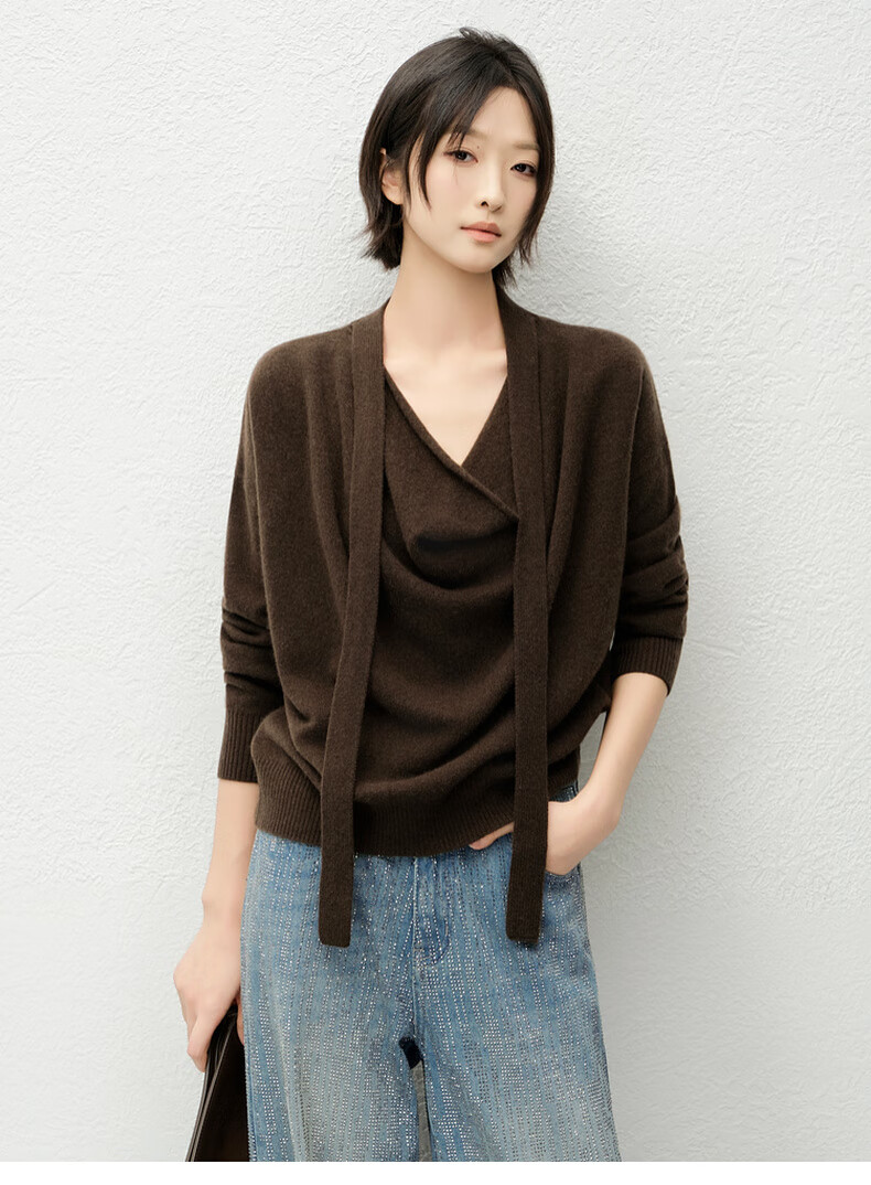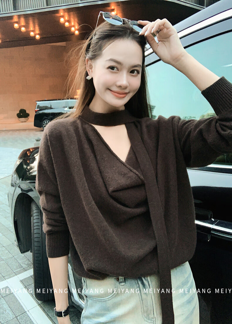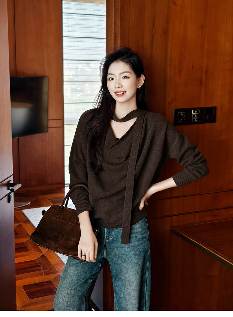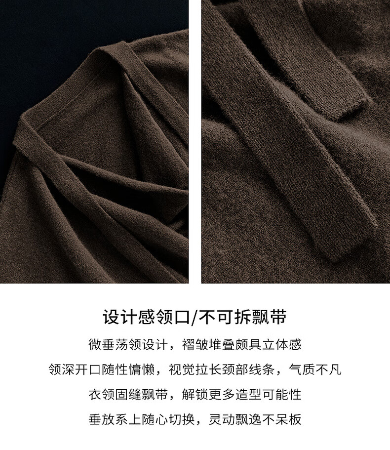 MEIYANG Breeze Knitted Sweater New Australia Merino Wool Design Pile Collar Ribbon Sweater Brown M