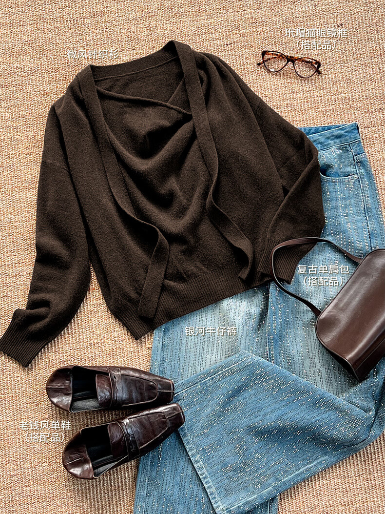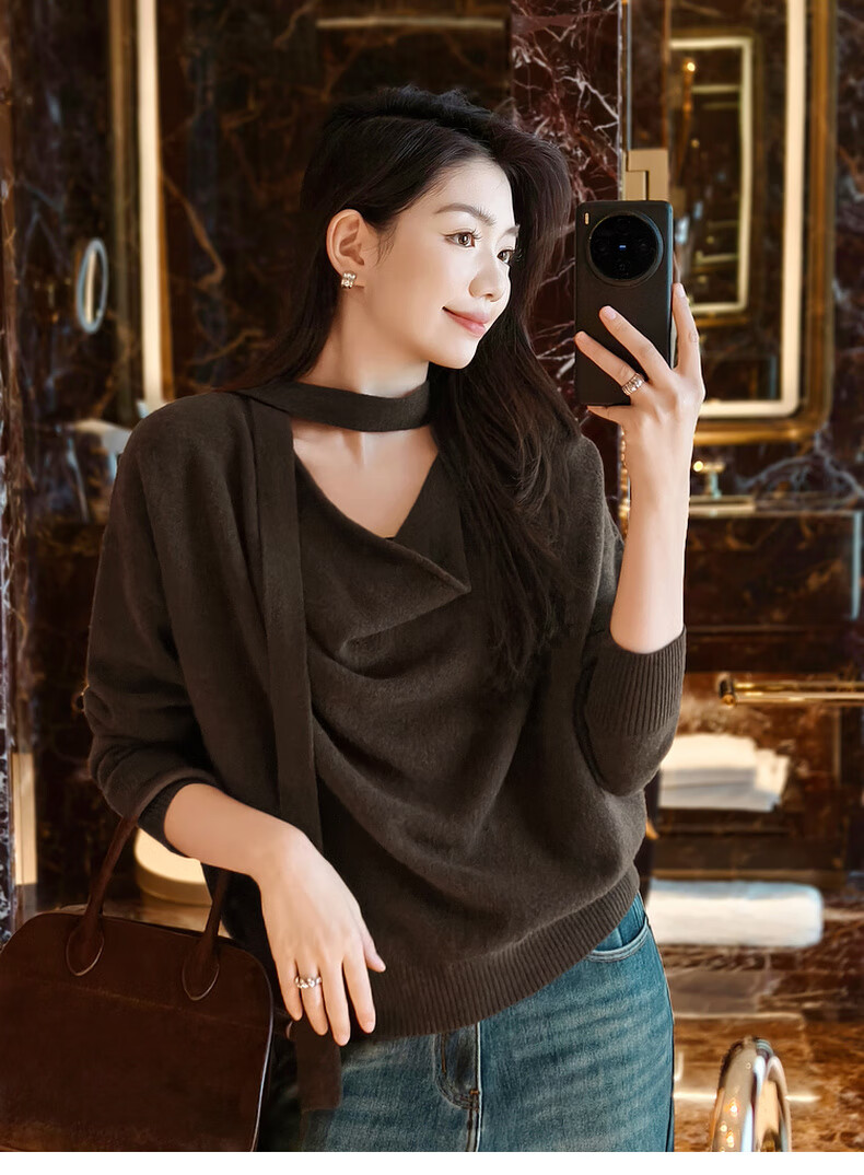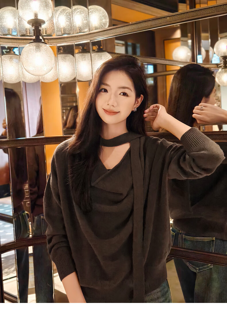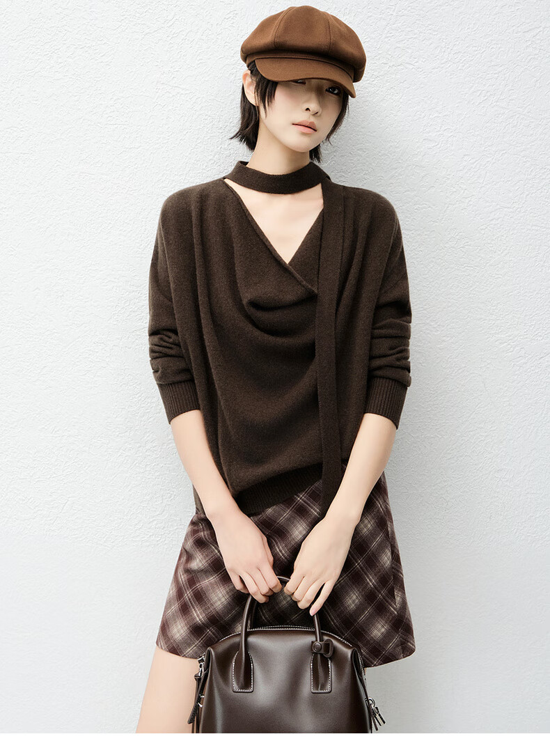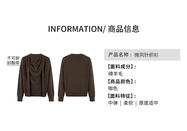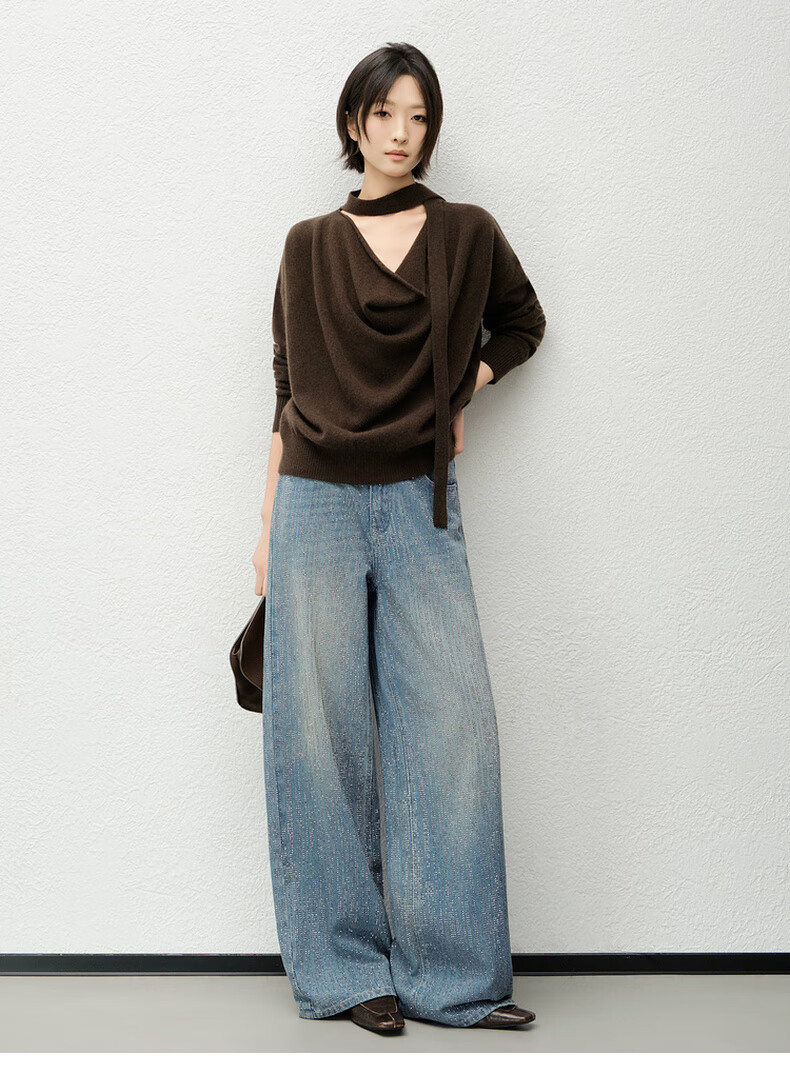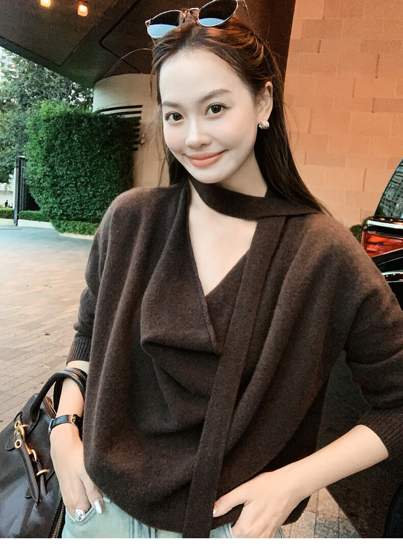 MEIYANG Breeze Knitted Sweater New Australia Merino Wool Design Pile Collar Ribbon Sweater Brown M