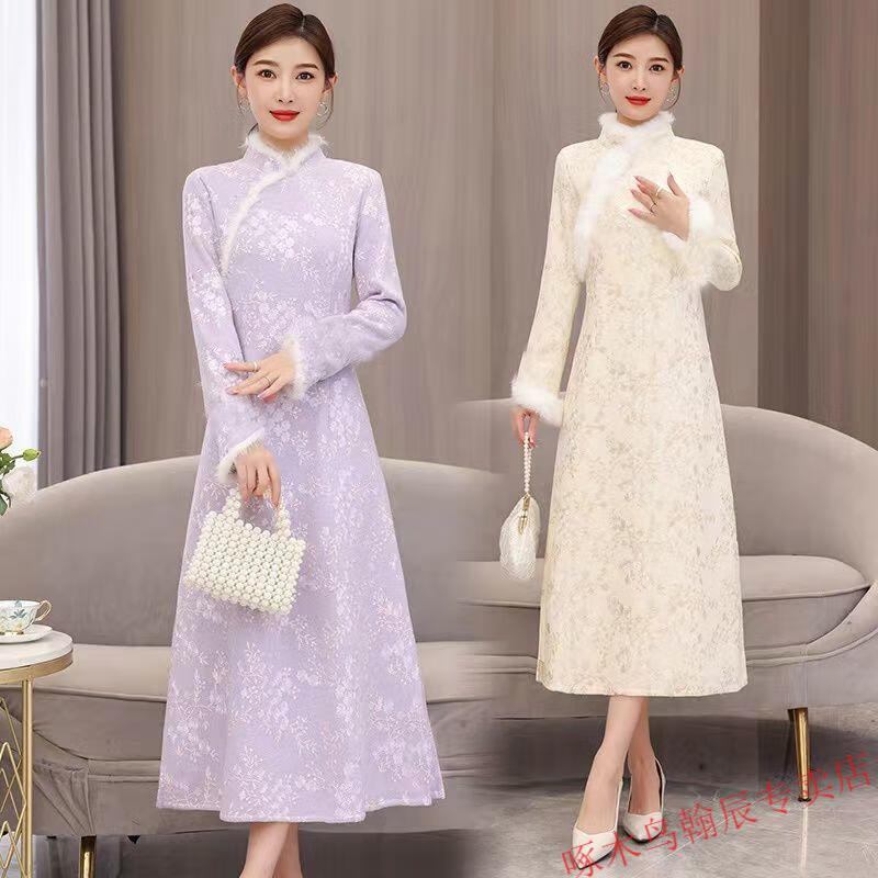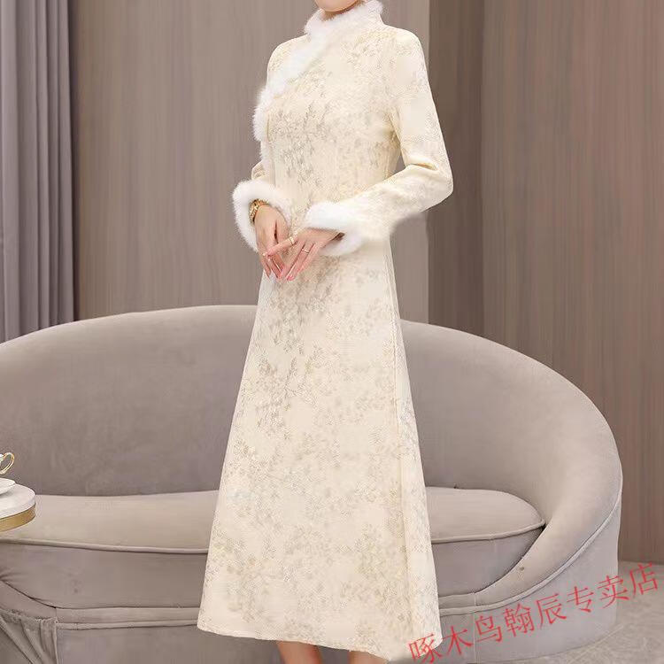 Woodpecker plus velvet thin new Chinese style cheongsam autumn and winter new elegant mother's daily mid-length improved cheongsam dress apricot M recommended 80-95Jin Jin equals 0.5 kg