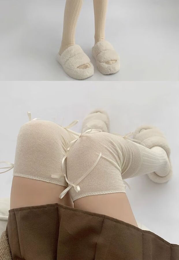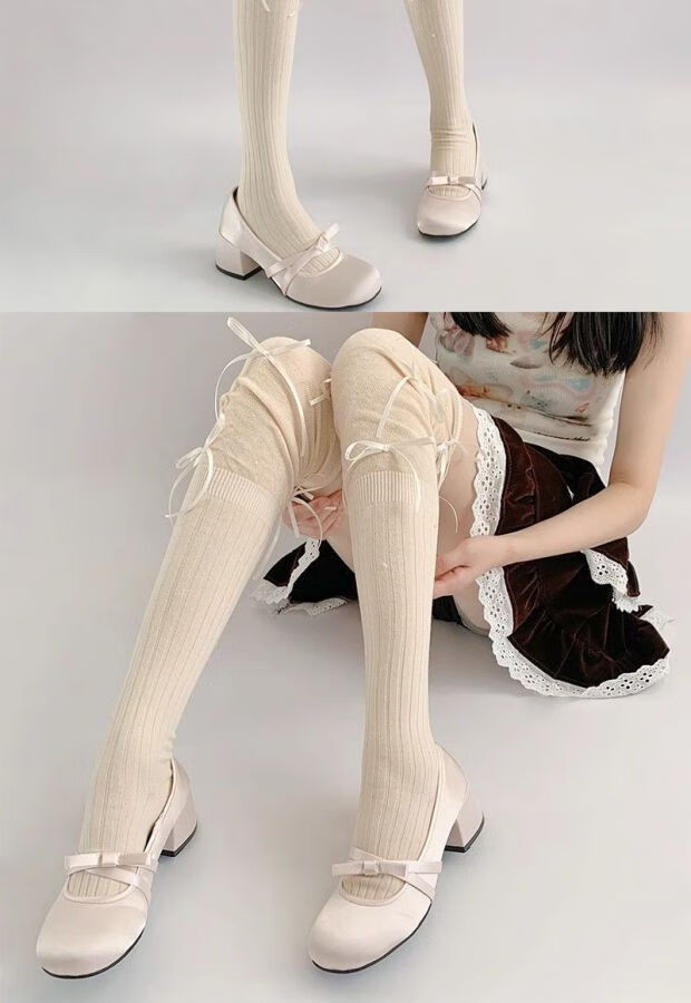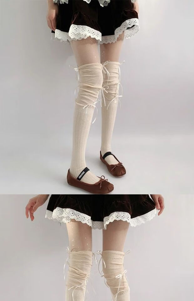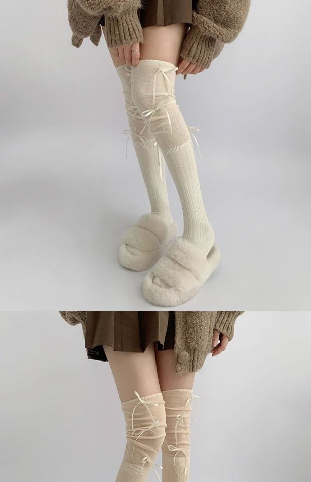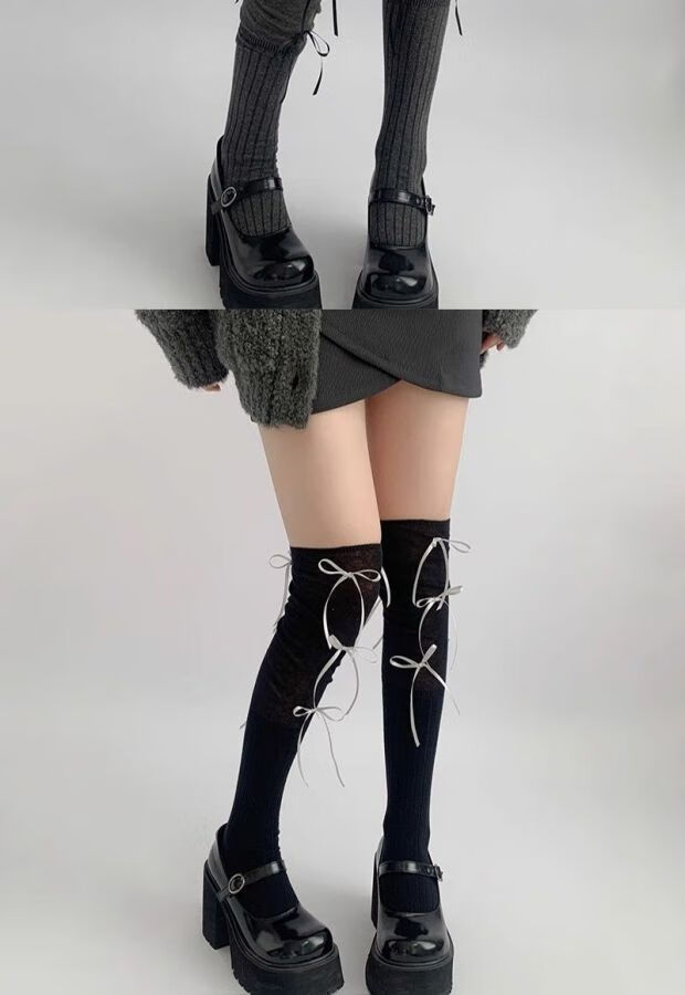 Jane Deiune stockings for women spring and autumn spliced bow-knot pile socks Lolita over-knee socks slim pure lust style jk Japanese style black + gray bow-knot over-the-knee socks one-size-fits-all transforms into comic legs in seconds suitable for 70-150 Jin Jin is equal to 0.5 kg