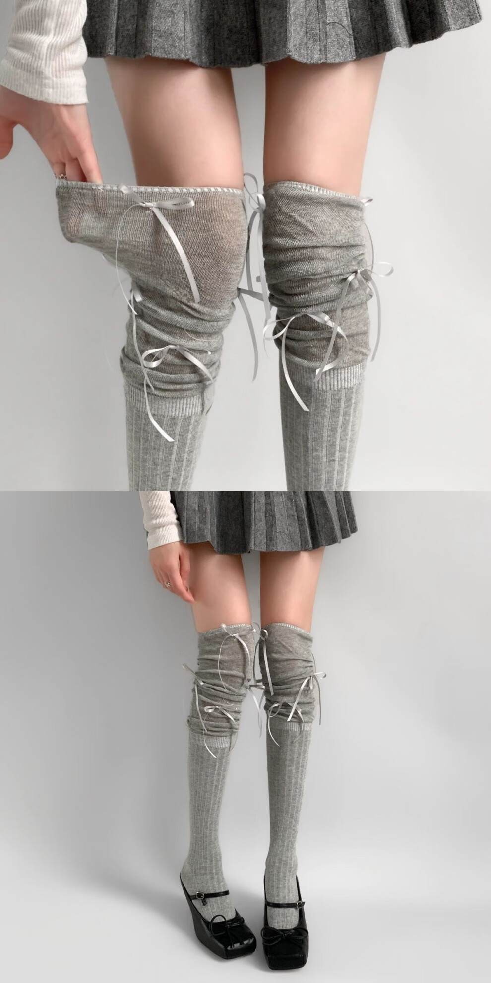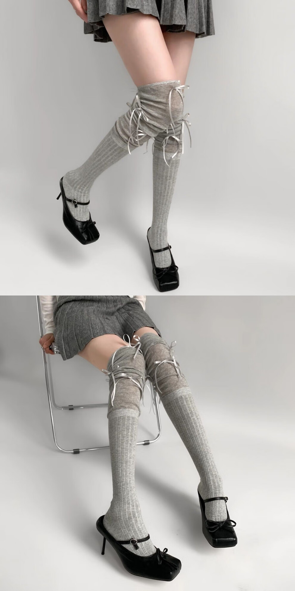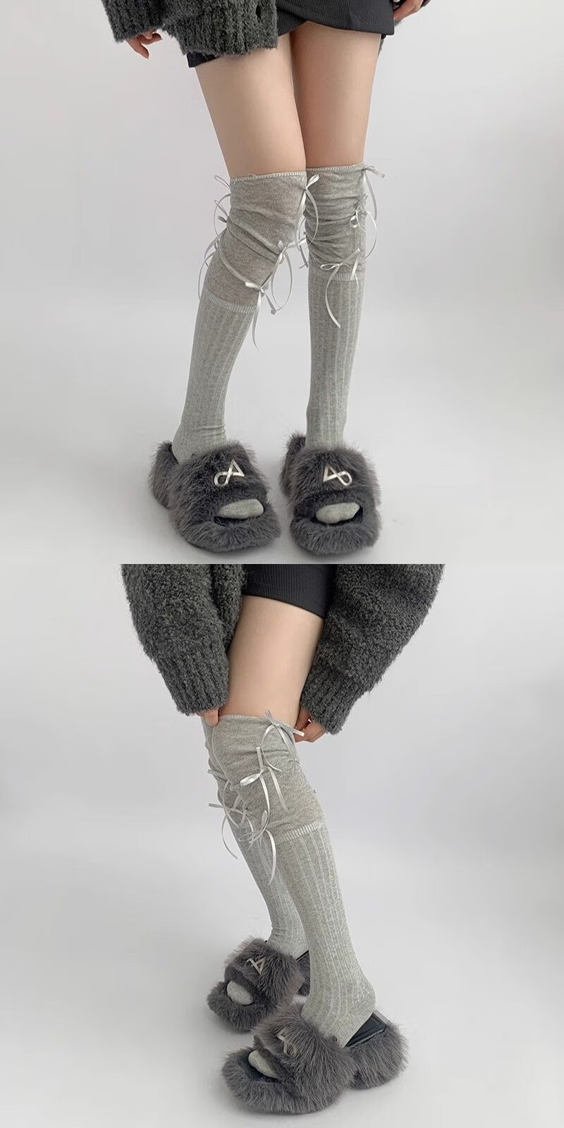 Jane Deiune stockings for women spring and autumn spliced bow-knot pile socks Lolita over-knee socks slim pure lust style jk Japanese style black + gray bow-knot over-the-knee socks one-size-fits-all transforms into comic legs in seconds suitable for 70-150 Jin Jin is equal to 0.5 kg