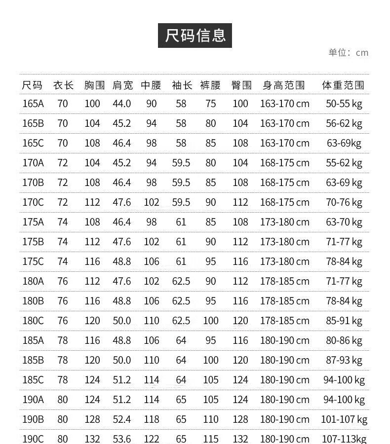 China (cm) 165 / 88-90 170 / 96-98 175 / 108-110 180 / 118-122 185 / 126-130