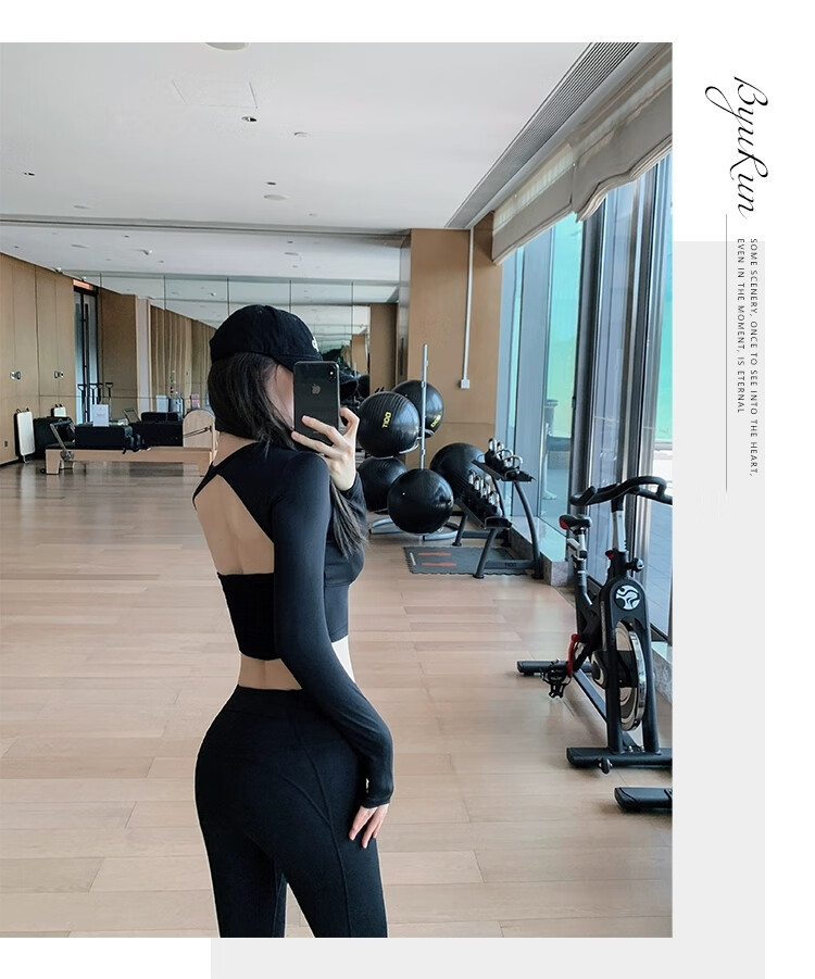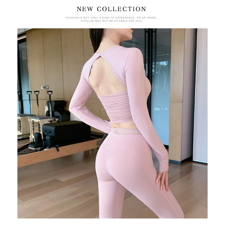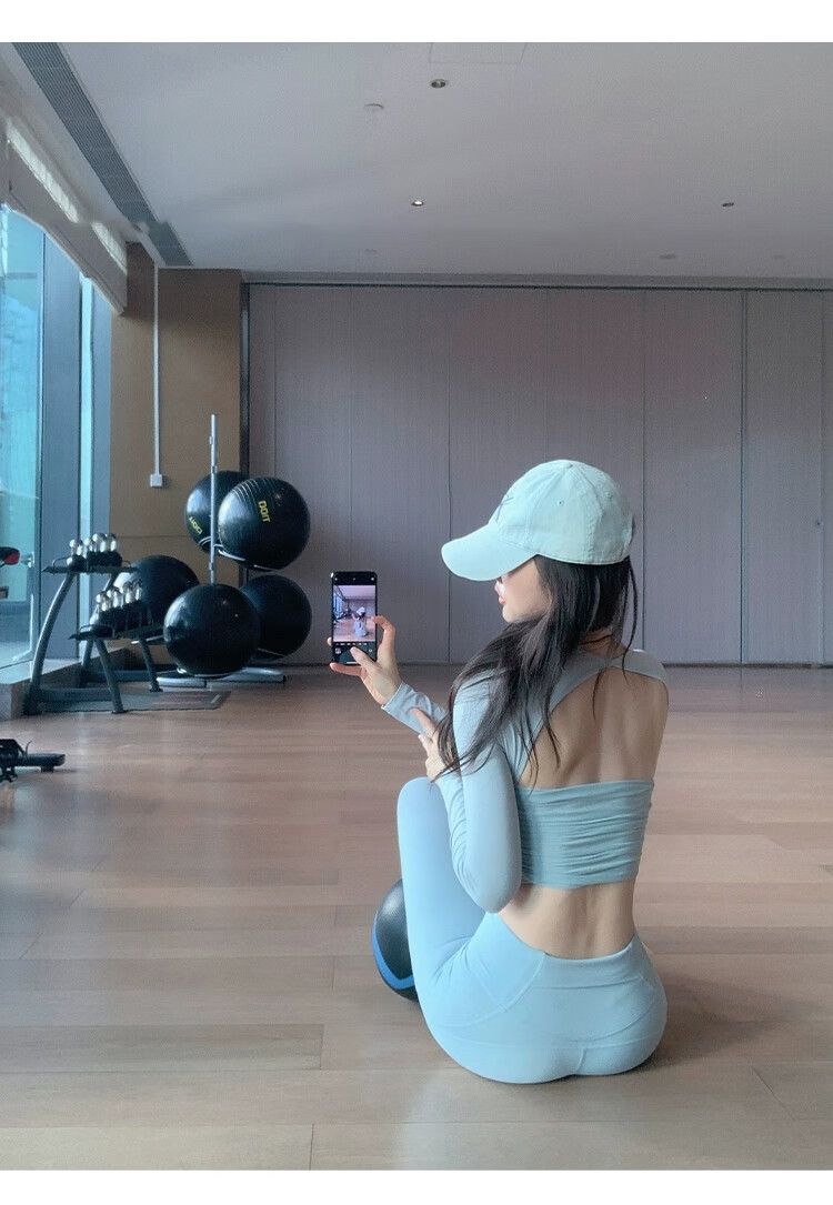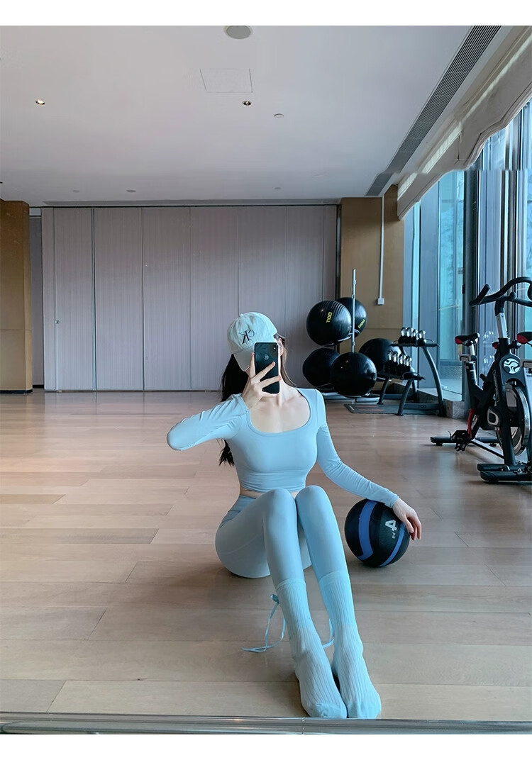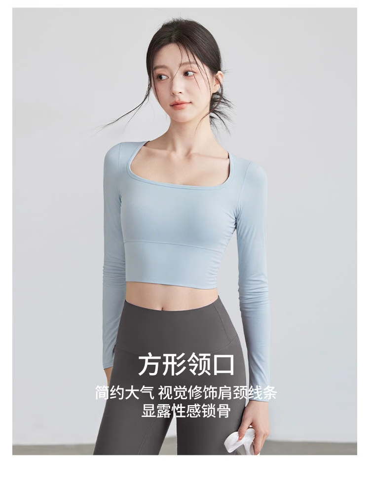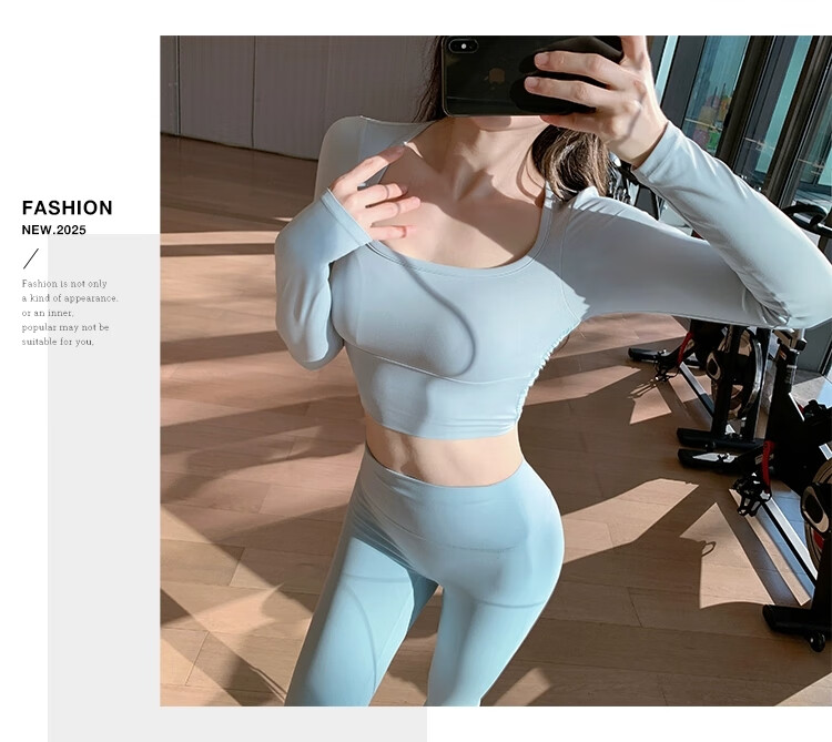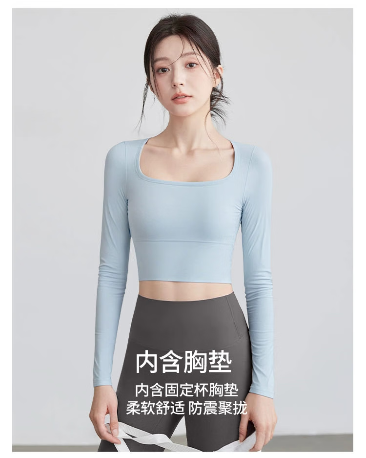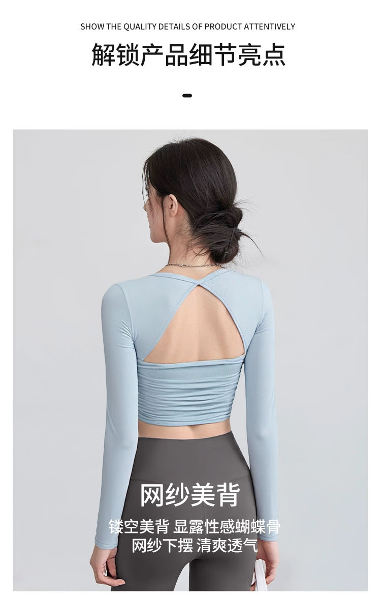 Autumn and winter yoga clothing, integrated chest pad, running training, long-sleeved, beautiful back, hollow fitness clothing, Pilates outer wear, light blue S