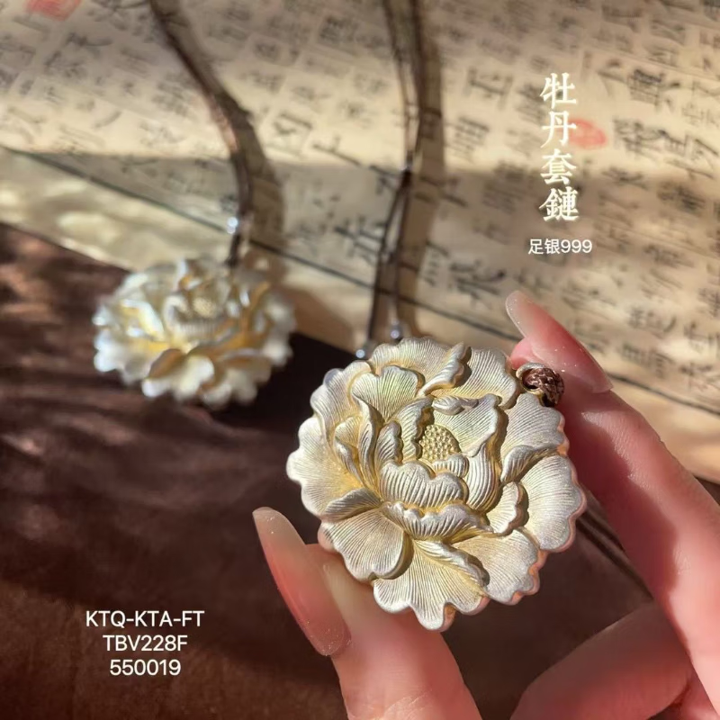 Laohuangxiang solid silver 999 peony flower solid pendant necklace for women, rich, light and luxurious, versatile sterling silver necklace gift