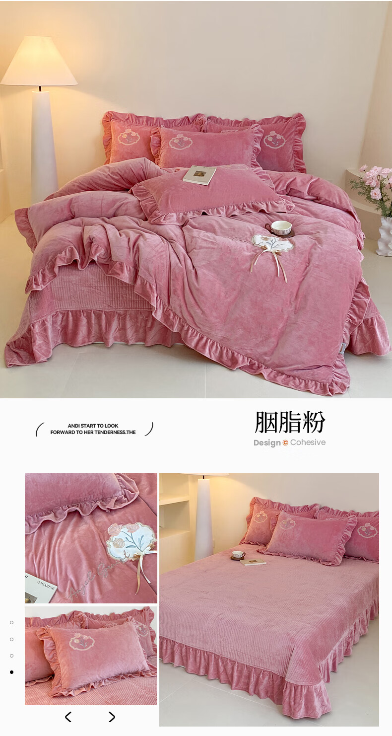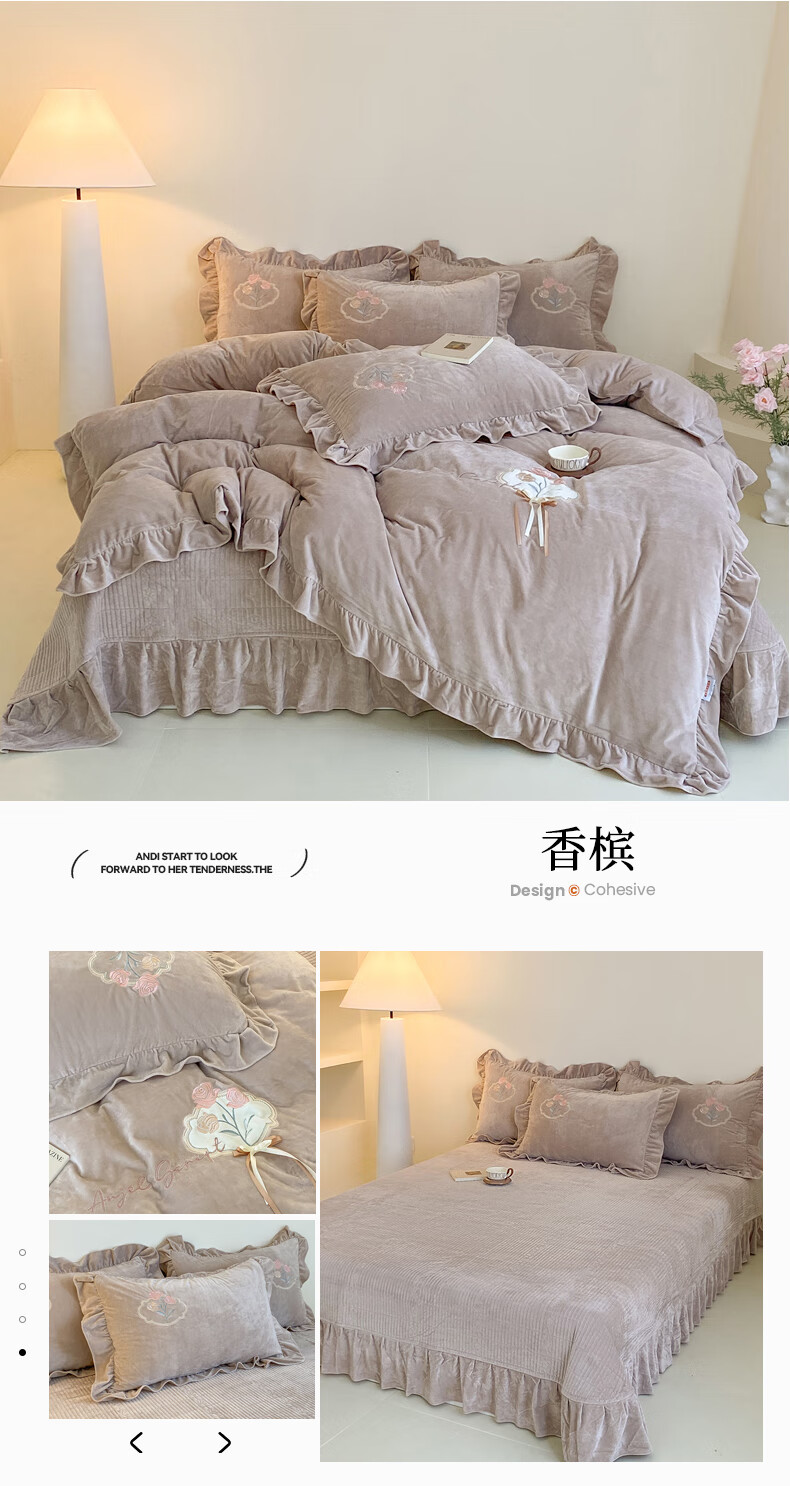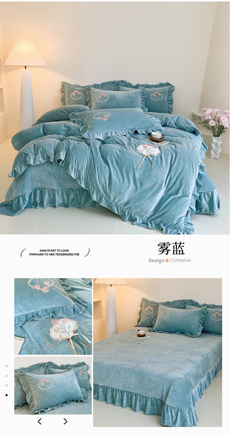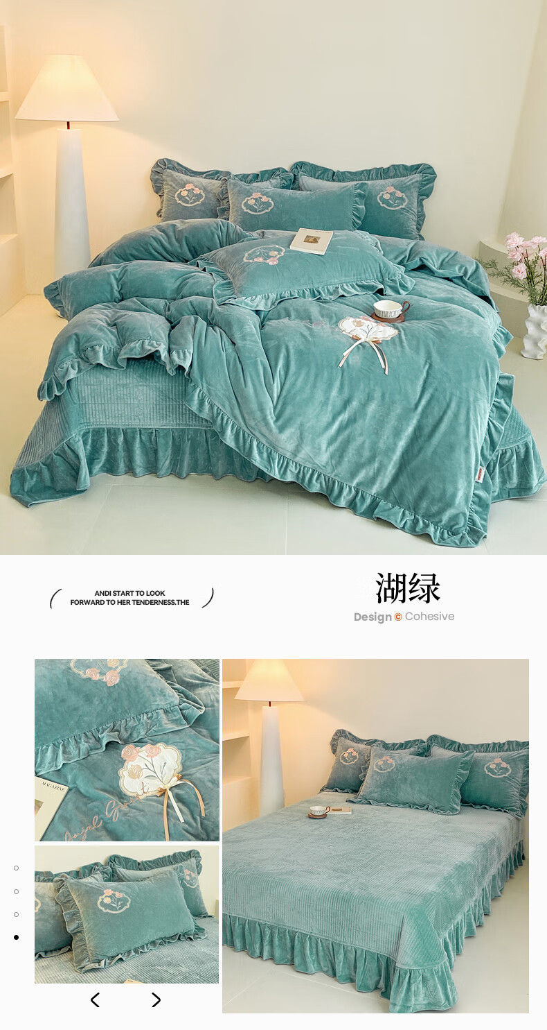 Hongdou 2025 new autumn and winter baby velvet bow patch embroidered bed cover style four-piece set light luxury elegant lace design bow patch embroidery - lake green four-piece set 1.5 bed cover style (quilt cover 200*230cm)