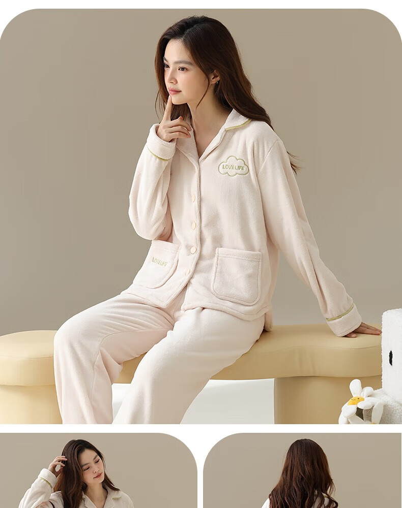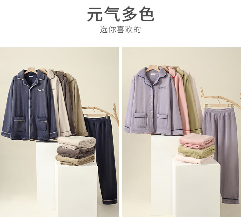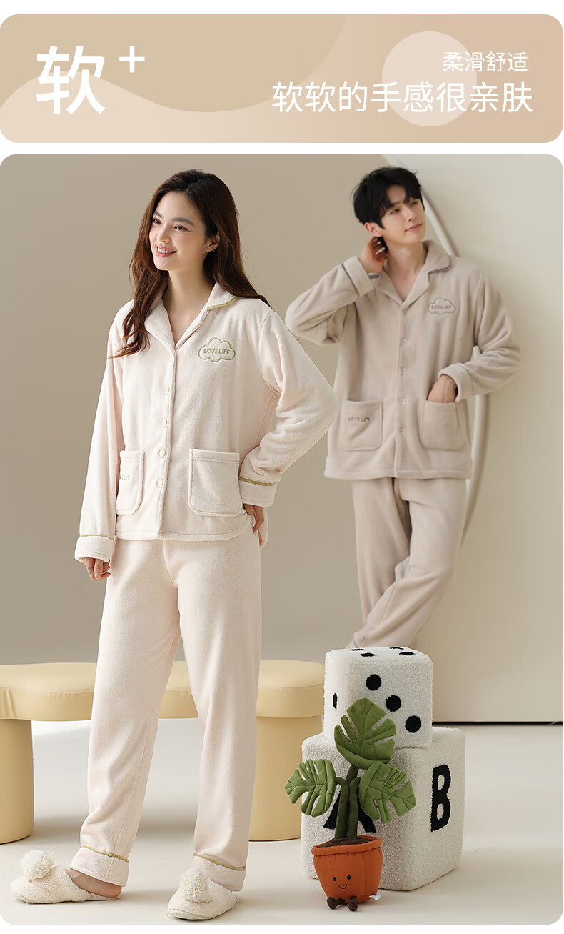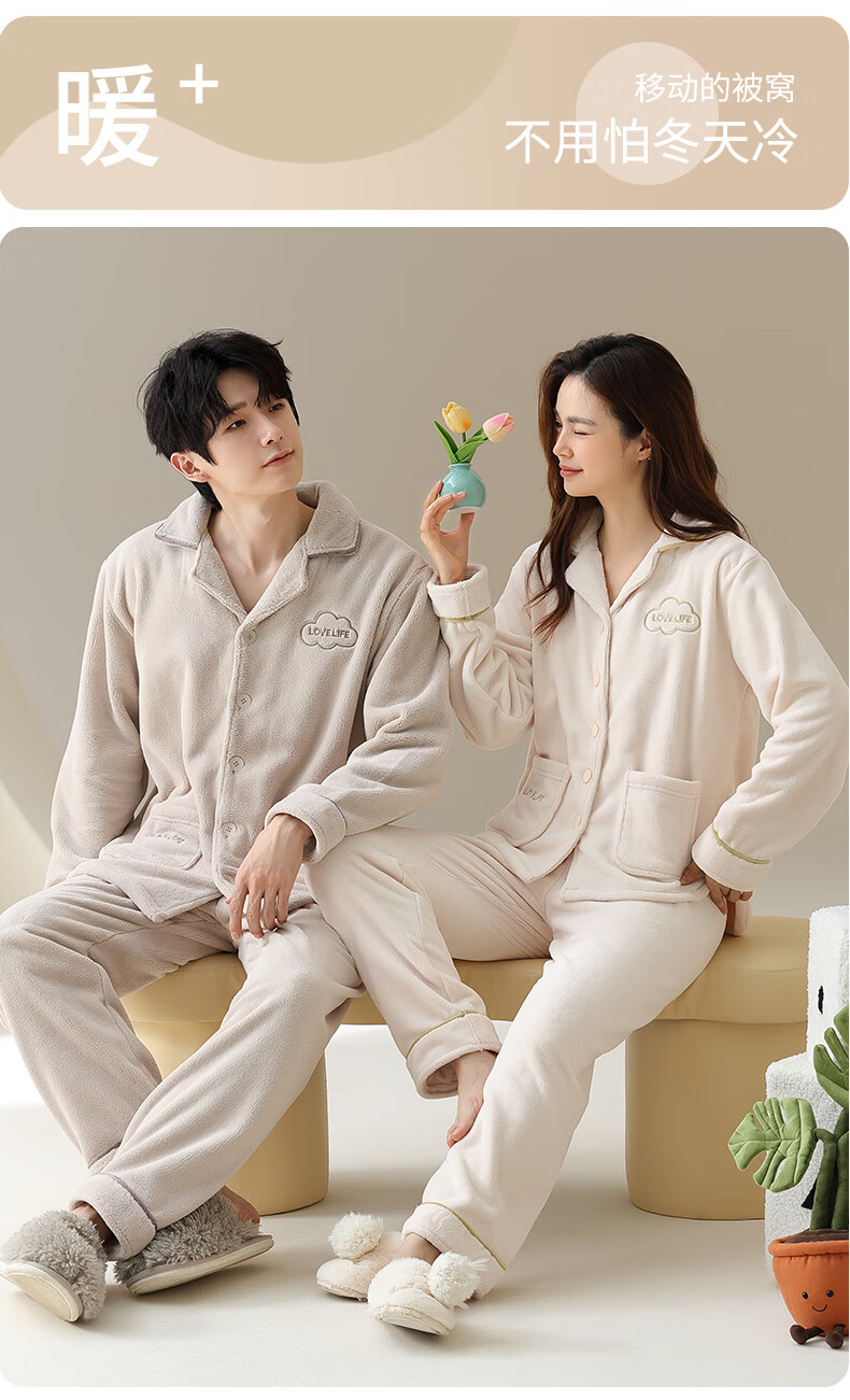 Congxin two sets of soft flannel couple pajamas for autumn and winter, thickened and velvet to keep warm, 25 years new men's and women's home clothes G 64956 light apricot + 75956 rice apricot L male + female M