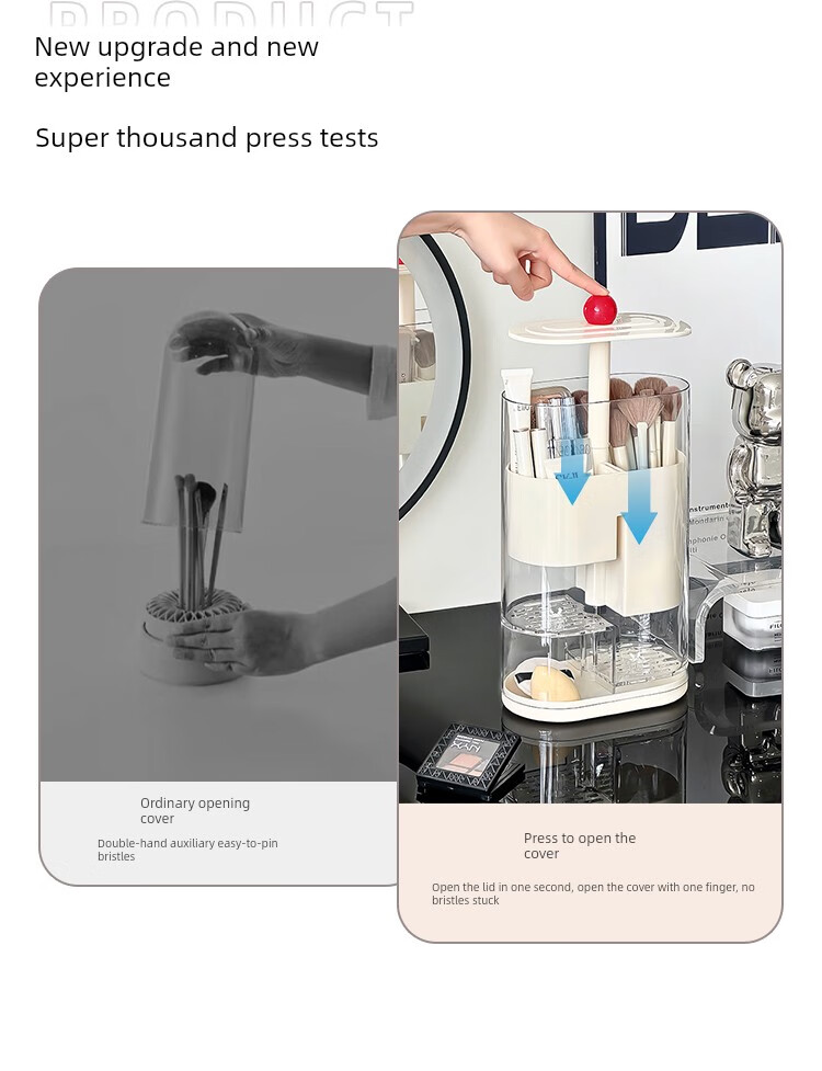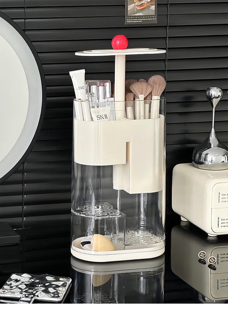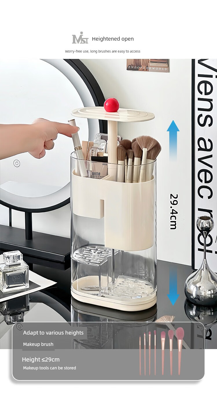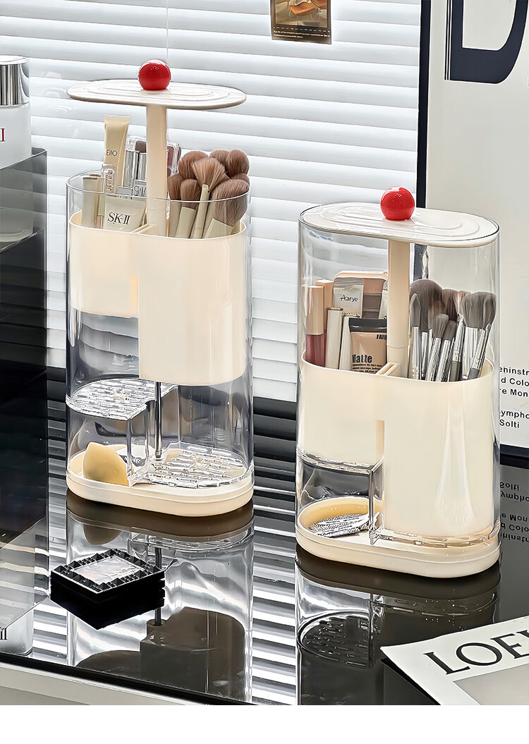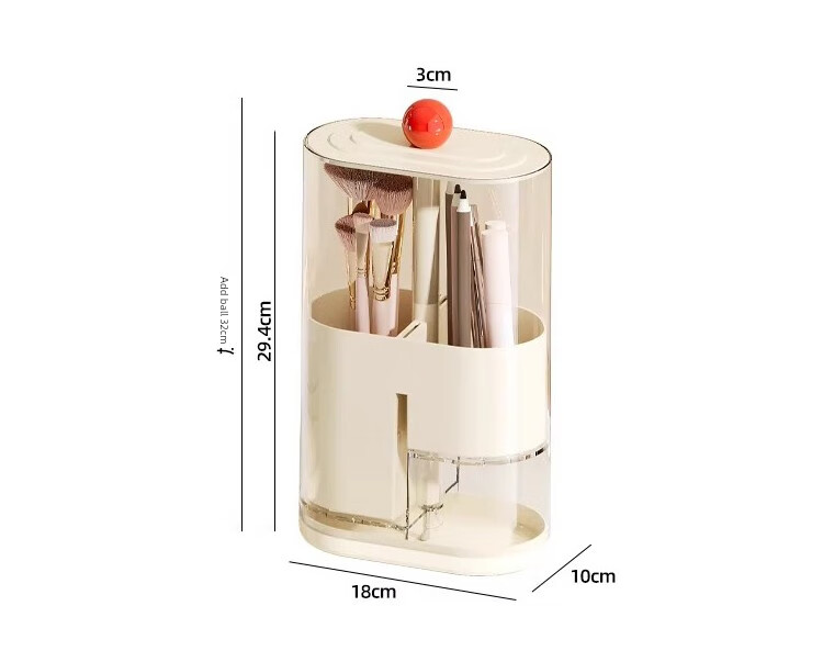 Pressure makeup brush storage tube, automatic adjustable dust-proof dressing table desktop cosmetics storage box, eyebrow pencil brush barrel, cream color, thickened, large capacity