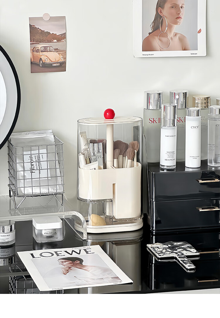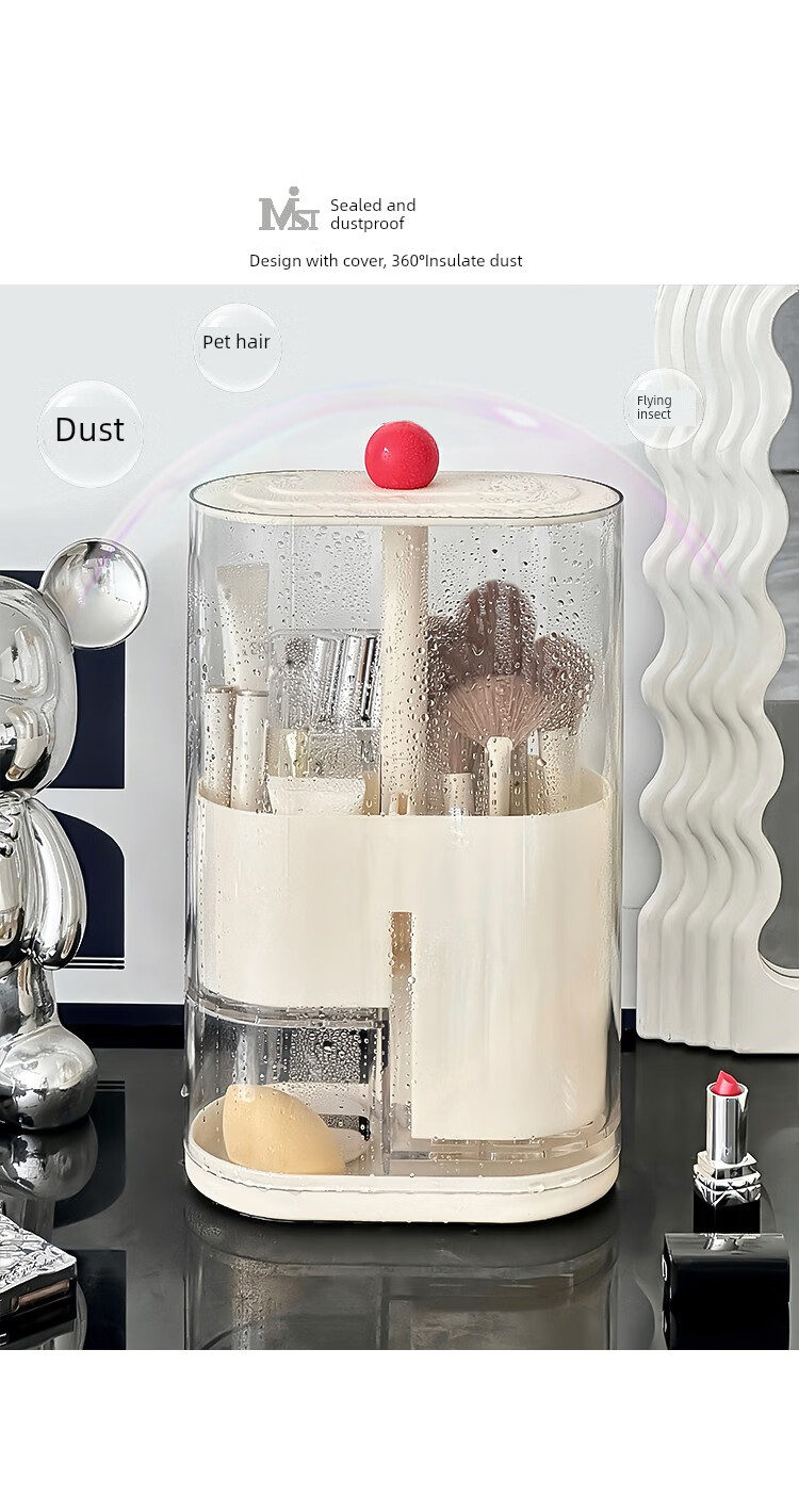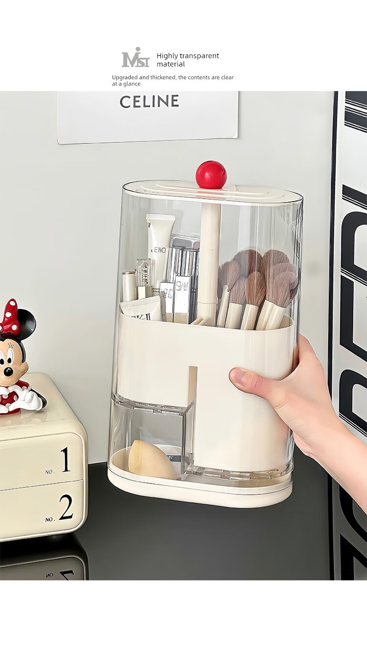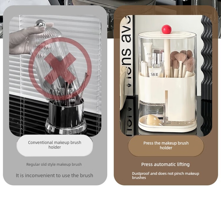Pressure makeup brush storage tube, automatic adjustable dust-proof dressing table desktop cosmetics storage box, eyebrow pencil brush barrel, cream color, thickened, large capacity