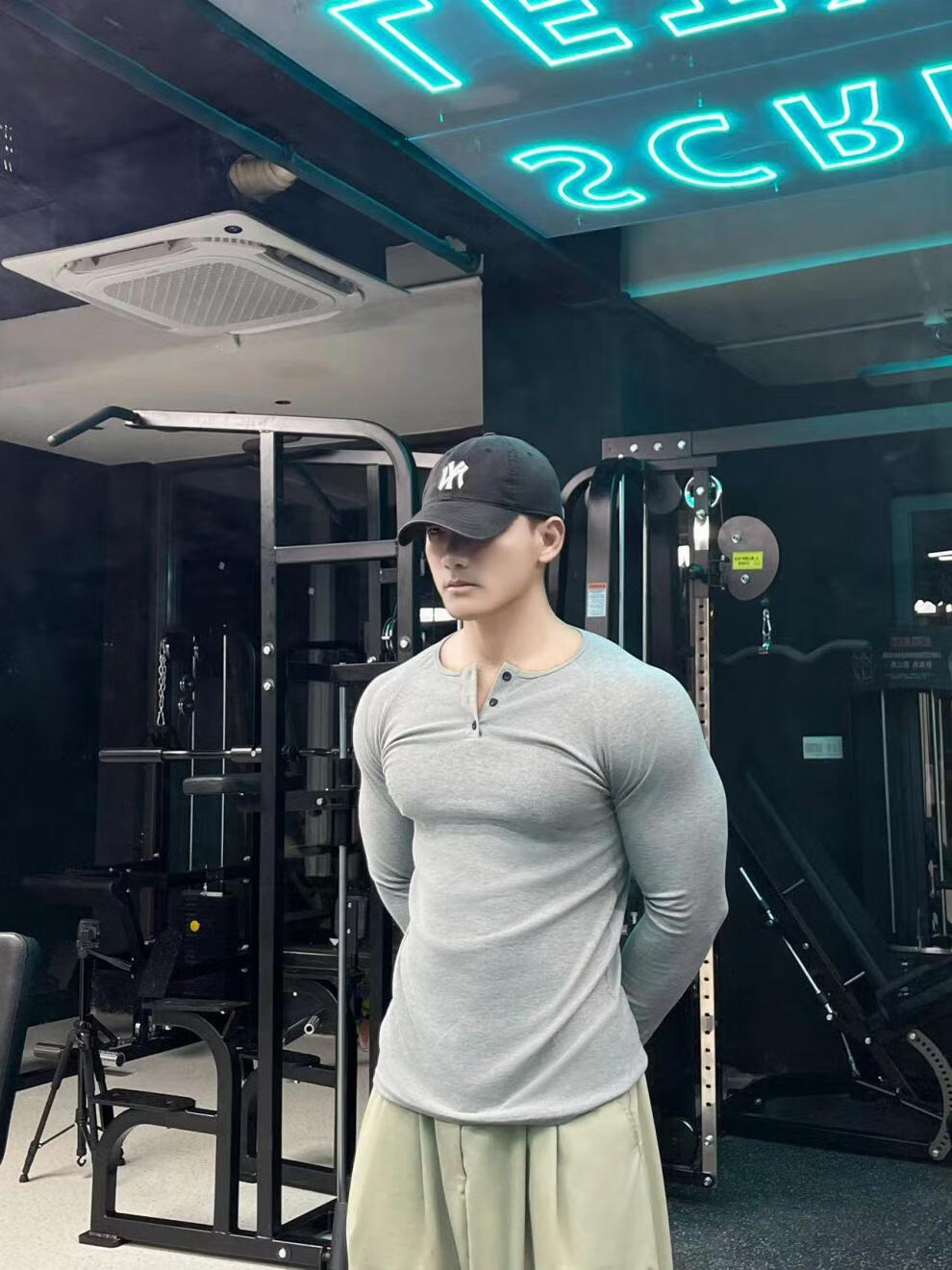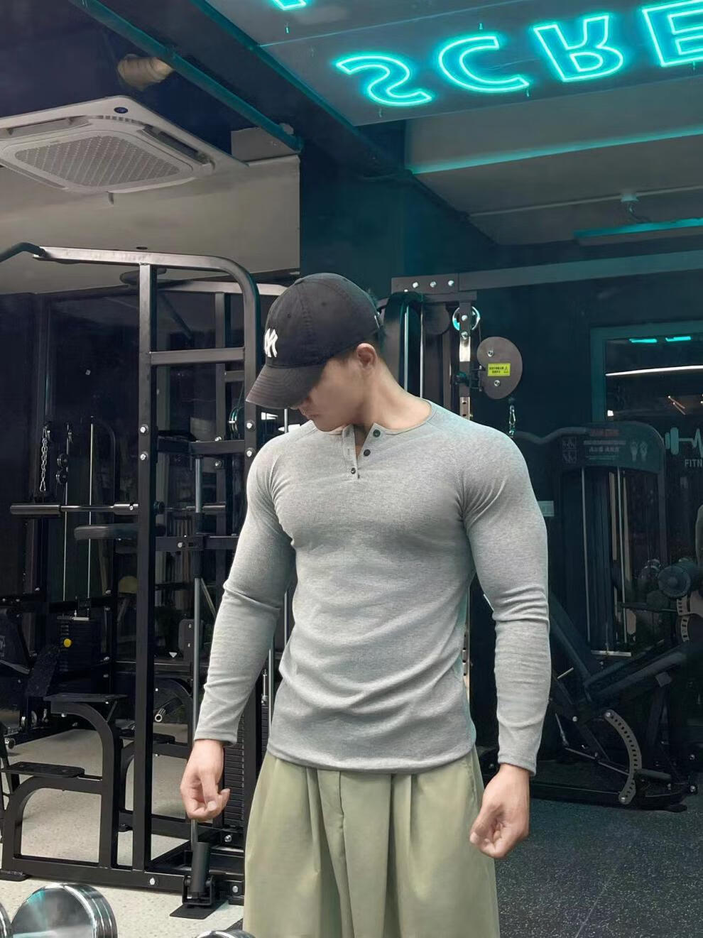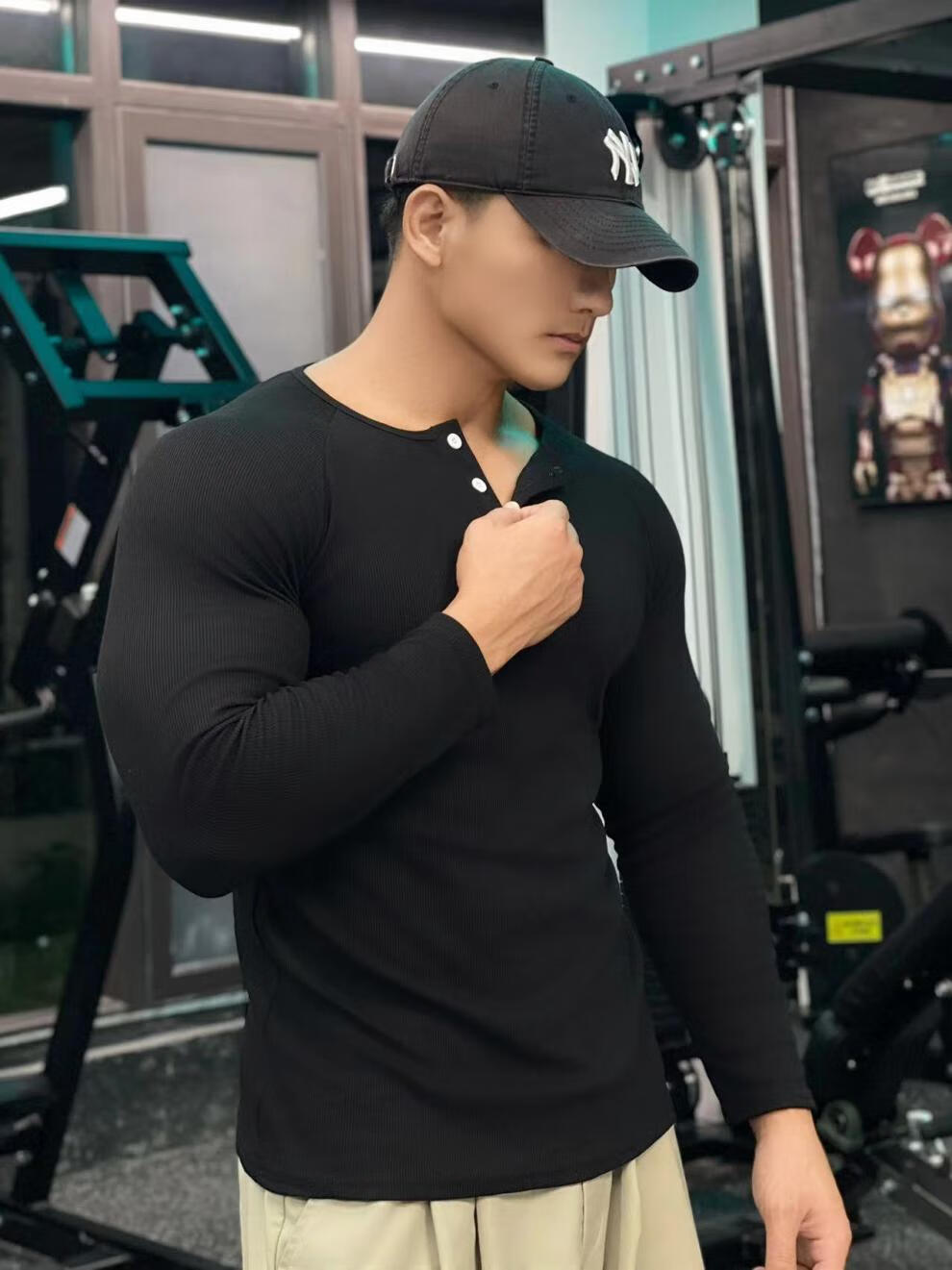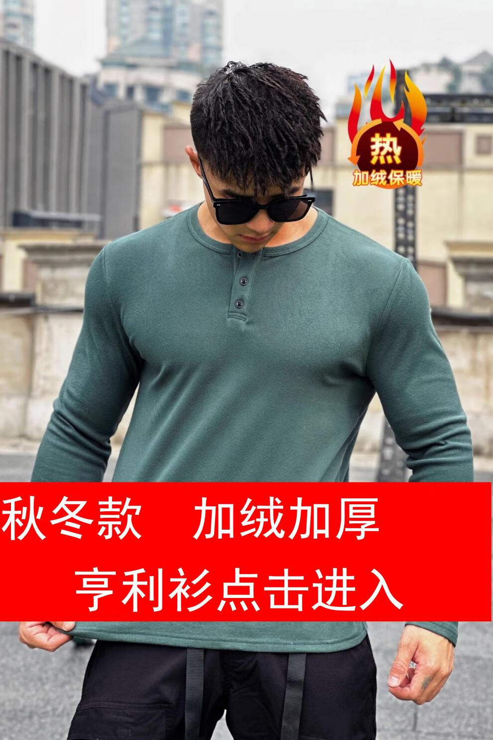 Chuangjingyi chooses fitness long-sleeved American Henry shirt long-sleeved threaded cotton retro men's tough guy raglan fitness show big Henry collar T Henry short-sleeved (black) M suitable for 50-60kg_tight slim fit