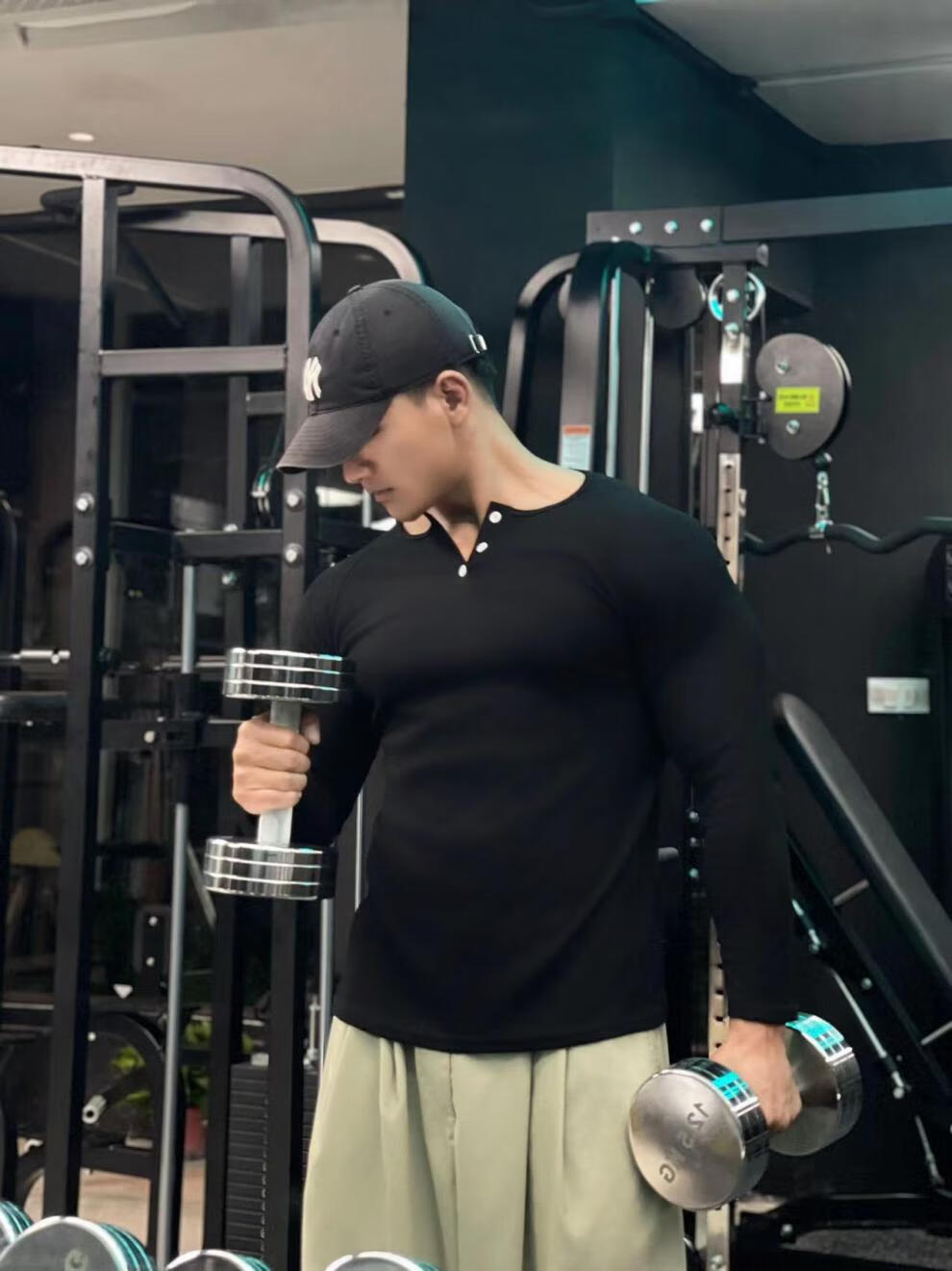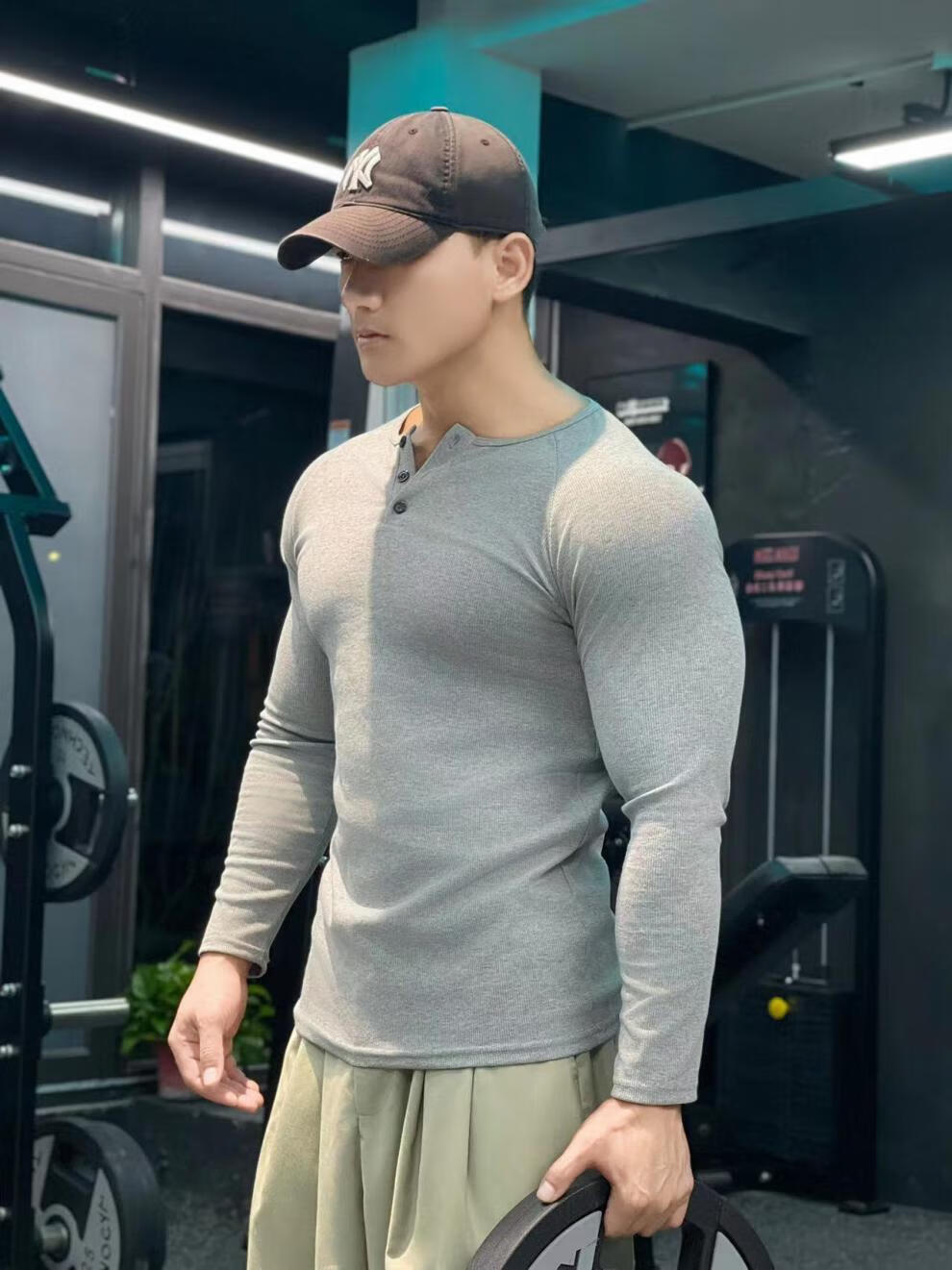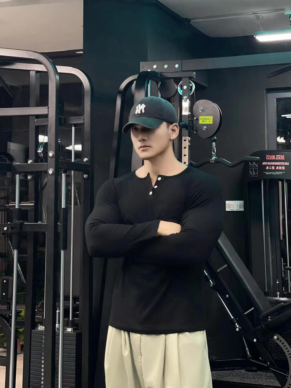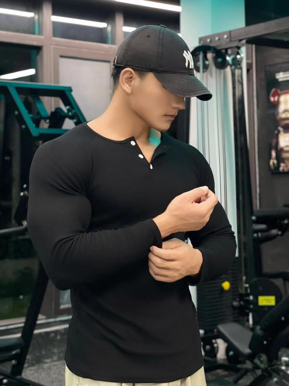 Chuangjingyi chooses fitness long-sleeved American Henry shirt long-sleeved threaded cotton retro men's tough guy raglan fitness show big Henry collar T Henry short-sleeved (black) M suitable for 50-60kg_tight slim fit