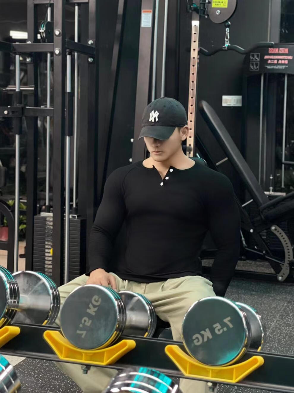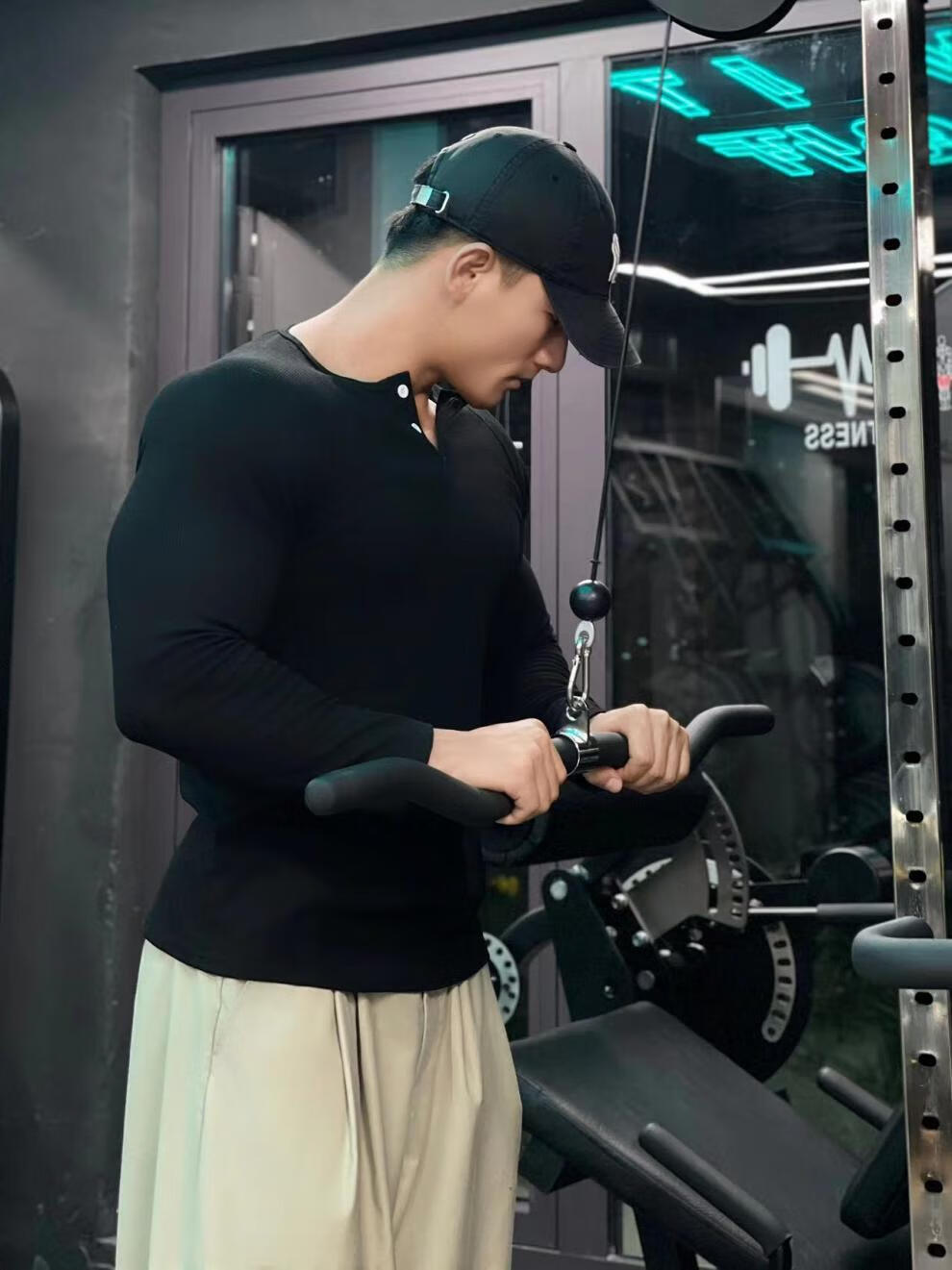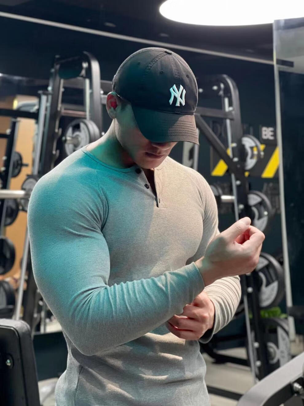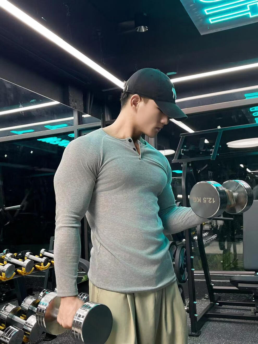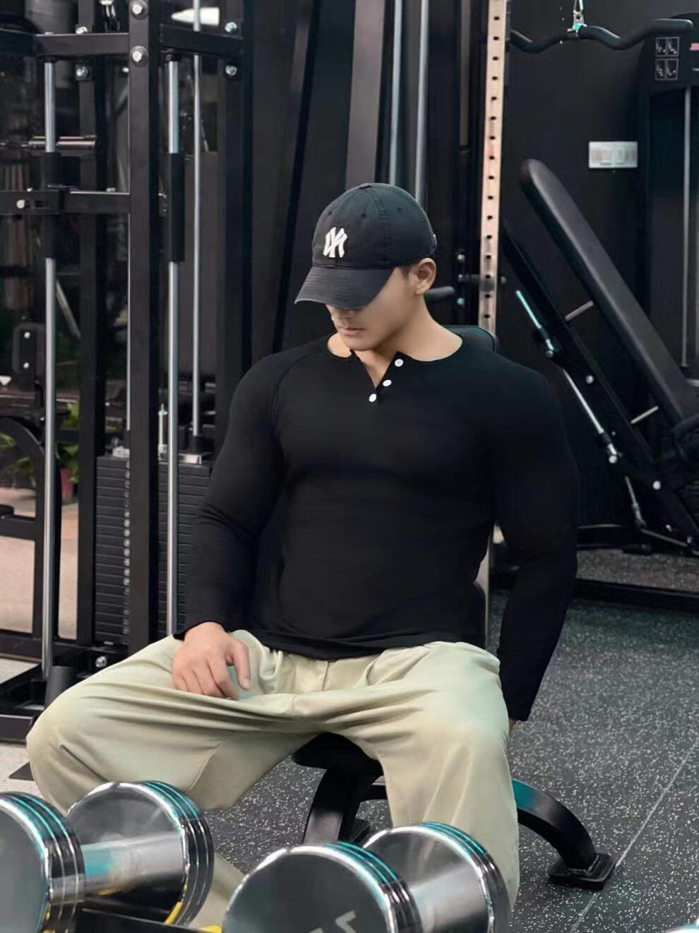 Chuangjingyi chooses fitness long-sleeved American Henry shirt long-sleeved threaded cotton retro men's tough guy raglan fitness show big Henry collar T Henry short-sleeved (black) M suitable for 50-60kg_tight slim fit