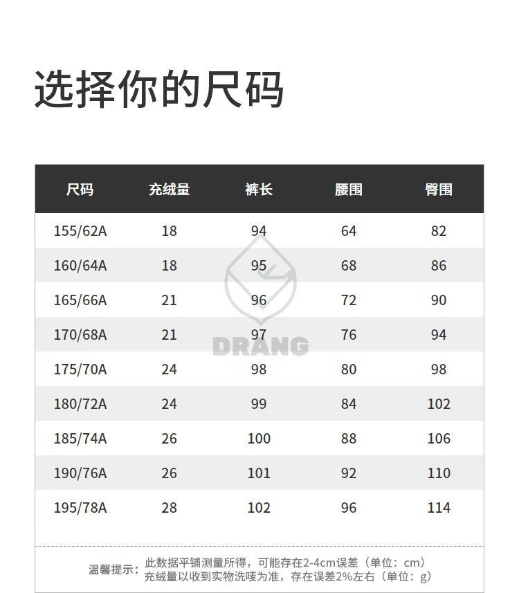 China (cm) 165 / 88-90 170 / 96-98 175 / 108-110 180 / 118-122 185 / 126-130