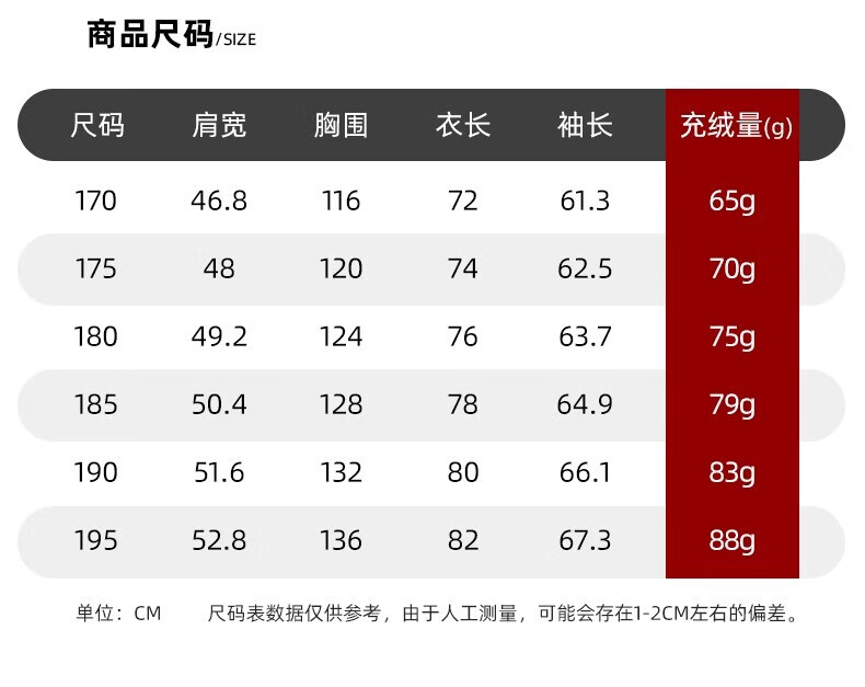 China (cm) 165 / 88-90 170 / 96-98 175 / 108-110 180 / 118-122 185 / 126-130