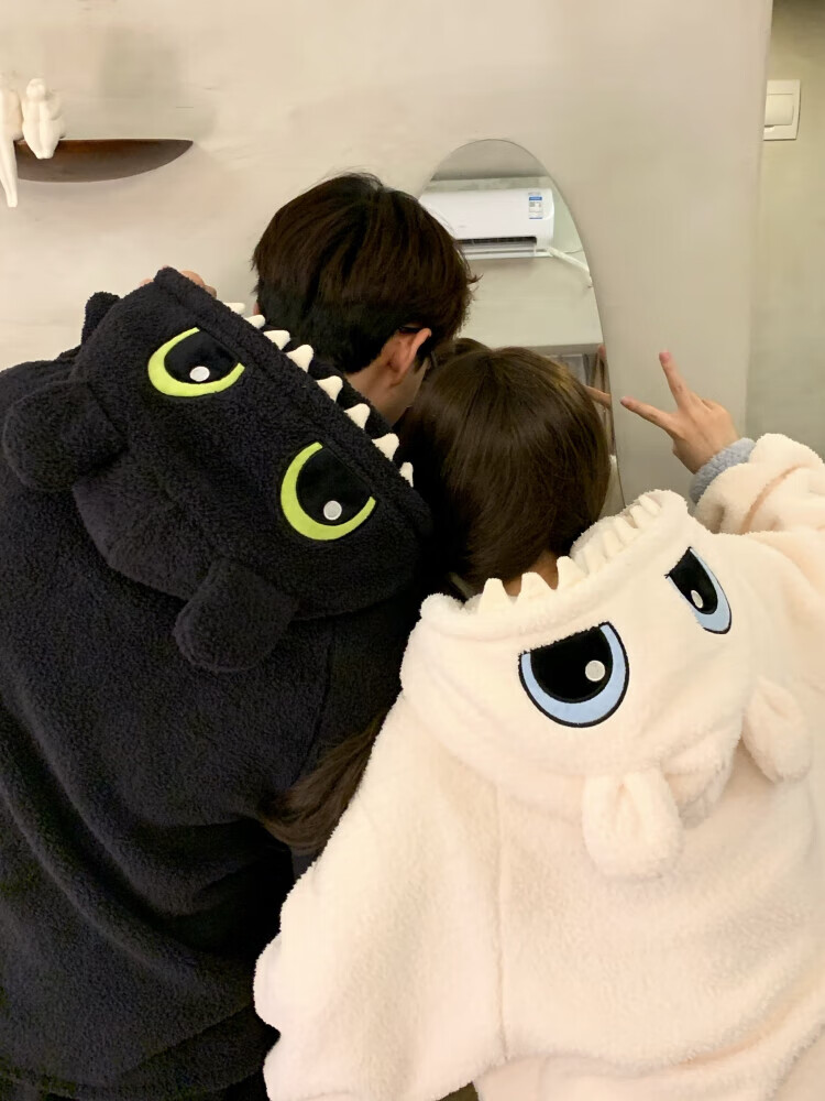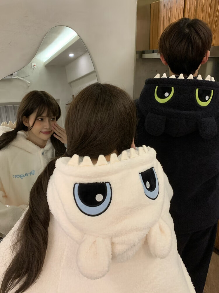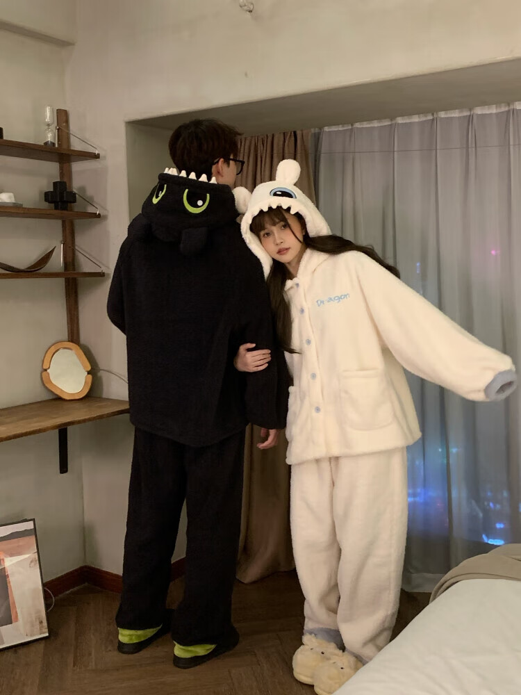 Couple pajamas winter plus velvet cartoon couple pajamas coral velvet winter one man and one woman thickened plus velvet hooded winter Toothless black and gray hooded top + pants single set 2XL male 155-180Jin Jin is equal to 0.5 kg