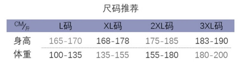 China (cm) 165 / 88-90 170 / 96-98 175 / 108-110 180 / 118-122 185 / 126-130